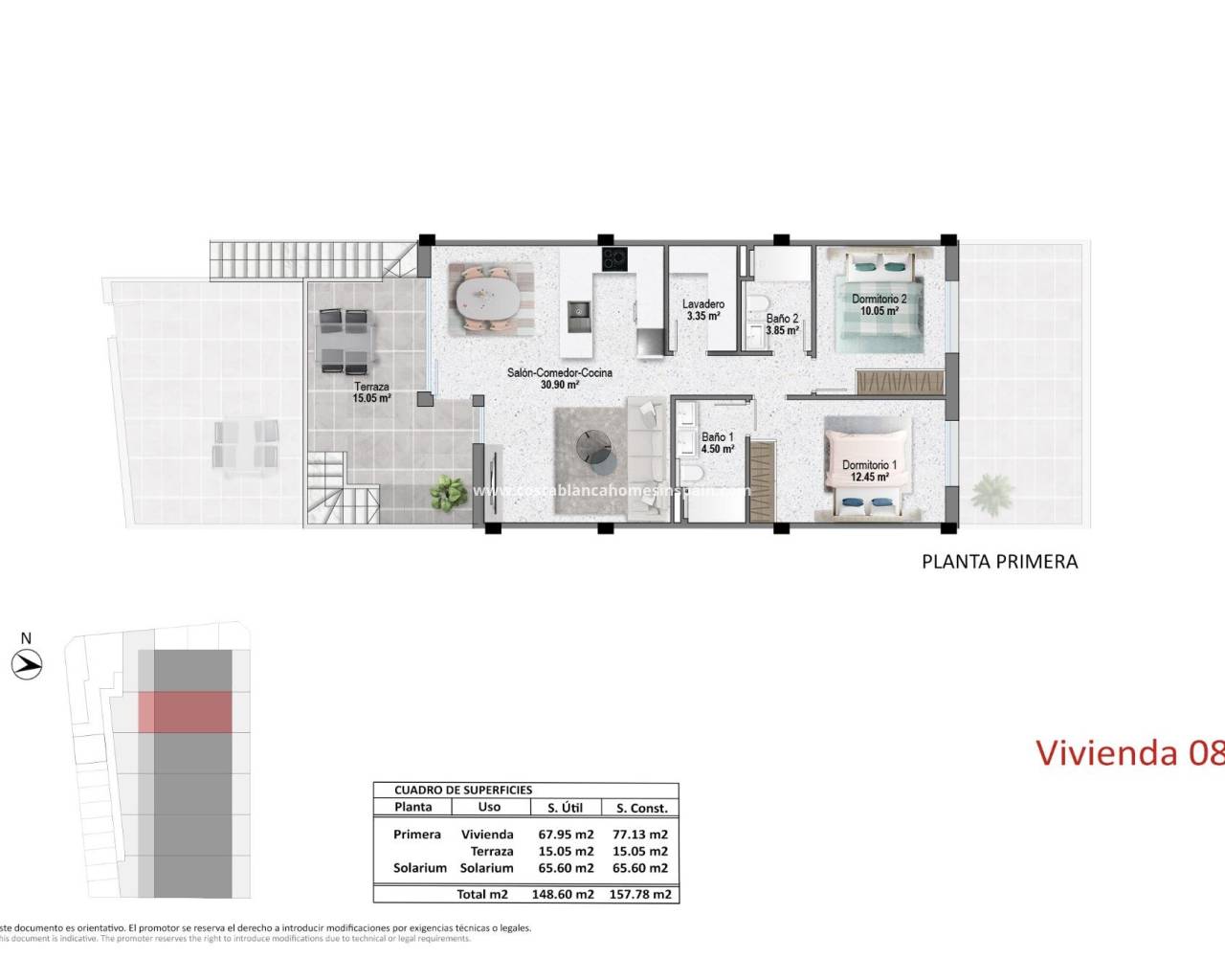 Bungalows neufs à Pilar de la Horadada Près de la plage et du centre-ville Une vie contemporaine au cœur de la Costa Blanca Bienvenue dans un complexe résidentiel de 12 bungalows neufs situé à Pilar de la Horadada, une ville côtière animée à l'extrémité sud de la Costa Blanca. Cet emplacement privilégié offre le mélange parfait entre la tranquillité de la vie méditerranéenne et la commodité, avec tous les services essentiels, magasins, restaurants et commodités accessibles à pied. Les magnifiques plages de sable de Torre de la Horadada et Mil Palmeras sont à seulement 3 km, idéales pour des journées de détente à la plage ou pour pratiquer des sports nautiques. Choix de bungalows au rez-de-chaussée ou au dernier étage Ce développement exclusif propose deux types de maisons modernes adaptées à votre style de vie : Des bungalows au rez-de-chaussée avec 3 chambres, 2 salles de bains et de grandes terrasses privées à l'avant et à l'arrière avec accès direct à la piscine et aux jardins communs. Les bungalows du dernier étage disposent de 2 chambres, de 2 salles de bain et d'un vaste solarium privé sur le toit, avec une cuisine d'été, une pergola et des toilettes pour invités. Toutes les maisons disposent d'espaces de vie lumineux et ouverts, de cuisines entièrement équipées, de la climatisation par conduits et d'un parking privé. Les chambres sont équipées d'armoires encastrées et les salles de bains bénéficient d'un chauffage par le sol pour plus de confort. Des équipements haut de gamme pour une vie méditerranéenne moderne Les maisons sont conçues avec des finitions de haute qualité et des caractéristiques pratiques, notamment : Porte d'entrée blindée avec finition en aluminium Volets électriques dans le salon et les chambres Système d'eau chaude aérothermique Appareils de cuisine BALAY ou équivalent Solariums sur le toit avec gazon artificiel, douche extérieure, éclairage et cuisine d'été complète avec lave-vaisselle, petit réfrigérateur, plaque à induction et hotte aspirante. Emplacement stratégique avec une excellente connectivité Pilar de la Horadada est bien relié aux principaux points d'intérêt de la Costa Blanca et de la Costa Cálida : Plages (Torre de la Horadada / Mil Palmeras) - 3 km Parcours de golf Lo Romero - 6 km Aéroport de Corvera (Murcie) - 40 km Aéroport d'Alicante - 55 km Centre commercial Zenia Boulevard - 14 km Port de plaisance de San Pedro del Pinatar – 11 km Votre maison idéale au soleil Que vous soyez à la recherche d'une escapade de vacances, d'une résidence à l'année ou d'un investissement locatif, ces bungalows à Pilar de la Horadada offrent un excellent rapport qualité-prix dans l'une des villes les plus prisées de la Costa Blanca. Contactez-nous dès aujourd'hui pour organiser une visite ou demander plus d'informations !