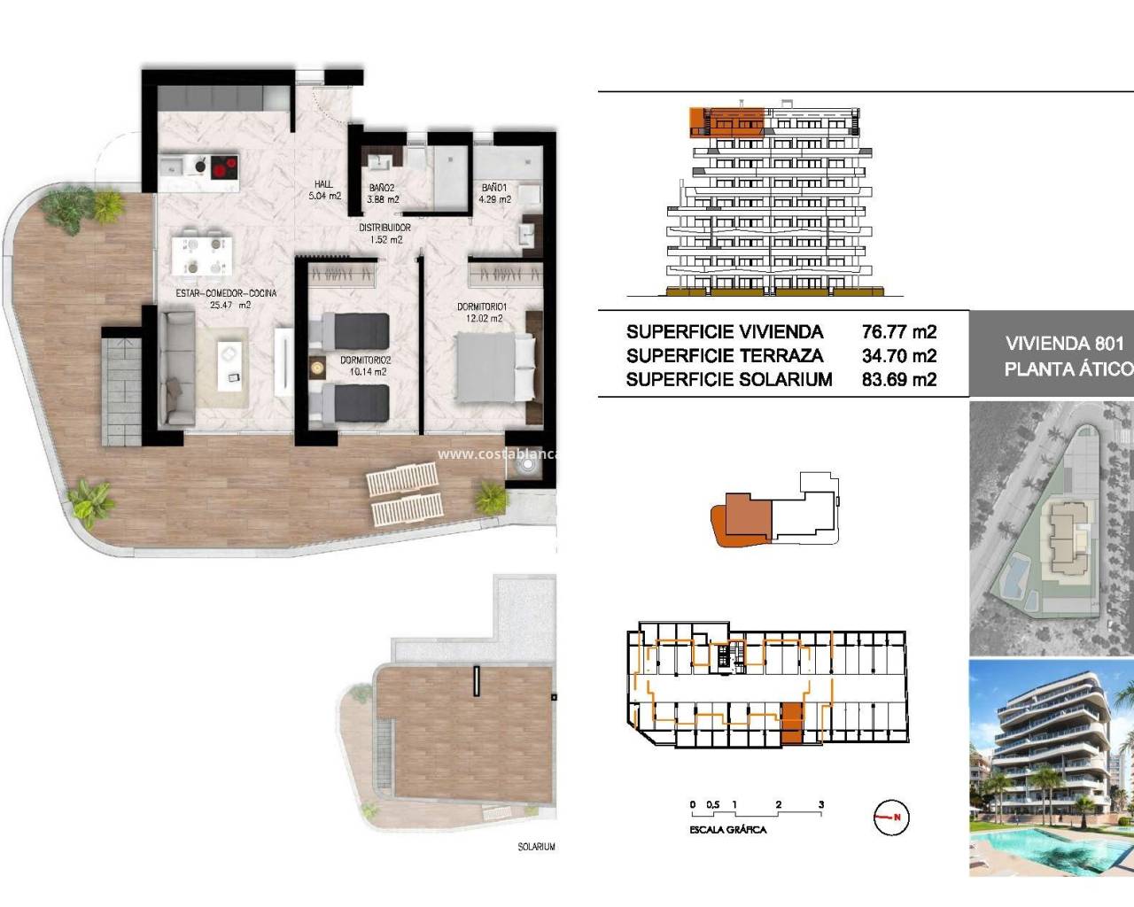 NOUVELLE CONSTRUCTION RÉSIDENTIELLE À GUARDAMAR DEL SEGURA Nouvelle construction résidentielle située en face de la rivière Segura et à proximité de la marina et de la plage de Guardamar. Immeuble de style moderne de 31 appartements avec 2 chambres à coucher et penthouses avec 2 et 3 chambres à coucher, tous avec 2 salles de bains, cuisine ouverte avec salon, armoires équipées, terrasses spacieuses à partir de 20m², parking souterrain et salle de stockage fermée. Le bâtiment comprendra 9 étages, dont les plus élevés seront des penthouses avec terrasse principale et solarium privé. Guardamar del Segura est une ville située au sud de la Costa Blanca. Avec ses 11 kilomètres de plage naturelle et sa grande forêt de pins, Guardamar est une ville tranquille où il fait bon vivre. Guardamar est une ville tranquille où il fait bon vivre, elle dispose de tous les services tout au long de l'année tels que des restaurants, des bars, des magasins, des banques, des lieux de loisirs, etc. Tous les mercredis, dans les rues centrales de la ville, un marché est organisé où de nombreuses personnes se rendent pour acheter des produits tels que des aliments, des vêtements, des meubles, des animaux, etc. C'est une grande revendication et les habitants de la ville environnante viennent à Guardamar tous les mercredis pour visiter le marché. Guardamar del Segura dispose d'un grand port avec des activités tout au long de l'année, d'un grand centre sportif avec du paddle, du tennis, du football et une grande piscine chauffée qui fonctionne toute l'année. Il dispose également d'une bibliothèque avec wifi gratuit et ordinateurs. Guardamar del Segura se trouve à seulement 20 km de l'aéroport Alicante - Elche (El Altet), où de nombreux vols sont effectués chaque jour en direction des principales villes européennes, en raison de la demande touristique sur la Costa Blanca.