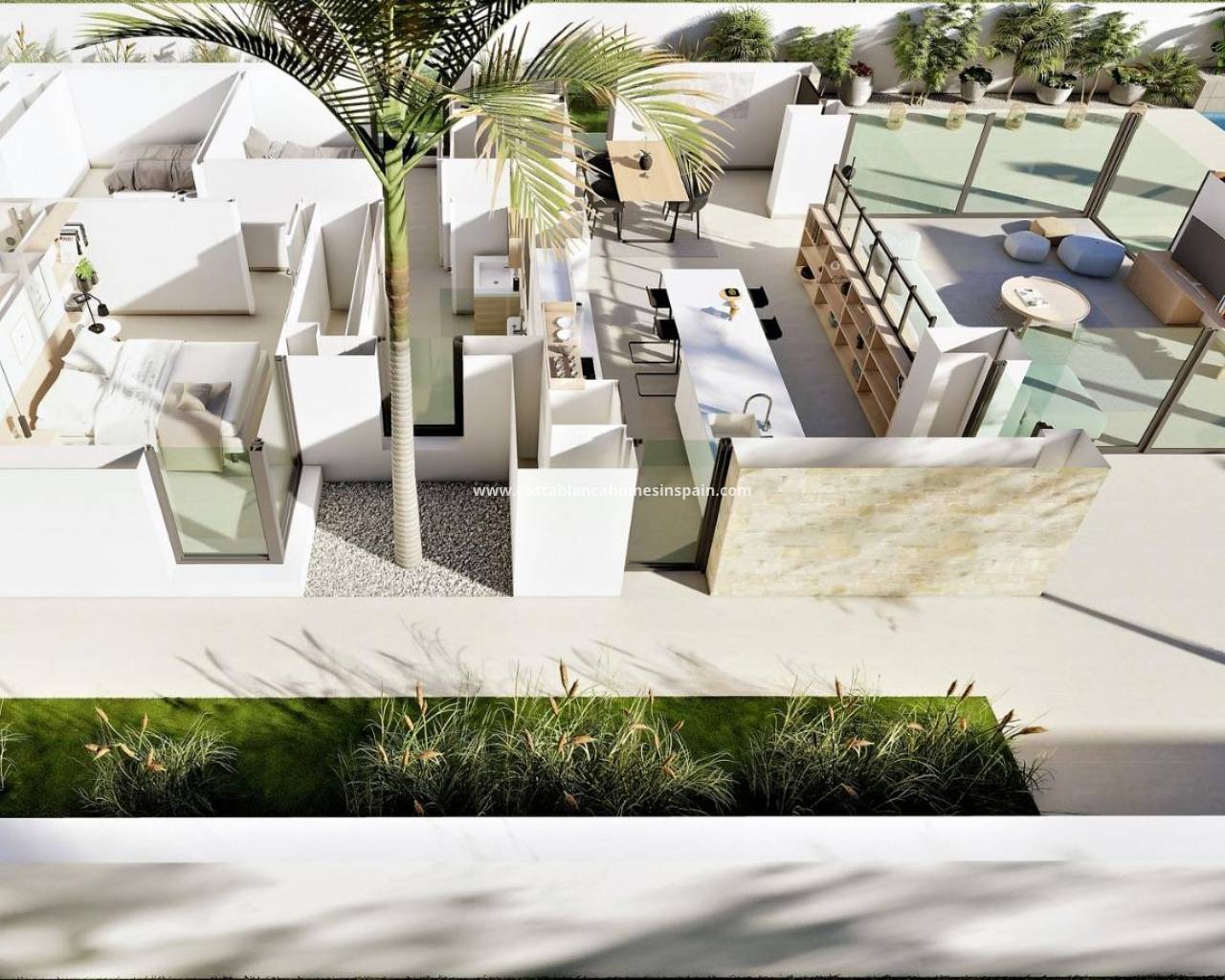 VILLAS NEUVES A SAN FULGENCIO Villas neuves à San Fulgencio, à seulement 5 km de la plage. Les villas offrent 3 chambres, 2 salles de bains et une cuisine spacieuse, une salle à manger, un salon, une piscine avec cascade et deux piscines : une piscine de 1,95x2,60 m et 0,6 m de profondeur, et une piscine de 5,60x2,60 m, entre 1 et 1,5 m de profondeur variable. Un grand porche orienté au sud permet la continuité du salon avec l'extérieur, s'ouvrant sur un espace extérieur moderne et fonctionnel où l'on peut profiter de la piscine privée, du barbecue, du chillout et du grand jardin qui l'entoure. Les lignes simples et claires du mobilier contribuent à son intégration au reste de la maison. Les détails en bois ajoutent de la chaleur à l'atmosphère. Les salles de bains, où les couleurs sont combinées à des tons naturels et chauds, créent une atmosphère chaleureuse qui, associée à la relation directe avec l'extérieur, vous permet de vous connecter à la nature et d'atteindre de grands moments de détente. La chambre principale dispose d'un patio privé qui, avec la lumière qui pénètre par les fenêtres, crée une atmosphère relaxante, parfaite pour le repos et la détente. San Fulgencio est un village agréable avec plusieurs restaurants et magasins. Il est très bien situé, à proximité des fantastiques plages de La Marina et de la ville de Guardamar, légèrement plus grande. La ville de San Fulgencio est située à environ 30 minutes de l'aéroport d'Alicante-Elche, à 6 km du terrain de golf le plus proche et à seulement 5 km de la plage la plus proche.