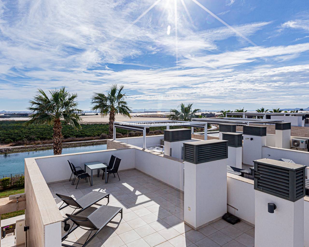 Bungalow au dernier étage situé dans le parcours de golf Lo Romeo. Situé dans l'enceinte du parcours de golf dans une résidence fermée, ce logement au dernier étage dispose d'un solarium avec des vues spectaculaires. La propriété comprend deux chambres et deux salles de bains avec douche (dont une en suite). Orientée sud-est, la propriété est vendue meublée, avec électroménagers et climatisation centralisée. Le bungalow dispose d'une terrasse de plus de 60 m2 où vous pouvez profiter du soleil toute l'année. Le complexe résidentiel fermé comprend un parking et une piscine commune pour tous les résidents. La communauté est ornée de plantes et d'arbres et dispose de gazon artificiel. N'hésitez pas à nous contacter pour organiser une visite.