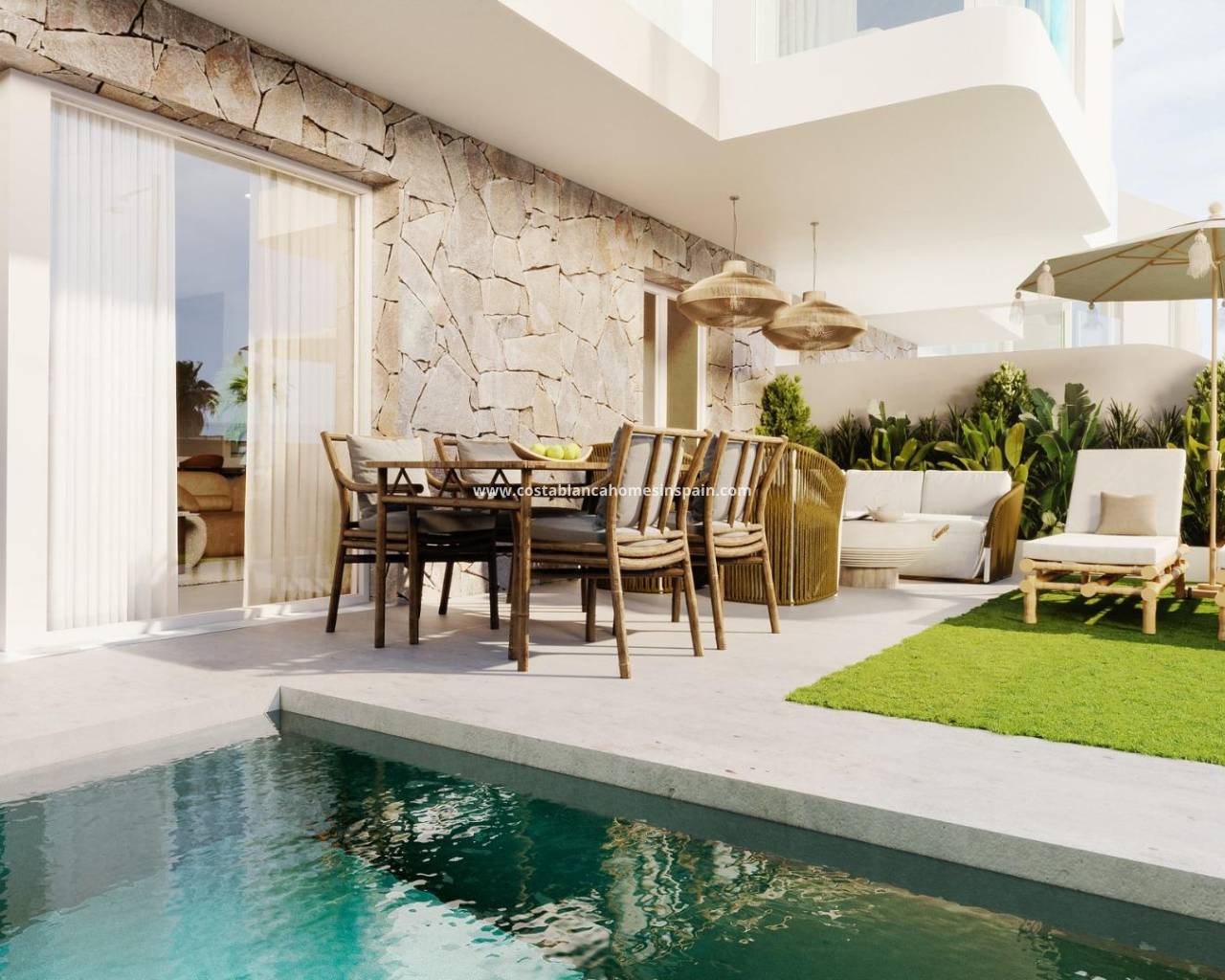 Maisons neuves exclusives en bord de mer à vendre à Mojácar, Costa de Almería Une vie boutique en bord de mer dans l'un des quartiers les plus prisés de Mojácar Découvrez un ensemble résidentiel boutique exceptionnel composé de seulement 10 maisons exclusives situées en bord de mer dans le quartier de La Mena à Mojácar. Cet emplacement privilégié offre un accès direct, via le Paseo del Mediterraneo, aux plages de sable doré et aux eaux cristallines de la mer Méditerranée. Entouré de clubs de plage, de restaurants et d'une atmosphère côtière paisible, ce quartier est idéal pour ceux qui recherchent un style de vie raffiné en bord de mer. Mojácar Playa et le Parador de Mojácar se trouvent à seulement 3 km, offrant un large éventail de services, de divertissements et de beautés naturelles. Des maisons élégantes conçues pour le confort et la vue sur la mer Ce projet immobilier unique propose des propriétés de trois chambres et trois salles de bains disponibles en deux configurations. Les acheteurs peuvent choisir entre quatre maisons de ville avec solarium privé et jacuzzi en option, ou six villas jumelées avec chacune leur propre piscine privée. Toutes les maisons comprennent un grand garage en sous-sol pour deux voitures, des terrasses spacieuses et de grands jardins qui maximisent le plaisir de l'extérieur et la vue sur la mer. Spécifications de haute qualité et options de personnalisation Chaque propriété est équipée d'un système de climatisation aérothermique entièrement installé, garantissant une efficacité énergétique et un confort maximum tout au long de l'année. Les cuisines sont non meublées, ce qui permet aux propriétaires de personnaliser leur design, avec un projet de décoration complet inclus. Les caractéristiques supplémentaires comprennent la préinstallation pour la technologie domotique, une porte d'entrée renforcée et des matériaux de construction de haute qualité qui améliorent la sécurité, le design et la durabilité. Emplacement privilégié avec une excellente connectivité Situé dans un cadre paisible en bord de mer, le complexe bénéficie d'un accès pratique aux principales destinations de la Costa de Almería. Mojácar Pueblo, avec ses rues pittoresques blanchies à la chaux, n'est qu'à quelques minutes en voiture. Les points d'intérêt populaires comprennent : Mojácar Playa 3 km Parador de Mojácar 3 km Marina de Garrucha 12 km Campo de golf Marina Golf 6 km Aeropuerto de Almería 80 km Aeropuerto de Murcia Corvera 150 km Assurez-vous une maison en première ligne de plage à Mojácar Découvrez un style de vie où la mer fait partie de votre quotidien et où le luxe se mêle à la sérénité du littoral. Que vous recherchiez une résidence secondaire, une résidence permanente ou un investissement exclusif, ce complexe boutique en bord de mer offre une valeur inégalée. Contactez-nous dès aujourd'hui pour obtenir des informations supplémentaires ou organiser une visite.