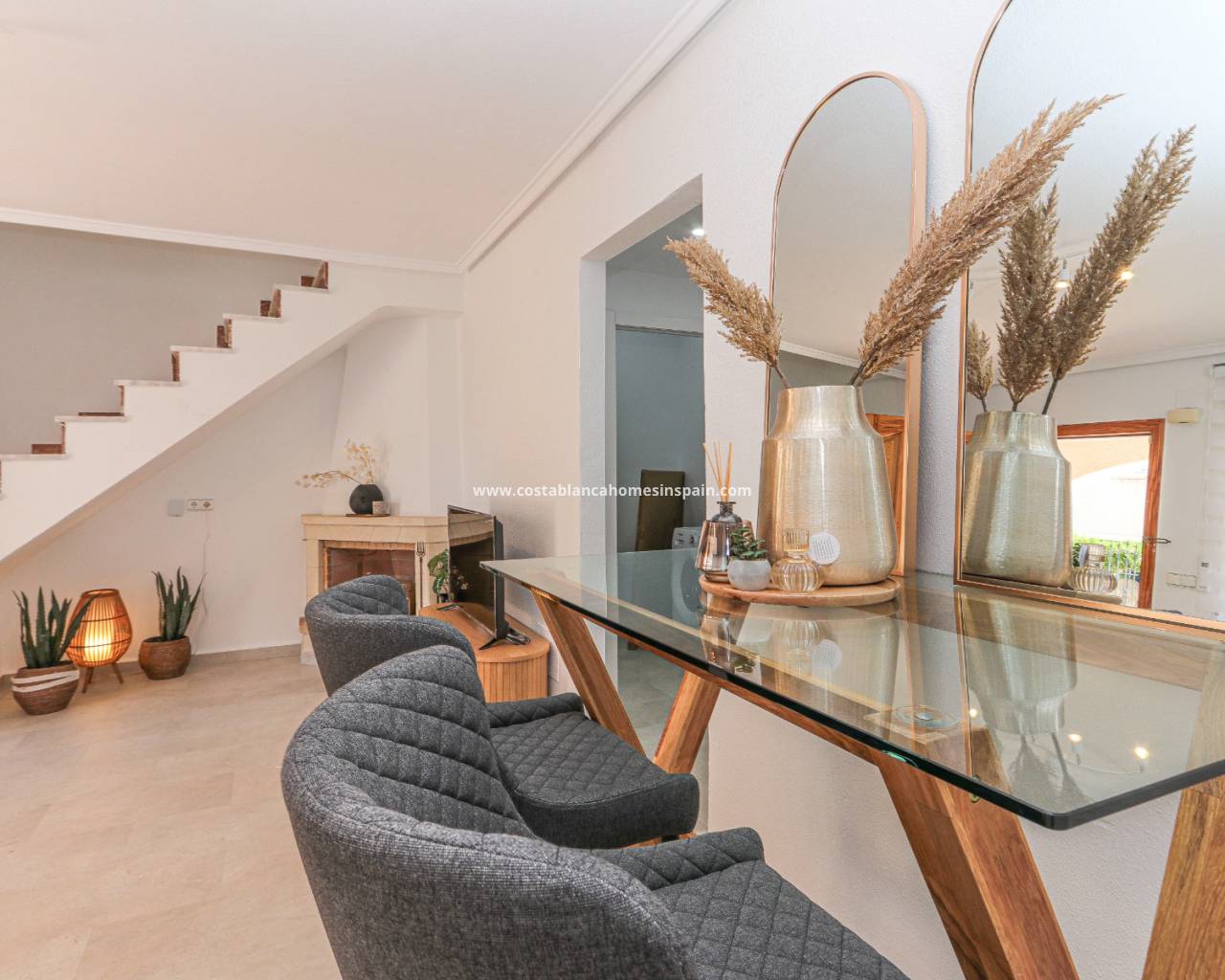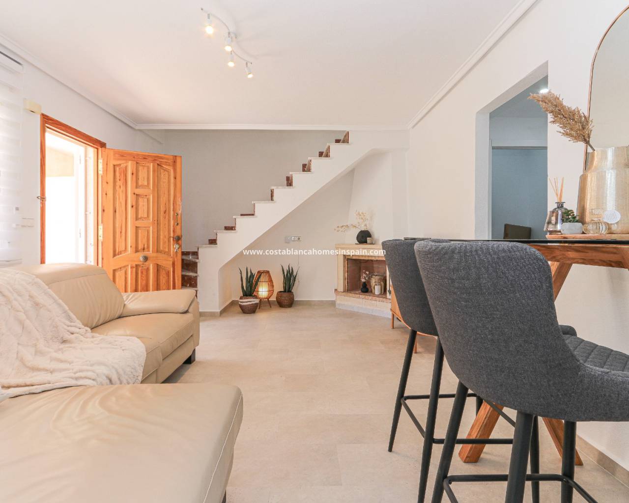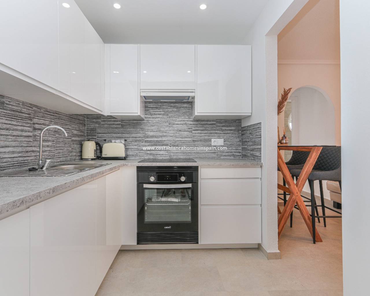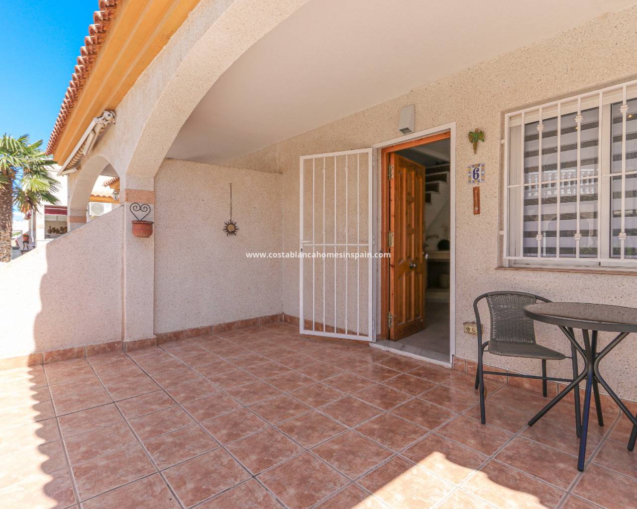 A reformed 2 bedroom house in Playa Flamenca in the desirable gated urbanisation of Iria V. The property has a new independent kitchen with a separate store room to the side, a fully reformed modern bathroom, a large bedroom downstairs and a large master bedroom upstairs. At the top of the stairs is a door leading out to the large terrace, which can also be accessed from the master bedroom. A communal swimming pool is just a short walk away, as are the local amenities of many bars and restaurants.