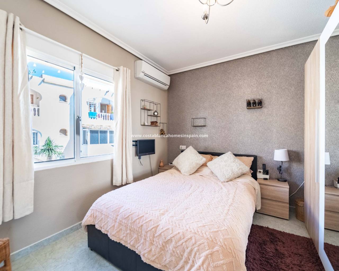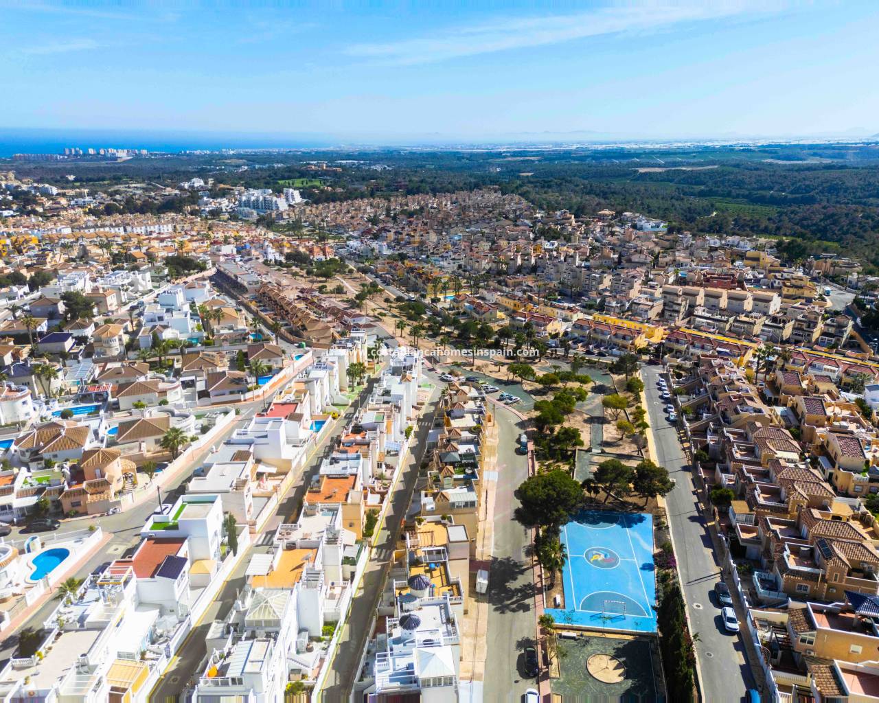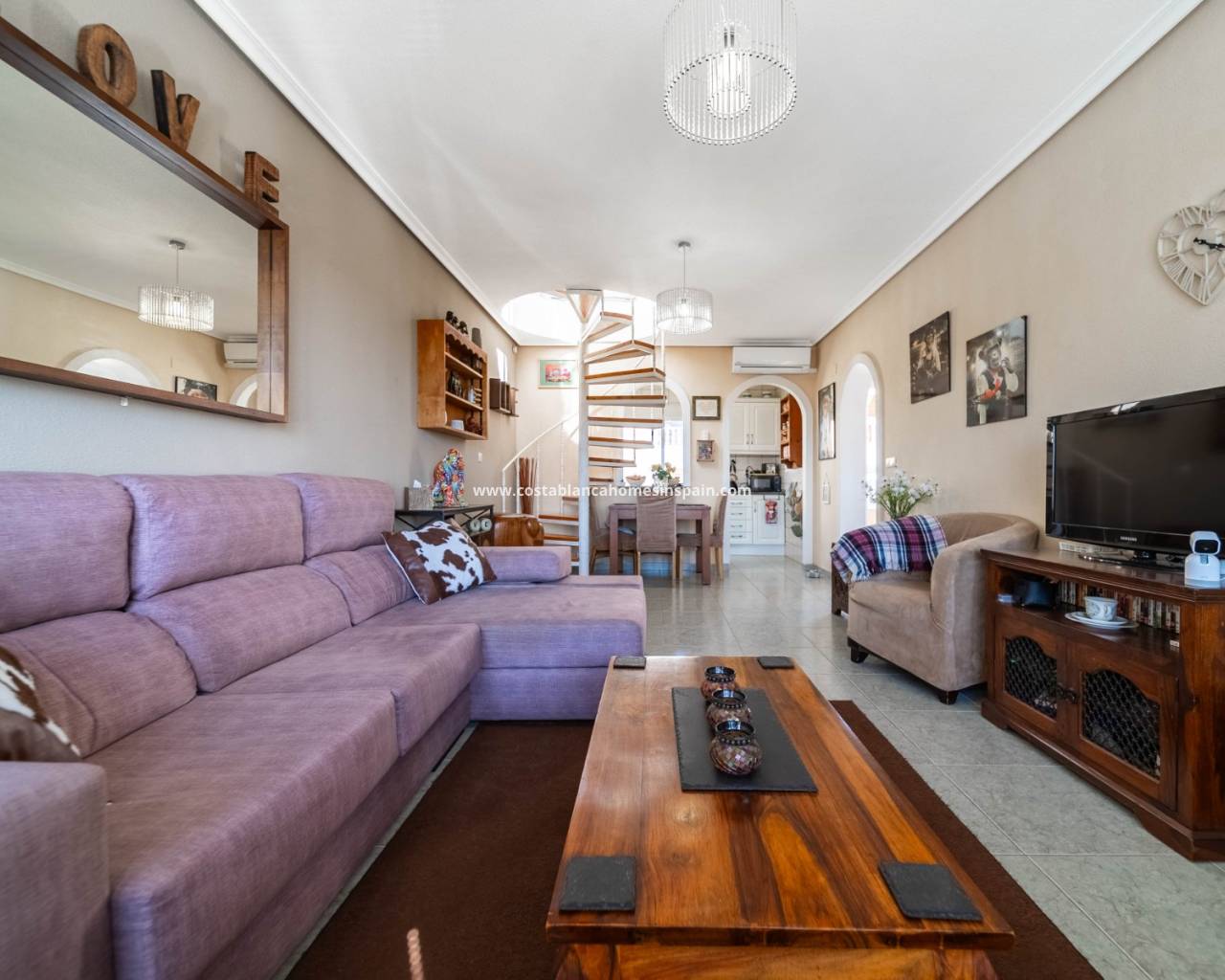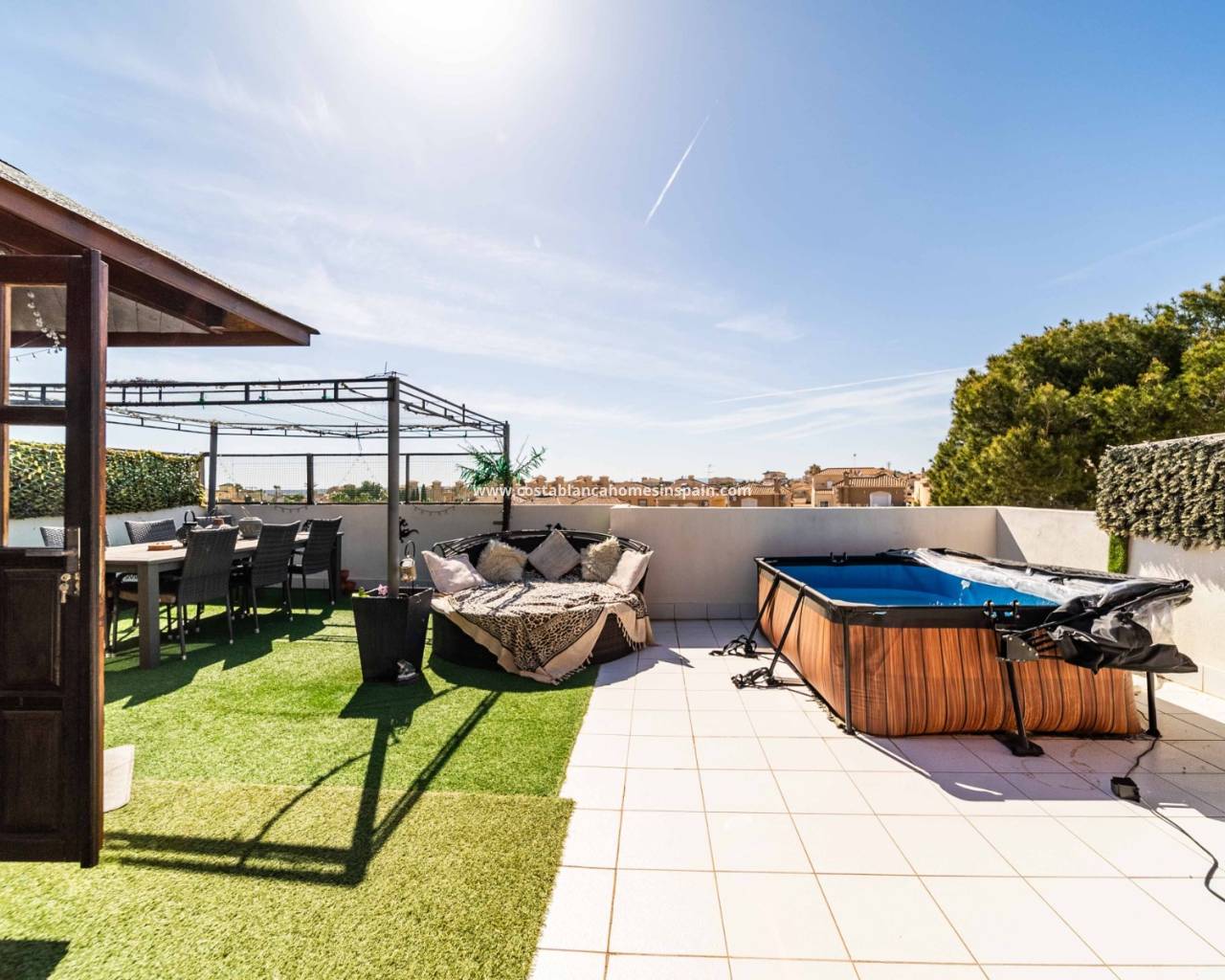 Þessi flekklausa þakíbúð samanstendur af stórri stofu/borðstofu með útsýni yfir græn svæði og íþróttaaðstöðu. Aðskilið eldhús er úr stofu og er fullbúið með hvítum vörum. Tvö stór björtu svefnherbergin með viftu í lofti og loftkælingu, og fjölskyldubaðherbergi eru staðsett til hliðar við stofuna, innri stigar leiða upp í risastóra sólríka ljósabekkinn með töfrandi sumarhúsa setusvæði og þaksundlaug sem hægt er að fjarlægja, fullkomið með víðáttumiklu útsýni. Einnig er óúthlutað bílastæði. Íbúðin er á frábærum stað, í aðeins 10 mínútna göngufjarlægð frá næsta kjörbúð, Mercadona, og La Fuente verslunarmiðstöðinni með frábæru úrvali af börum, veitingastöðum, verslunum og Farmacia. Hinir sívinsælu Las Ramblas og Campoamor golfvellir eru rétt við götuna og ein af stærstu verslunarmiðstöðvum svæðisins, La Zenia Boulevard, er í 10 mínútna akstursfjarlægð. Fallegu bláfánastrendur Orihuela Costa-svæðisins eru einnig í 10 mínútna akstursfjarlægð, en bæði Alicante og Murcia flugvellir eru í 45 mínútna fjarlægð. Þetta er kjörið tækifæri ef þú ert að leita að sumarhúsi á þessu svæði.