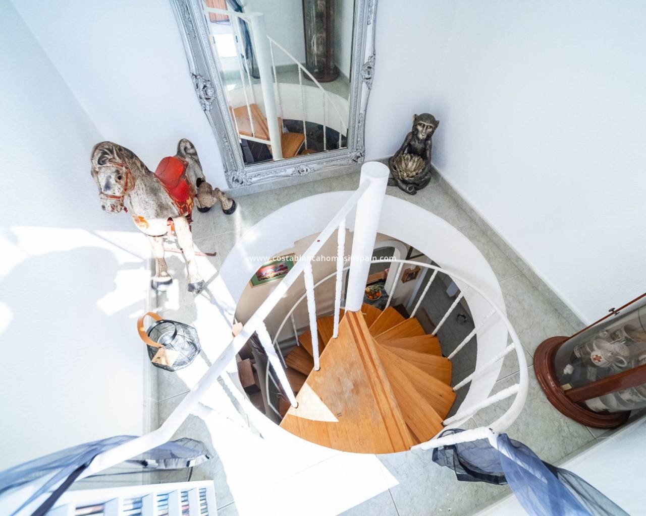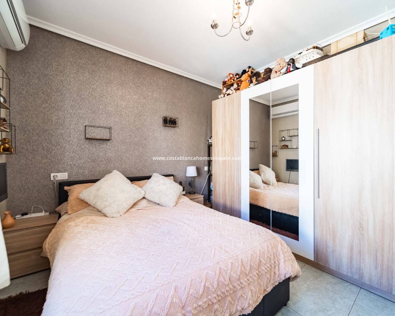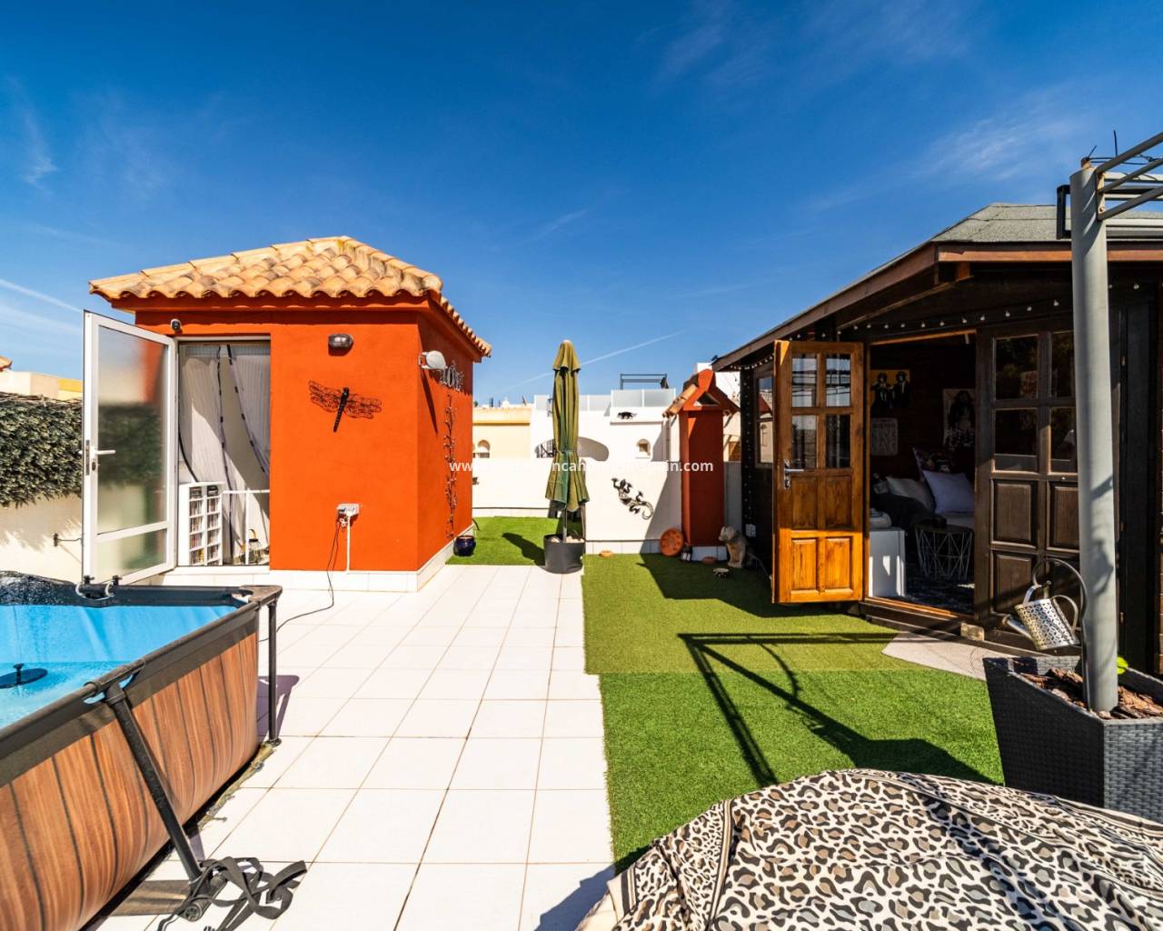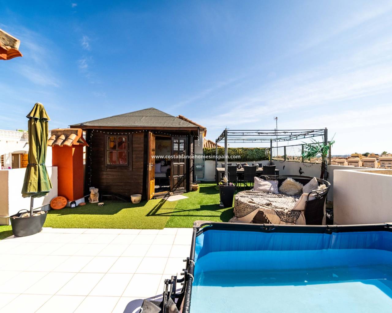 Þessi flekklausa þakíbúð samanstendur af stórri stofu/borðstofu með útsýni yfir græn svæði og íþróttaaðstöðu. Aðskilið eldhús er úr stofu og er fullbúið með hvítum vörum. Tvö stór björtu svefnherbergin með viftu í lofti og loftkælingu, og fjölskyldubaðherbergi eru staðsett til hliðar við stofuna, innri stigar leiða upp í risastóra sólríka ljósabekkinn með töfrandi sumarhúsa setusvæði og þaksundlaug sem hægt er að fjarlægja, fullkomið með víðáttumiklu útsýni. Einnig er óúthlutað bílastæði. Íbúðin er á frábærum stað, í aðeins 10 mínútna göngufjarlægð frá næsta kjörbúð, Mercadona, og La Fuente verslunarmiðstöðinni með frábæru úrvali af börum, veitingastöðum, verslunum og Farmacia. Hinir sívinsælu Las Ramblas og Campoamor golfvellir eru rétt við götuna og ein af stærstu verslunarmiðstöðvum svæðisins, La Zenia Boulevard, er í 10 mínútna akstursfjarlægð. Fallegu bláfánastrendur Orihuela Costa-svæðisins eru einnig í 10 mínútna akstursfjarlægð, en bæði Alicante og Murcia flugvellir eru í 45 mínútna fjarlægð. Þetta er kjörið tækifæri ef þú ert að leita að sumarhúsi á þessu svæði.