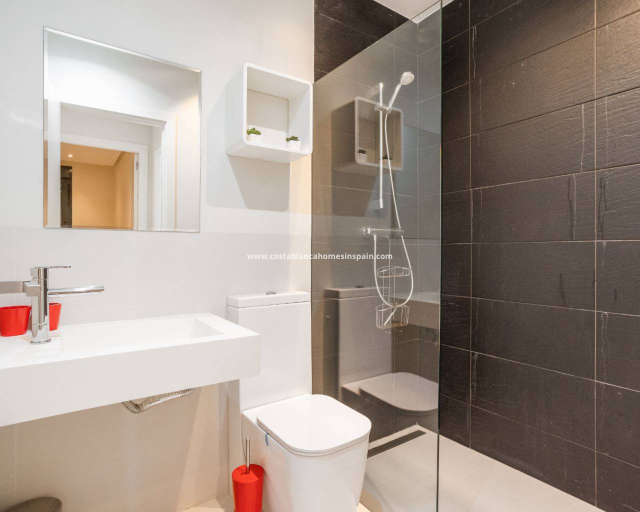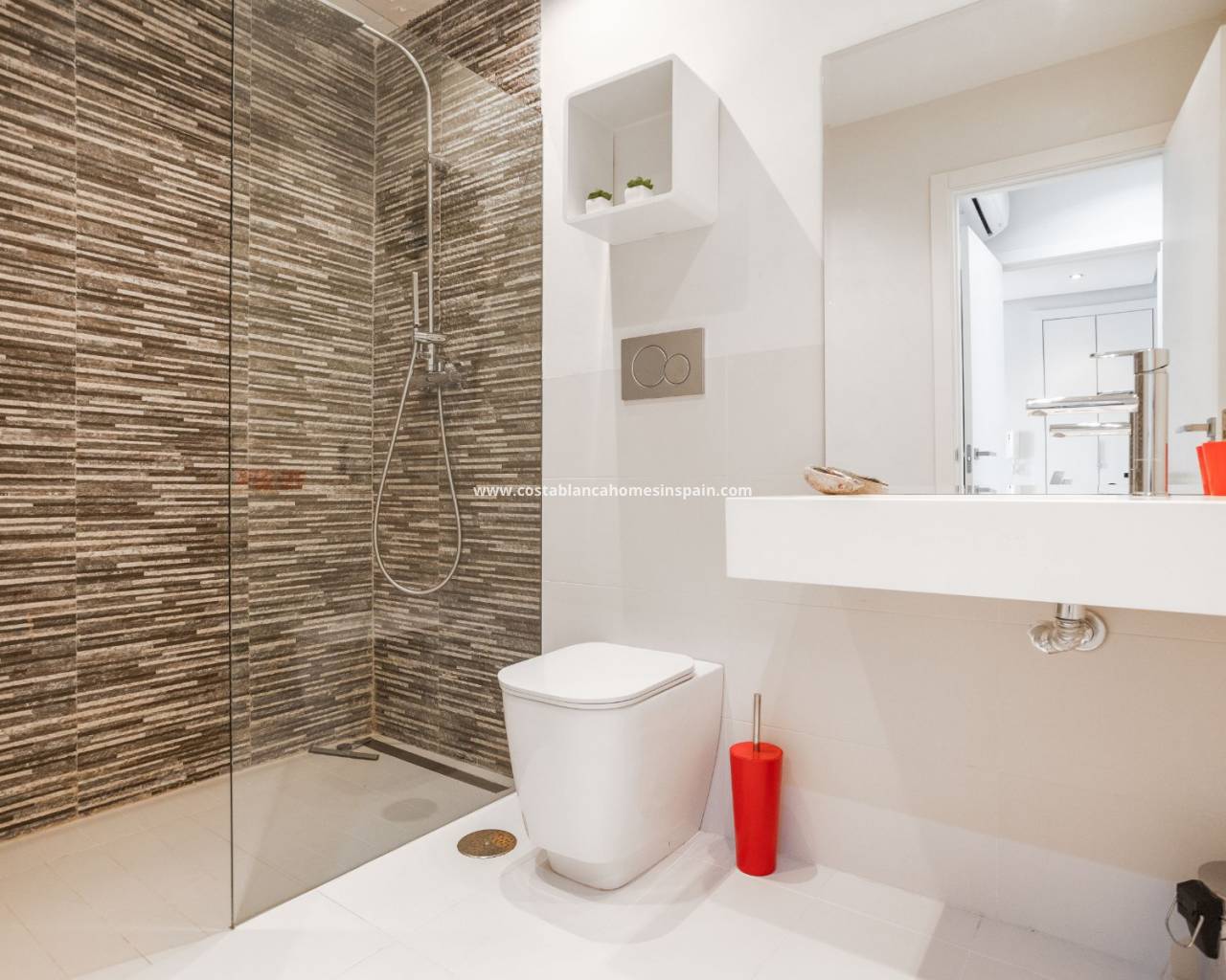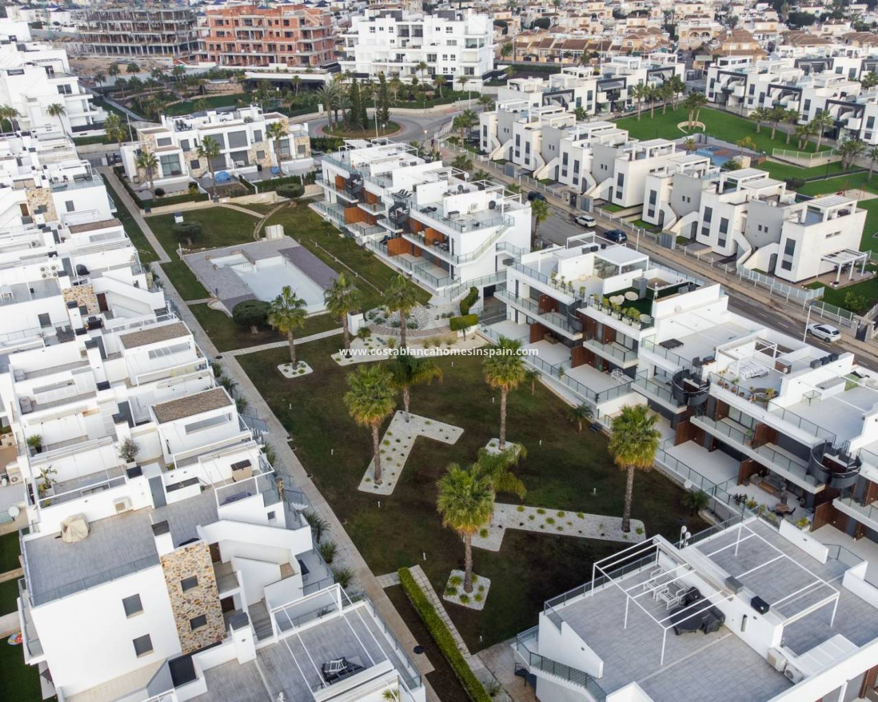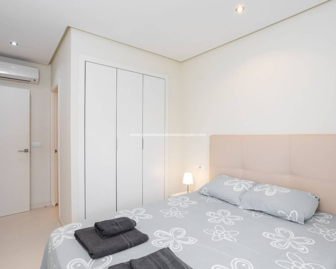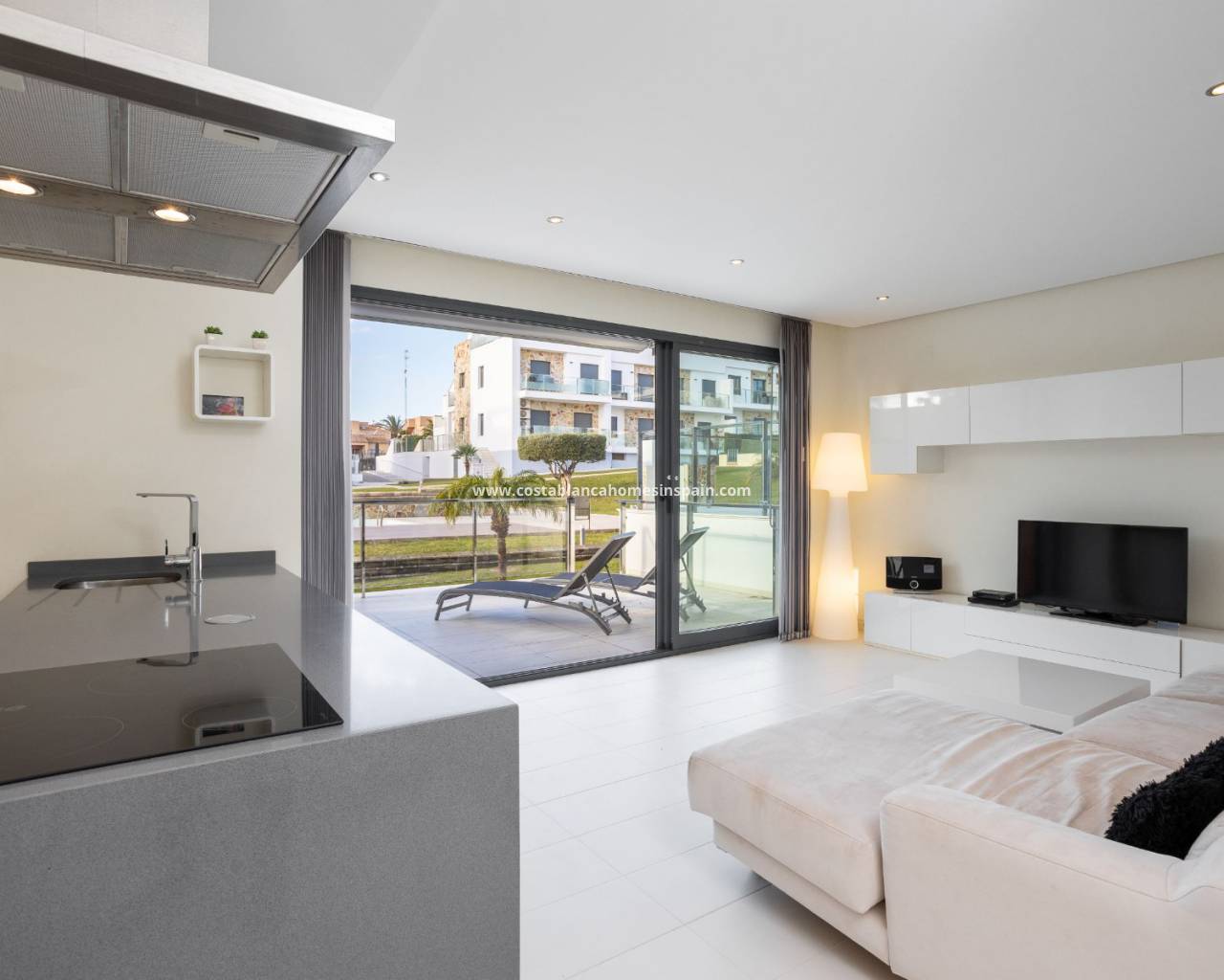 Íbúðinni fylgir sér garður við inngang íbúðar. Íbúðin býður upp á rúmgóða stofu með mikilli lofthæð, opið eldhús og rennihurð með útgengi út á verönd út á sundlaug sem snýr í suður til að nýta sólina og útsýnið sem best. Einnig eru tvö svefnherbergi og rúmgott baðherbergi með sturtu. Úr einu svefnherberginu er gengið út í garð á bakhlið íbúðarinnar. Íbúðin er fullbúin, með loftkælingu (kulda/hita), var byggð árið 2012 og býður upp á aðgang að fallegri sameiginlegri sundlaug með garði. Þetta svæði er mjög framundan og hefur fullt af nýjum börum og veitingastöðum sem hafa verið byggð á undanförnum árum sem mjög annasamt svæði fyrir frí og íbúðarhúsnæði.
