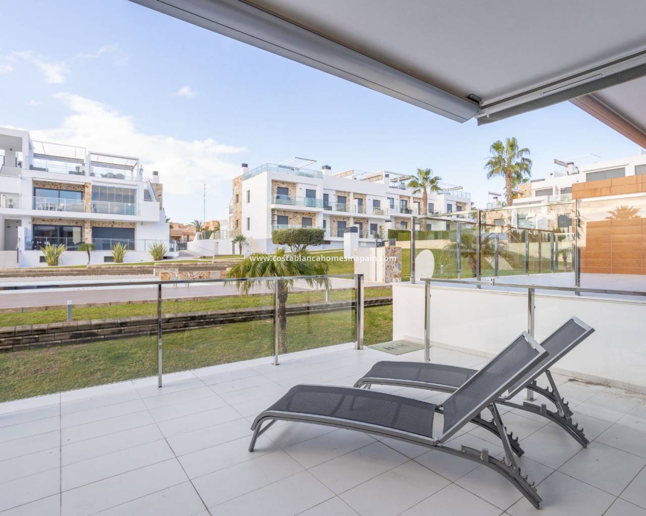 Mjög vel staðsett JARÐHÆÐ ÍBÚÐ með stórri suðurverönd sem snýr að sundlauginni í lokuðu hverfi í göngufæri við alla aðstöðu og Punta Prima ströndina.