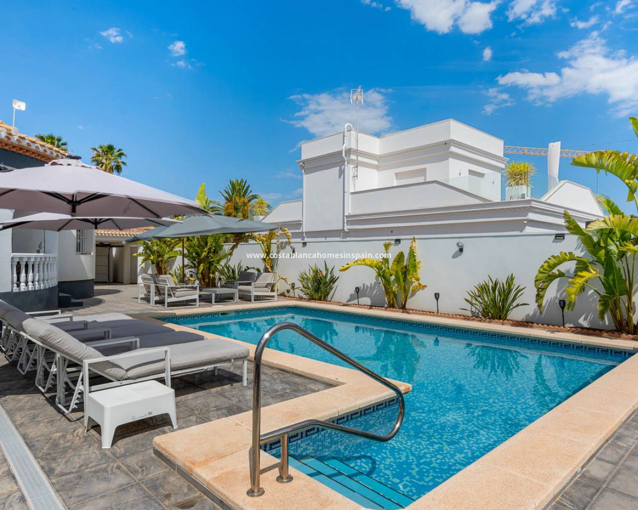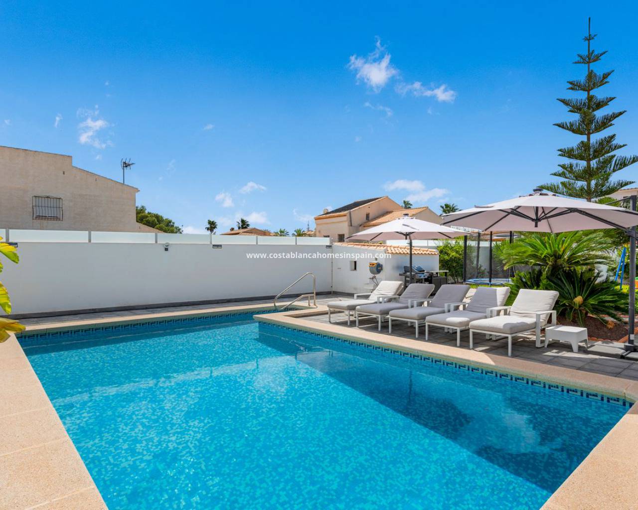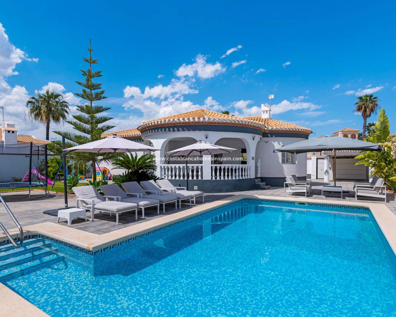 Þessi frábæra eign er staðsett á hinu vinsæla Playa Flamenca svæði, í aðeins nokkurra mínútna göngufjarlægð frá Zenia Boulevard verslunarmiðstöðinni og ströndinni. Rétt við Market Street er eignin með háa einkaveggi og rafmagnshlið fyrir bílana þína. Stóri sólríka garðurinn er með ávaxtatrjám og náttúrulegu grasi, pálma og Estrilizias, auðvelt í viðhaldi en veitir rómantískt umhverfi allt árið um kring. Stór einkasundlaug er á sólarhlið eignarinnar og með henni slökunarsvæði með sólbekkjum og stólum. Gengið er inn í eignina til suðurs með verönd þar sem hægt er að njóta kvölds og síðdegis utandyra og kjörinn morgunmatur. Þegar þú ferð í gegnum útidyrnar munt þú finna þig í stóru stofunni með nútímalegu endurnýjuðu eldhúsi sem er fullbúið með hágæða tækjum. Úr stofu er stór gangur sem leiðir inn í svefnherbergi en þar er að finna 3 hjónaherbergi, 1 baðherbergi og sérbaðherbergi á aðalbaðherbergi að aftan. Á þessum gangi er einnig þvottahús til að geyma allt sem þú gætir átt til að elda og þrífa. Gististaðurinn er með gólfhita í gegn, skipt eftir hlutum, og loftkæling í hverju herbergi. Efni sem notuð eru í bygginguna eru mjög vönduð og hefur húsið verið endurheimt með viðbótareinangrun í hverjum útvegg. Skipulag þessarar eignar er fullkomið fyrir litla fjölskyldu til að búa allt árið um kring eða fyrir frí. Staðsetningin er fullkomin og stefnumörkunin býður þér að vera í sólinni á hverjum degi.