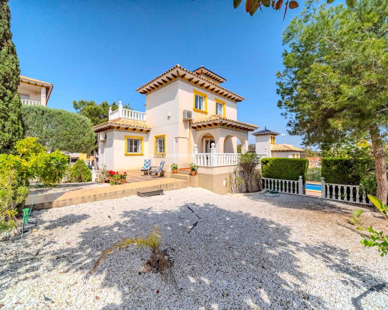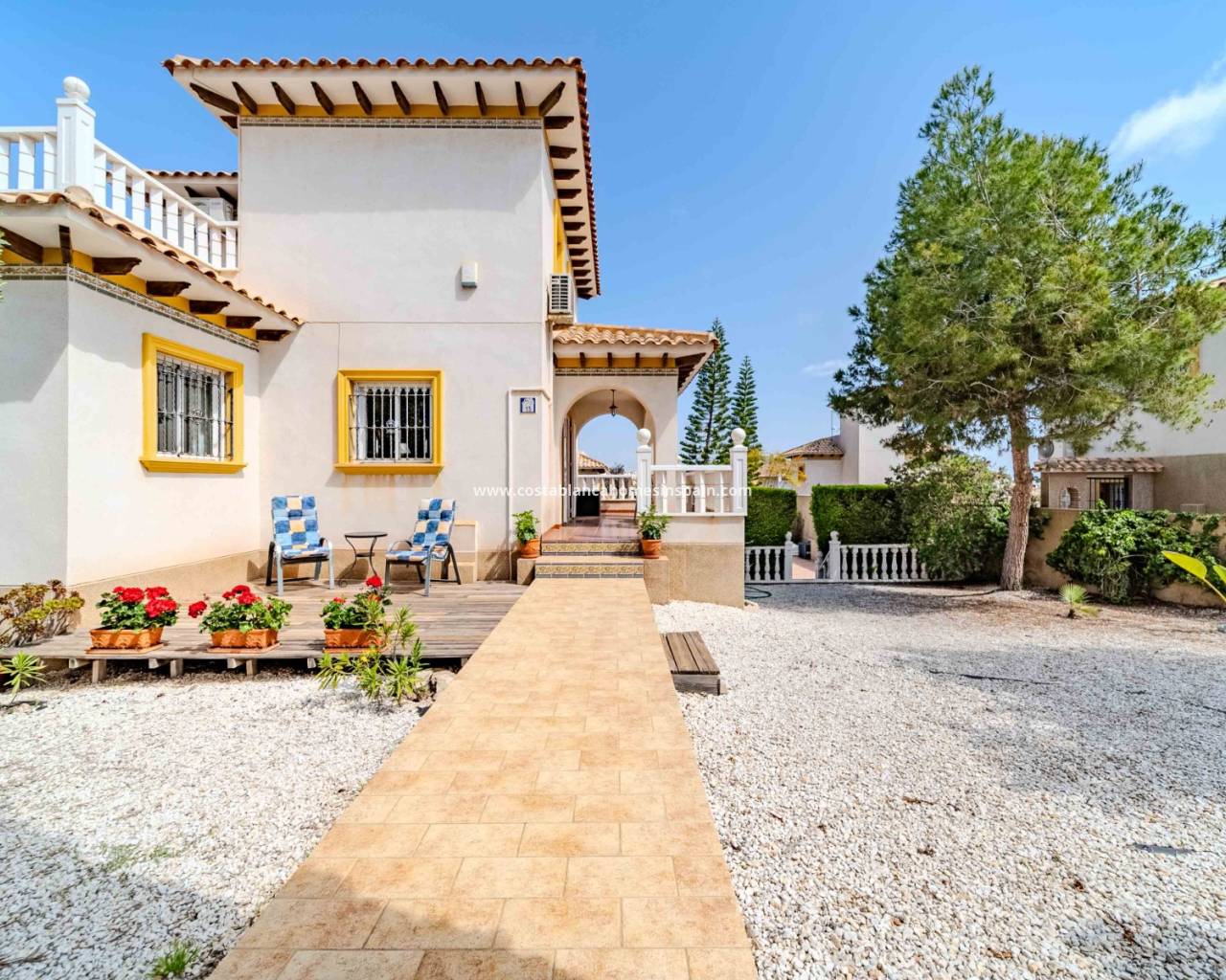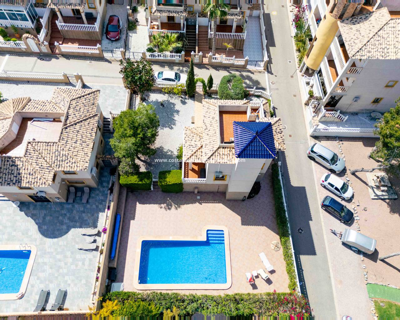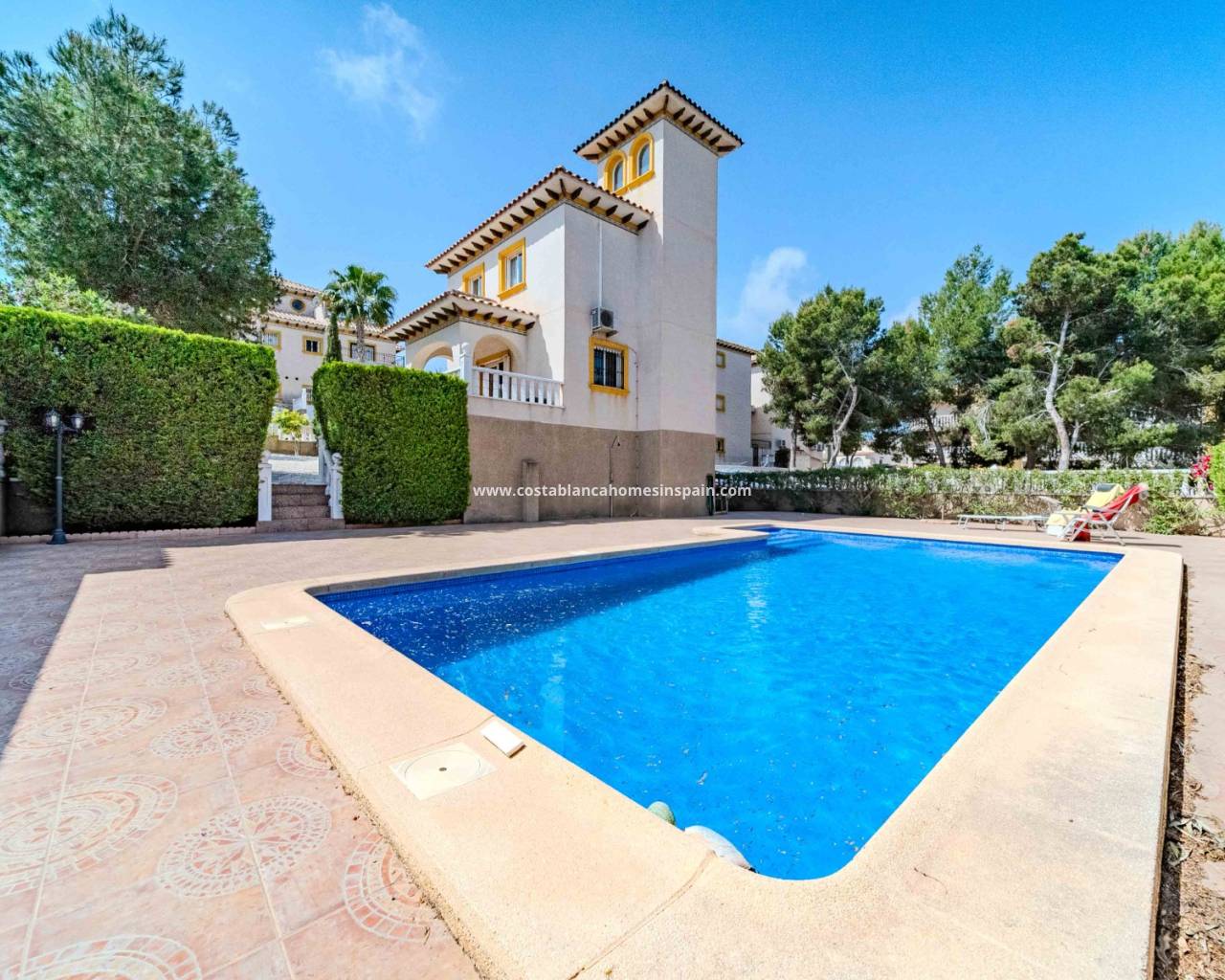 Denne nydelige villaen var det originale showhuset, så er satt på en stor tomt med sitt private oppvarmede basseng. Den kommer med en sol gjennomvåt terrasse over å se bassenget og en fin størrelse salong og kjøkken med et vaskerom og har et dusjrom og et stort dobbelt soverom nede. Det øverste nivået har to store doble soverom og et fullt familiebad med tilgang til en annen stor terrasse på hovedrommet, pluss at du har fordelen av et privat solarium med uavbrutt panoramautsikt. Villaen ligger en 8-minutters spasertur til alle lokale barer og restauranter på Villamartin Plaza og må sees.