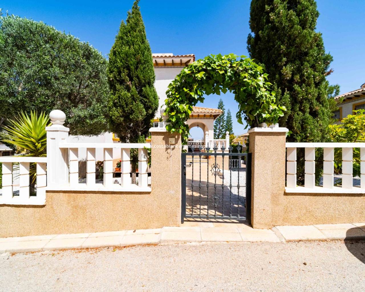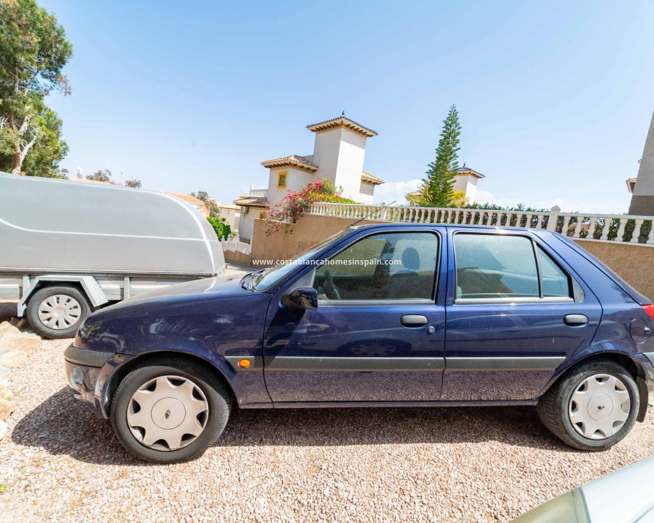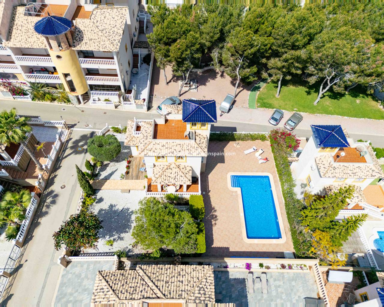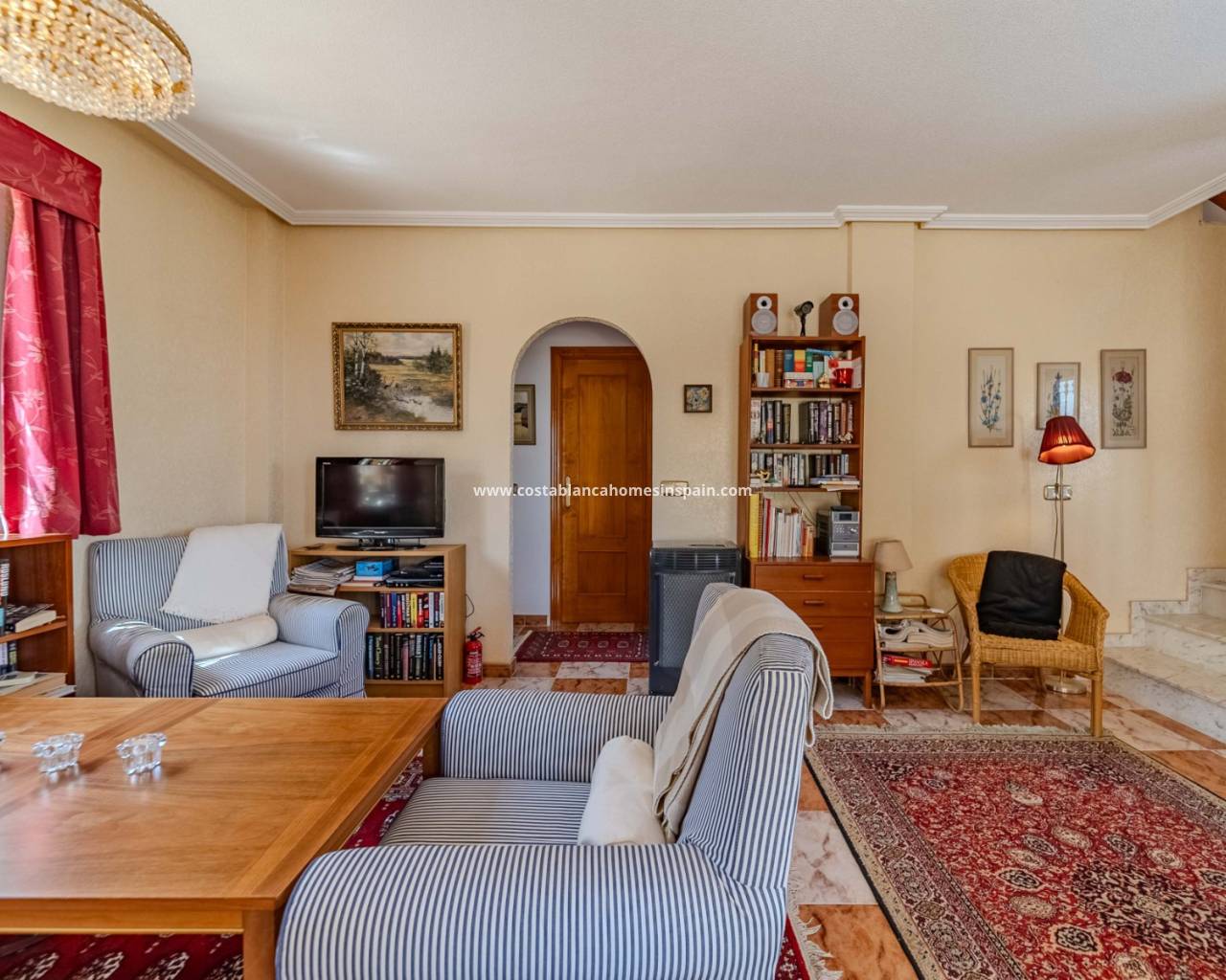 Denne nydelige villaen var det originale showhuset, så er satt på en stor tomt med sitt private oppvarmede basseng. Den kommer med en sol gjennomvåt terrasse over å se bassenget og en fin størrelse salong og kjøkken med et vaskerom og har et dusjrom og et stort dobbelt soverom nede. Det øverste nivået har to store doble soverom og et fullt familiebad med tilgang til en annen stor terrasse på hovedrommet, pluss at du har fordelen av et privat solarium med uavbrutt panoramautsikt. Villaen ligger en 8-minutters spasertur til alle lokale barer og restauranter på Villamartin Plaza og må sees.