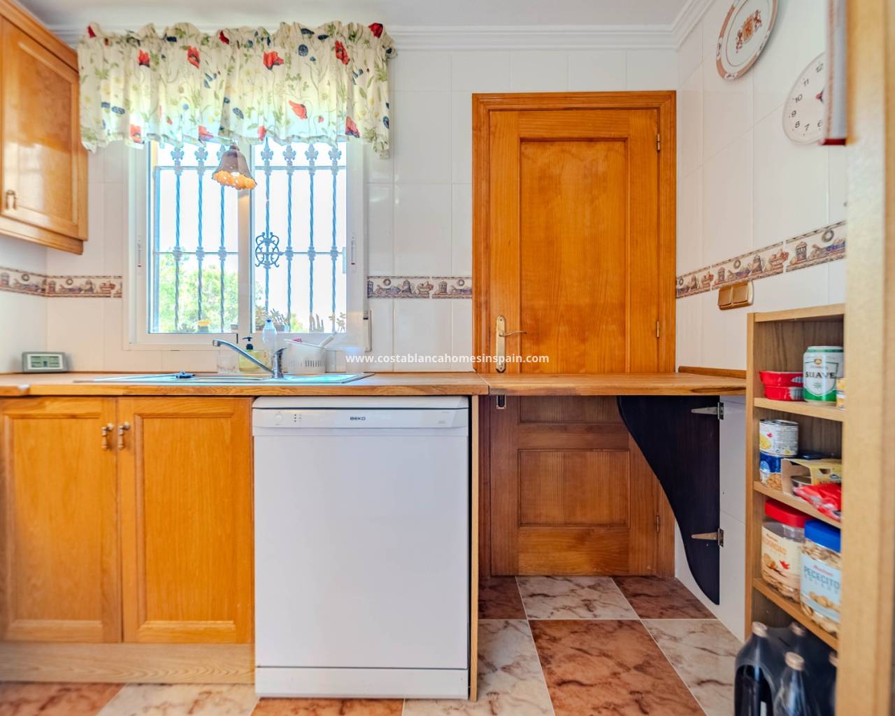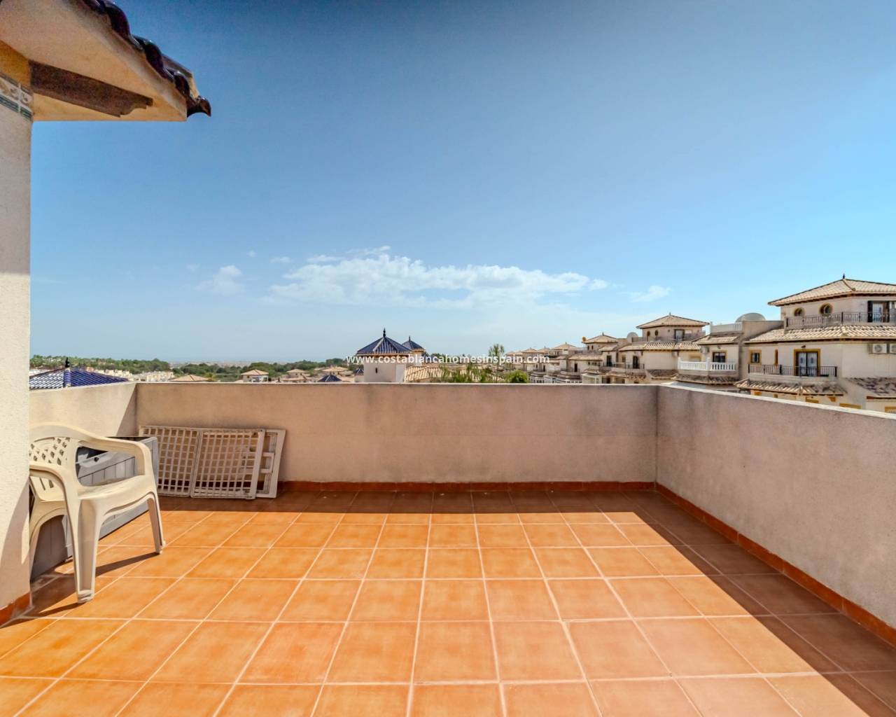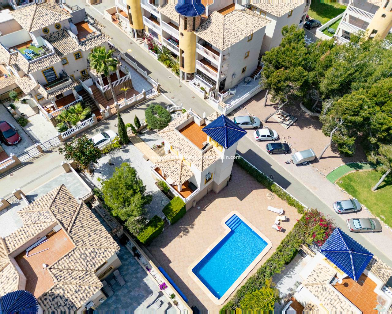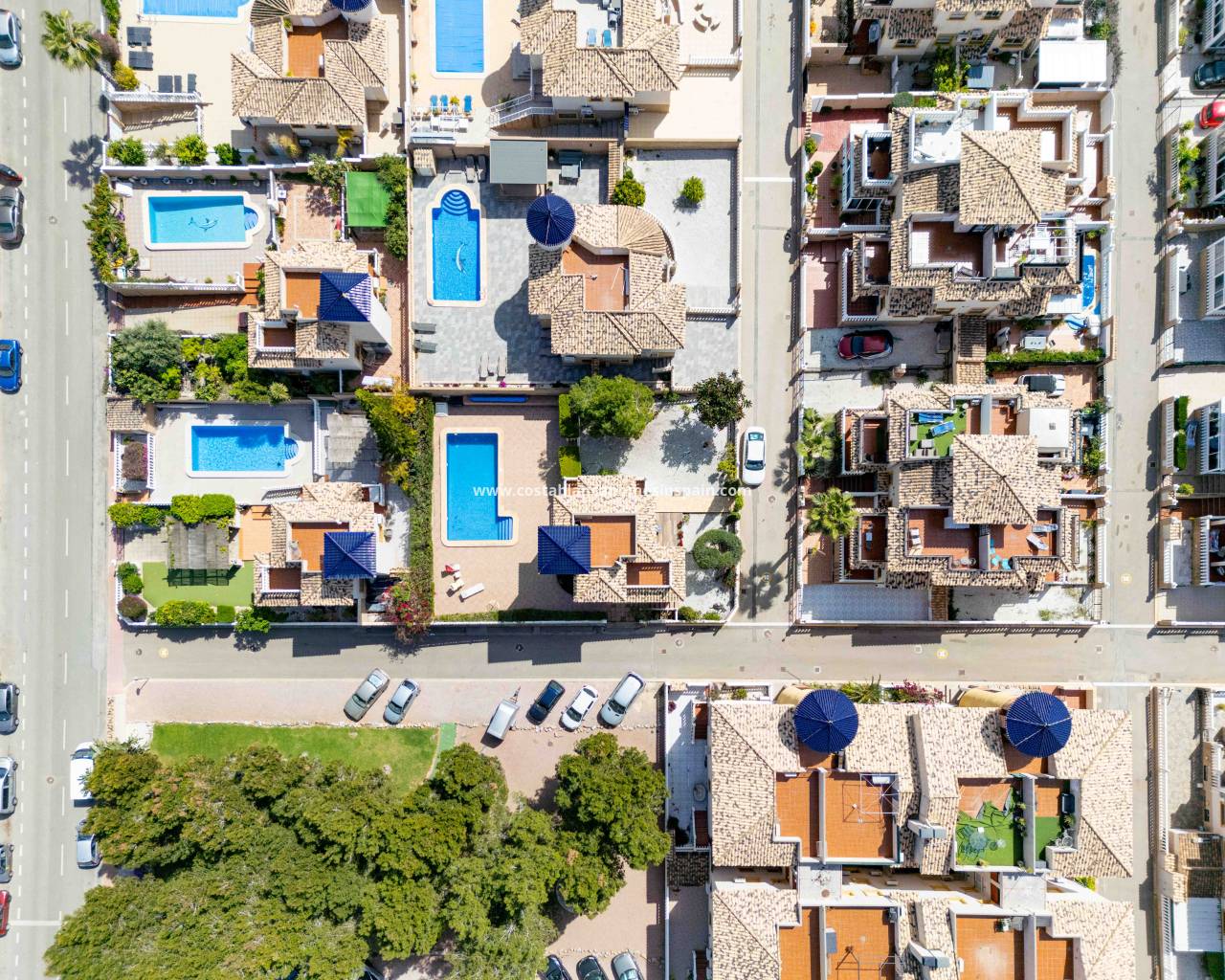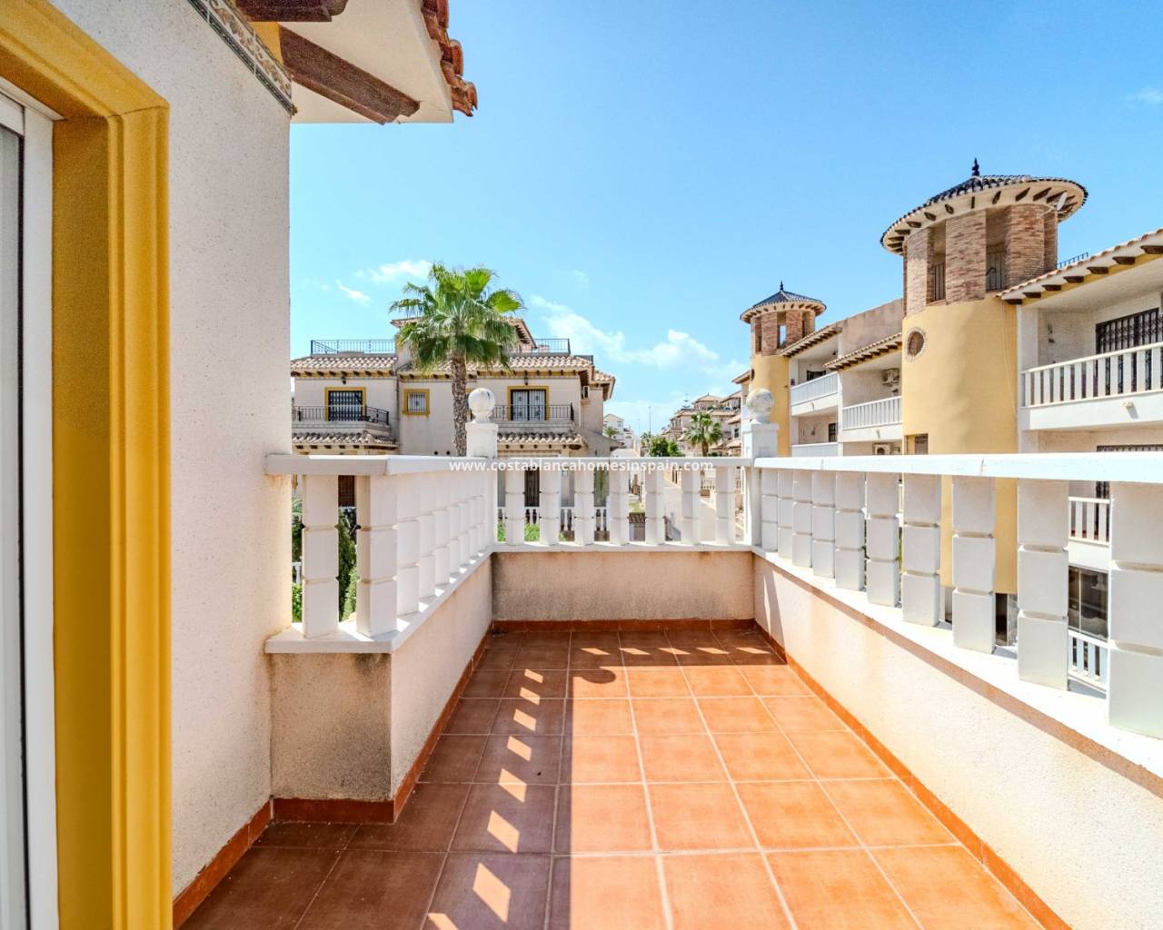 Denne nydelige villaen var det originale showhuset, så er satt på en stor tomt med sitt private oppvarmede basseng. Den kommer med en sol gjennomvåt terrasse over å se bassenget og en fin størrelse salong og kjøkken med et vaskerom og har et dusjrom og et stort dobbelt soverom nede. Det øverste nivået har to store doble soverom og et fullt familiebad med tilgang til en annen stor terrasse på hovedrommet, pluss at du har fordelen av et privat solarium med uavbrutt panoramautsikt. Villaen ligger en 8-minutters spasertur til alle lokale barer og restauranter på Villamartin Plaza og må sees.