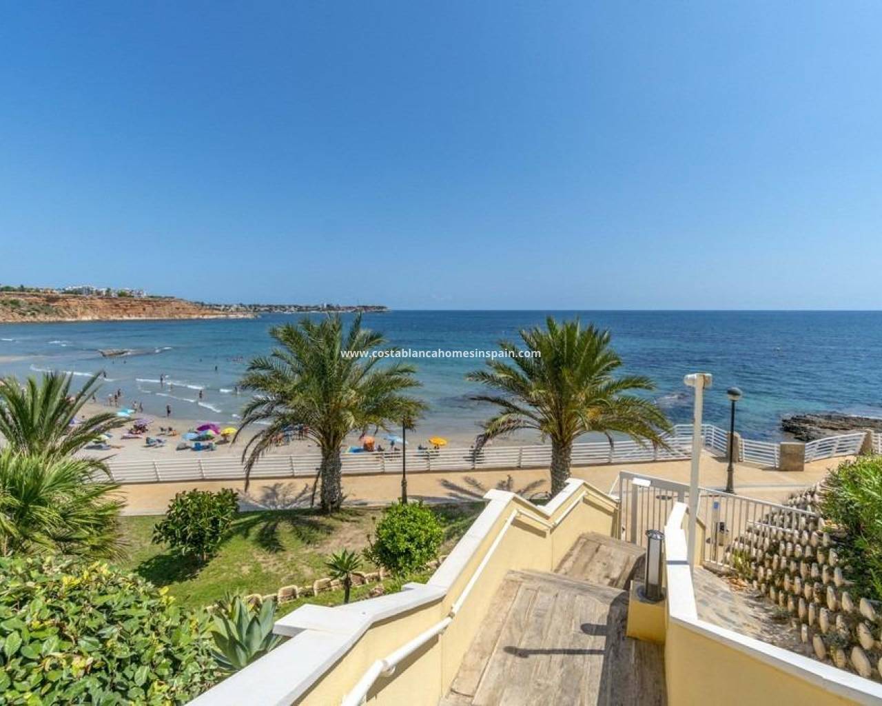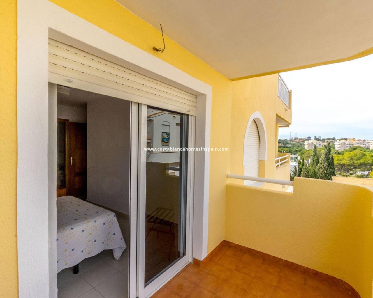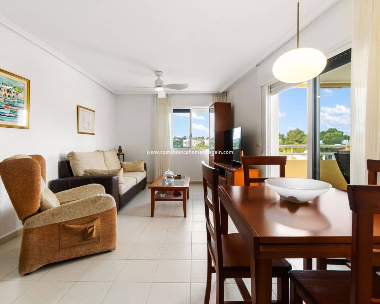 Romslig leilighet i Aguamarina, i et boligkompleks ved stranden. Første etasje, nordvestvendt. Leiligheten på 100 m2 har tre soverom, to komplette bad (ett ensuite), et separat, utstyrt kjøkken, en stue-spisestue og to terrasser på omtrent 12 m2 hver. Selges møblert. Boligkomplekset med basseng ligger rett over strendene Aguamarina og Campoamor, med direkte privat tilgang til stranden. Leiligheten inkluderer også en parkeringsplass.