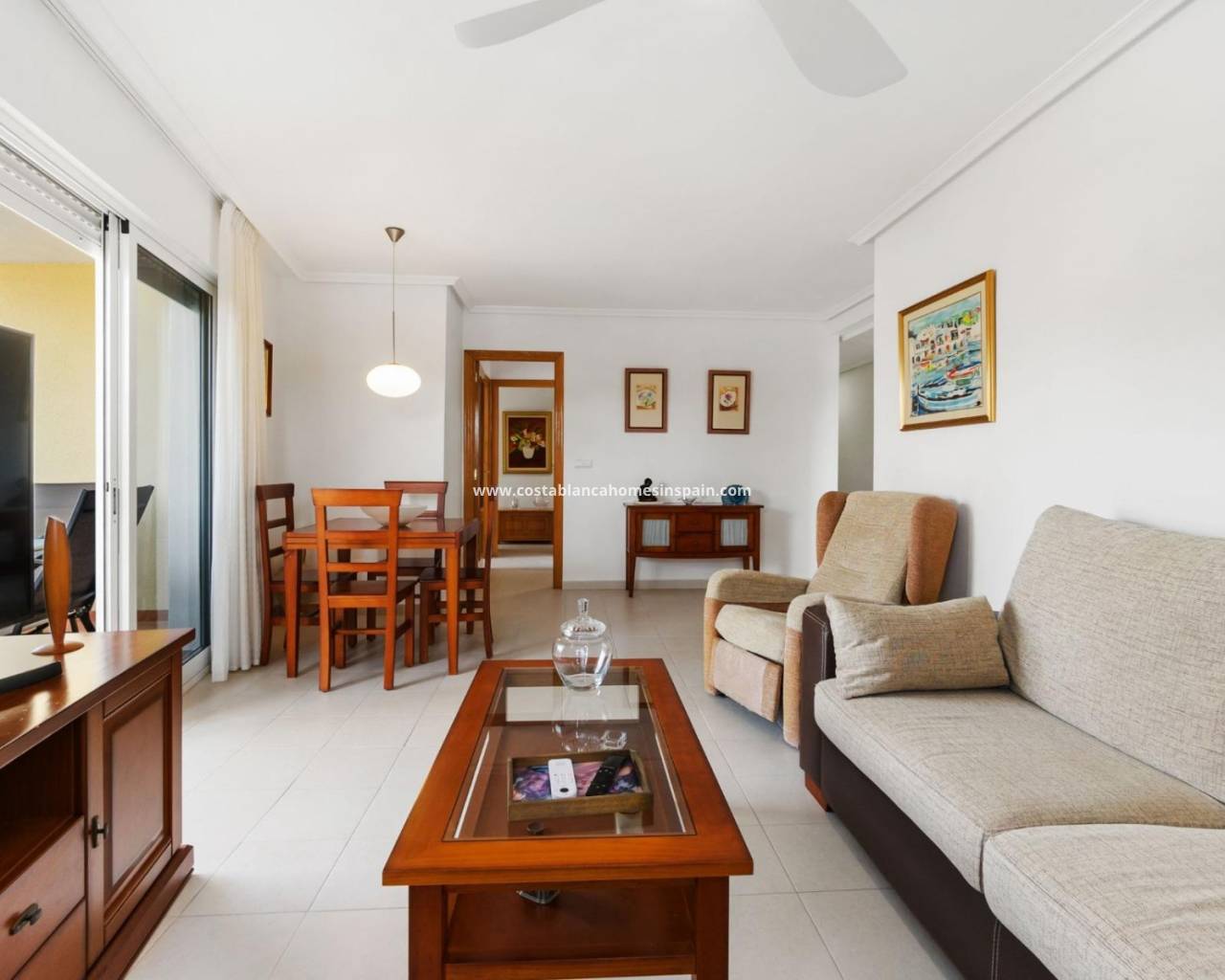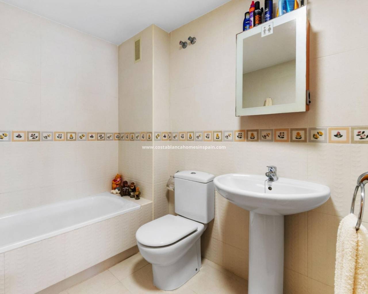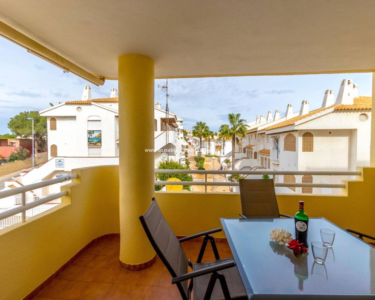 Romslig leilighet i Aguamarina, i et boligkompleks ved stranden. Første etasje, nordvestvendt. Leiligheten på 100 m2 har tre soverom, to komplette bad (ett ensuite), et separat, utstyrt kjøkken, en stue-spisestue og to terrasser på omtrent 12 m2 hver. Selges møblert. Boligkomplekset med basseng ligger rett over strendene Aguamarina og Campoamor, med direkte privat tilgang til stranden. Leiligheten inkluderer også en parkeringsplass.