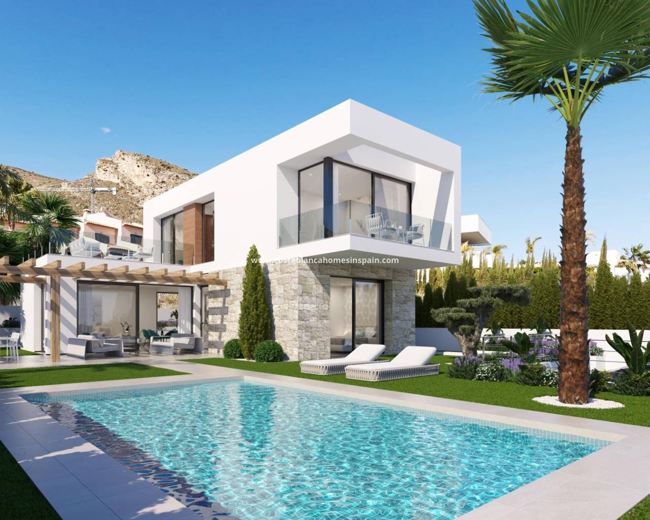 NYBYGGDE VILLAER I FINESTRAT Nybygget bolig med moderne villaer som ligger i Sierra Cortina, Finestrat. Nybyggede villaer i moderne stil med 3 soverom, 3 bad, åpen kjøkkenløsning, stor stue med utgang til terrasse, privat hage med basseng og parkeringsplass. Villas har en stor terrasse med utsikt over havet og fjellene. Bolig som ligger 5 minutter med bil fra alle tjenestene som Benidorm kan tilby og i et miljø med en gjennomsnittlig årlig temperatur på 20ºC og 300 soldager i året, 44 km fra Alicante flyplass, 3 km fra sjøen og 200 meter til golf.