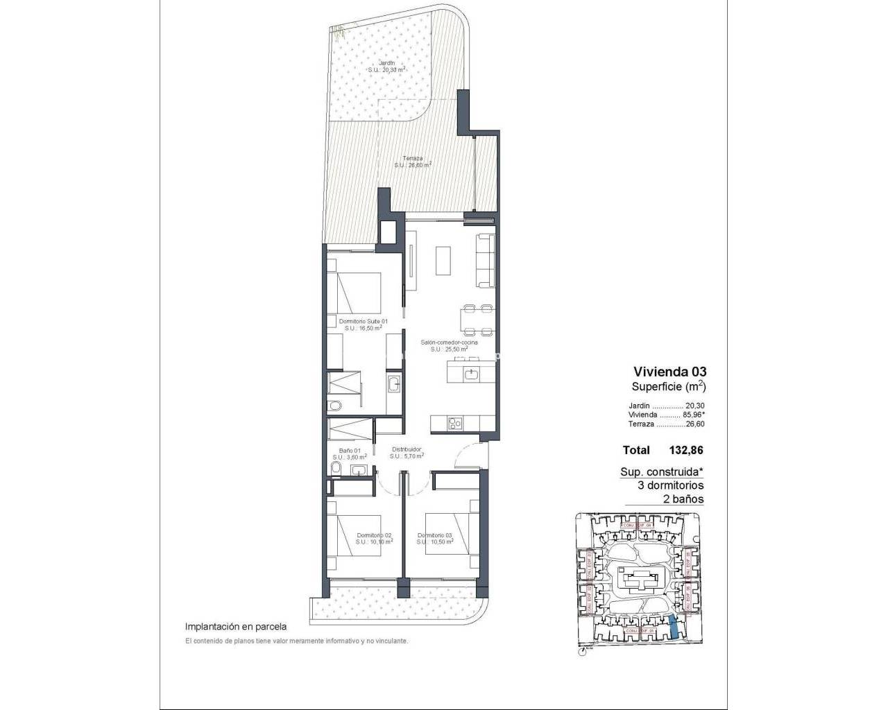 Eksklusive nybygg i Lo Marabú, Ciudad Quesada Moderne design og maksimal komfort i middelhavsomgivelser Oppdag dette spektakulære boligkomplekset i Lo Marabú, Ciudad Quesada, som består av 80 boliger med 2 og 3 soverom og 2 bad. Disse boligene er designet med en moderne og effektiv tilnærming, og har romslige terrasser, kryssventilasjon og høy kvalitet på finishen for å maksimere komfort og energieffektivitet. Boligene i første etasje har private hager, mens boligene i toppetasjen har private solarium med forhåndsinstallasjon for boblebad og utedusj. I tillegg har prosjektet felles svømmebassenger omgitt av hager, noe som skaper et perfekt miljø for avslapping og sosialt samvær. Funksjoner av høy kvalitet for en eksklusiv livsstil Alle boligene er designet for å tilby maksimal komfort, med materialer av topp kvalitet og moderne design: Store skyvevinduer i aluminium med termosperre. Motoriserte persienner for økt komfort. Climalit 4+4/14/4/4/4+4-vinduer for termisk og akustisk isolasjon. Pansret inngangsdør med sikkerhetslås. Fullt utstyrt kjøkken med elektriske apparater inkludert. Bad med møbler, speil og dusjvegger. 150L aerotermisk system for varmt vann. Komplett installasjon av luftkondisjonering med kanaler (varmt/kaldt). Belysning i alle rom allerede innlemmet. Parkeringsplass inkludert. Takket være den doble fasadedesignen tilbyr boligene naturlig kryssventilasjon, noe som gir kjølighet om sommeren og reduserer energiforbruket i klimaanlegg. Privilegert beliggenhet i Ciudad Quesada Lo Marabú er et eksklusivt boligområde i Ciudad Quesada (Rojales), omgitt av naturområder og med alle tjenester innen rekkevidde. Urbanisasjonen ligger svært nær saltsjøene i La Mata og Torrevieja, et ideelt miljø for å nyte naturen og forbedre ditt velvære. Fra ditt nye hjem har du rask tilgang til de viktigste severdighetene i området: Guardamar del Segura og Torrevieja strender - 10 km (15 minutter med bil). Alicante-Elche lufthavn (ALC) - 38 km (35 minutter med bil). Murcia-Corvera lufthavn (RMU) - 65 km (50 minutters kjøring). Prestisjefylte golfbaner - Mindre enn 5 km. Kjøpesentre og restauranter - bare noen få minutter unna. Rask tilgang til motorveiene AP-7 og N-332, som forbinder hele Costa Blanca. Et perfekt hjem for å nyte Middelhavet Med sin kombinasjon av moderne design, strategisk beliggenhet og eksepsjonelle naturomgivelser er disse boligene i Lo Marabu ideelle for permanent opphold, feriehus eller investeringseiendom. Ikke gå glipp av denne unike muligheten. Kontakt oss i dag for mer informasjon eller for å avtale en visning av ditt fremtidige hjem i Ciudad Quesada.