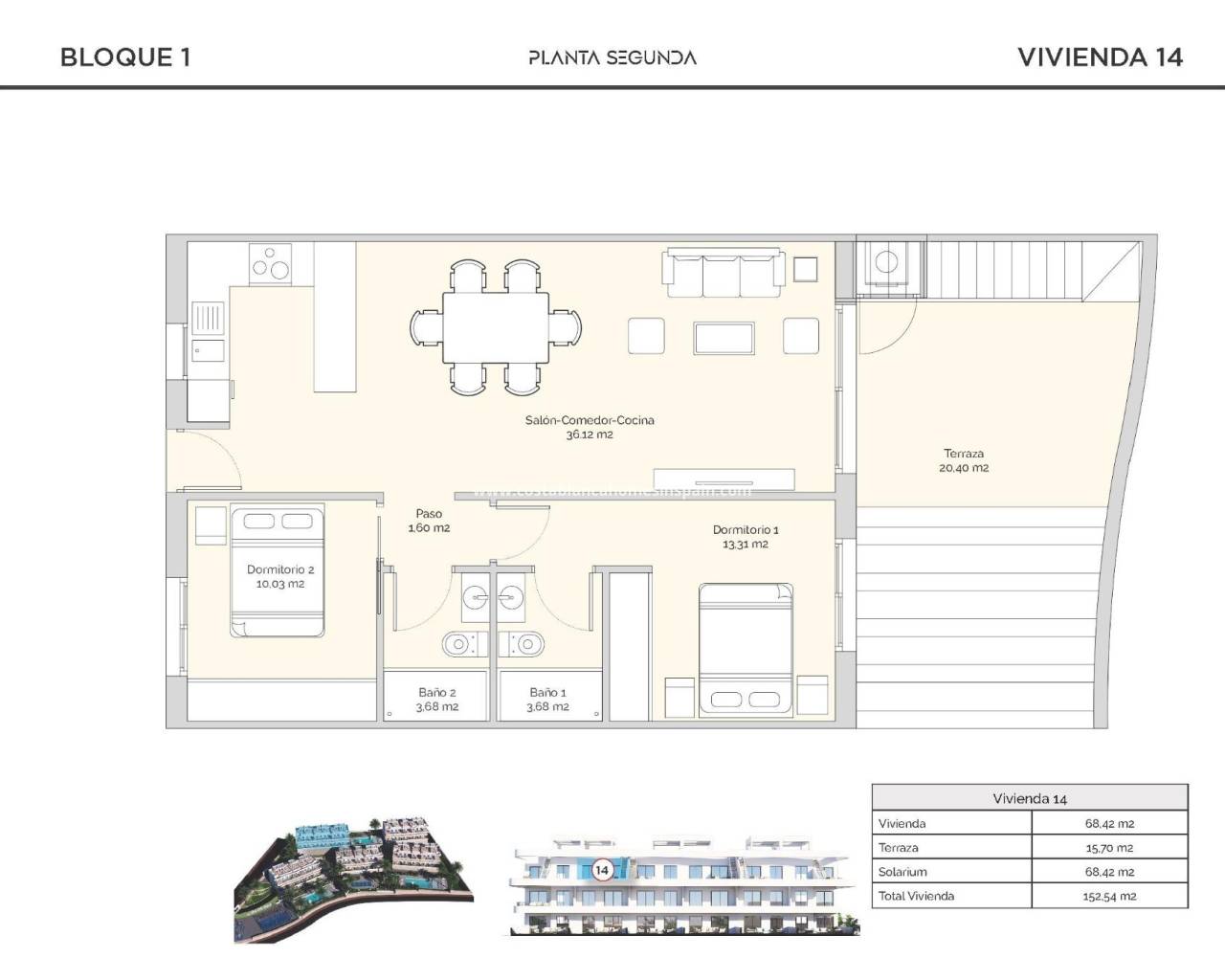 NYBYGD BOLIGKOMPLEKS I FINESTRAT Nybygget boligkompleks i Balcon de Finestrat. Dette komplekset består av moderne leiligheter med 2 soverom, 2 bad, åpen kjøkkenløsning med stue. Noen av leilighetene vil ha havutsikt. Leilighetene i første etasje har private hager, leilighetene i mellometasjen har terrasser og leilighetene i toppetasjen har terrasser og private solarium. Alle leilighetene har privat underjordisk parkeringsplass. Eiendommene har tilgang til fellesområdet med 3 svømmebassenger, parkering, padle, lekeplass, calisthenics. Det er en flott mulighet og privilegium å kunne leve med dette miljøet av golf og strand, nær alle fasiliteter av alle tjenester som regnes som et av de beste stedene å investere. Finestrat ligger i Marina Baixa-regionen på Costa Blanca. Benidorm ligger bare en fem minutters kjøretur fra eiendommene og tilbyr alle tjenestene du trenger, inkludert butikker, barer, restauranter, supermarkeder, banker, apotek og flere private internasjonale skoler. I nærheten ligger strendene Levante, Poniente og Cala de Finestrat, som er blant de beste i Europa, og som er tildelt Blått flagg av EU. Alle fritidstjenester som temaparkene Aqua Natura, Terra Mítica, Terra Natura, Aqualandia og Mundomar, Sierra Cortina og Villaitana golfbaner, fotturer og klatring i Puig Campana, en makeløs naturlig setting eller nyt nautisk sport. Avstand til sjøen 4 km, til flyplassen 26 km og til golf 1 km.