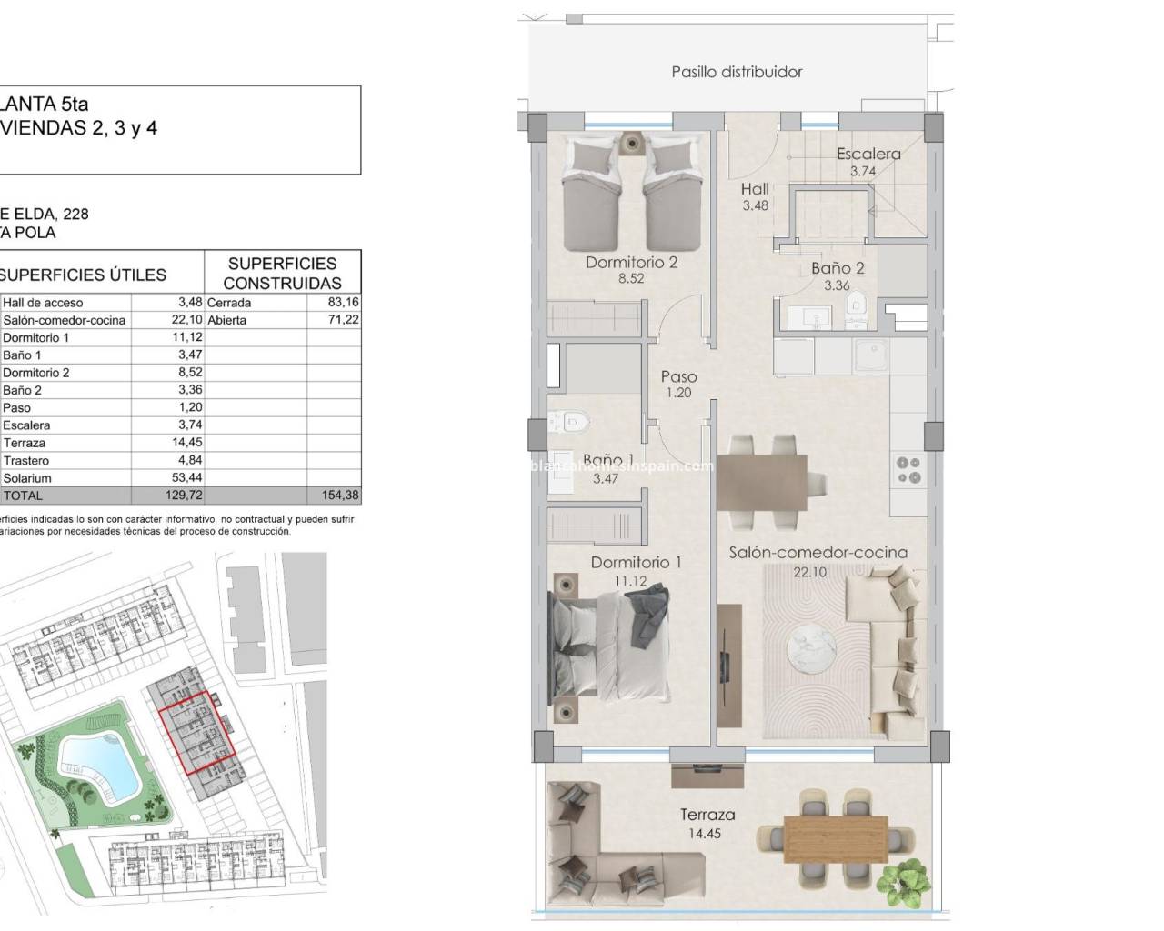 NYBYGD BOLIGKOMPLEKS I SANTA POLA Moderne inngjerdet boligkompleks bestående av 3 boligblokker med store anlagte fellesområder, inkludert et svømmebasseng med vannsenger, lekeplass, pergola og sykkelparkering. Boligen har leiligheter med 3 og 2 soverom, begge typer inkluderer 2 komplette bad, åpen kjøkkenløsning med stue, garderober, terrasse, parkeringsplass. De har en felles hage, svømmebasseng med strandinngang, utstyrt med dusjer og en stor pergola i tre. Det har anlagte områder med palmer og vegetasjon, som alle er opplyst. I den sentrale delen av bassenget er det et grunnere område der vannsengene ligger. Santa Pola kommune ligger på den populære Costa Blanca ved Middelhavet, sør for Alicante og i Bajo Vinalopó-regionen. Byen har en misunnelsesverdig geografisk beliggenhet, omgitt av naturlandskap og med et spesielt mikroklima som gir et mildt klima året rundt. Byens sentrum er avgrenset av festningen og havnen i øst og vest, og grenser til naturparken Santa Pola Salinas og Sierra og Cabo de Santa Pola, et gammelt rev som i dag kjennetegnes av sine løvrike furutrær. Santa Pola ligger 21 km. fra Alicante, provinshovedstaden med utmerket infrastruktur og 15 km. fra den internasjonale flyplassen "Elche-Alicante".