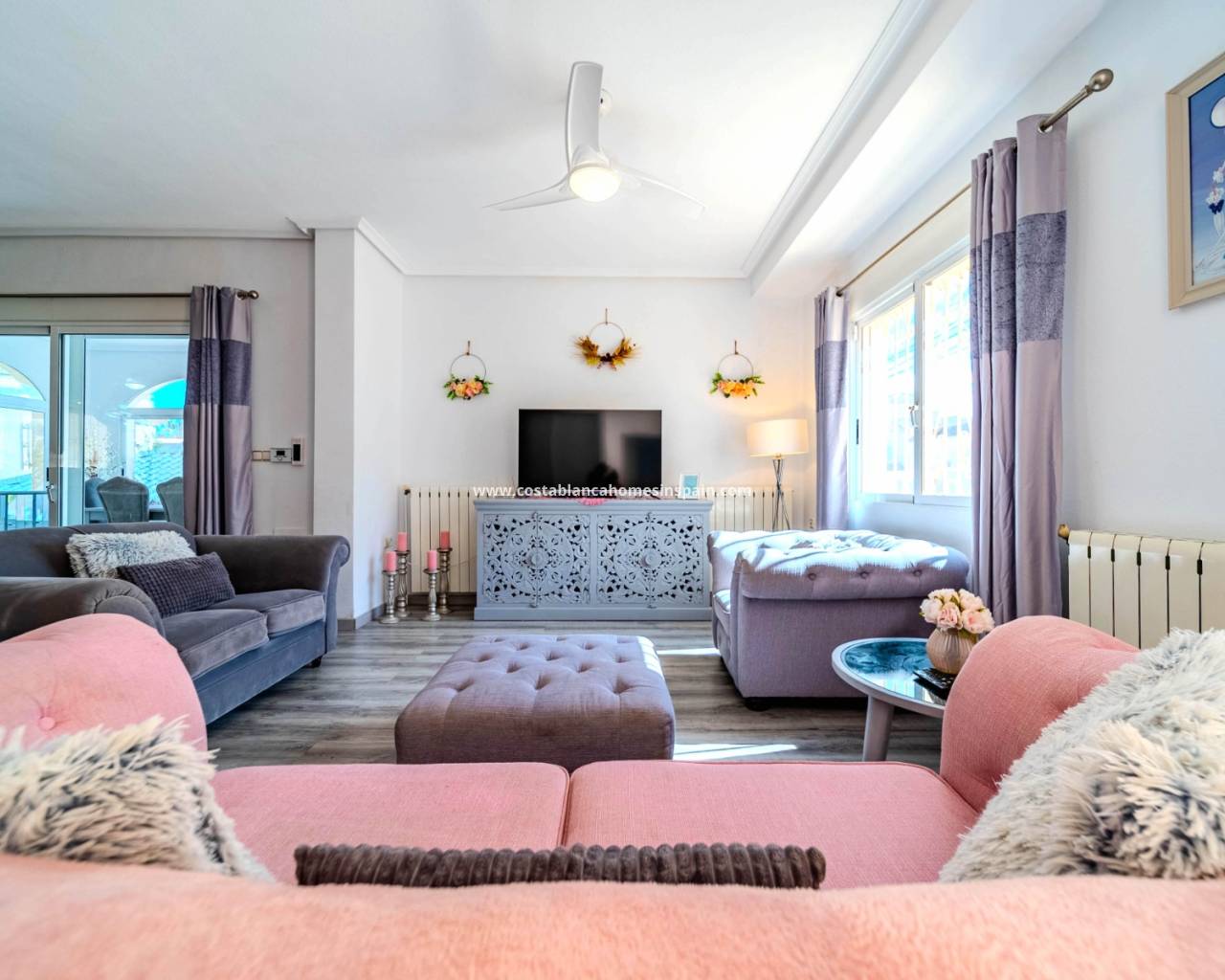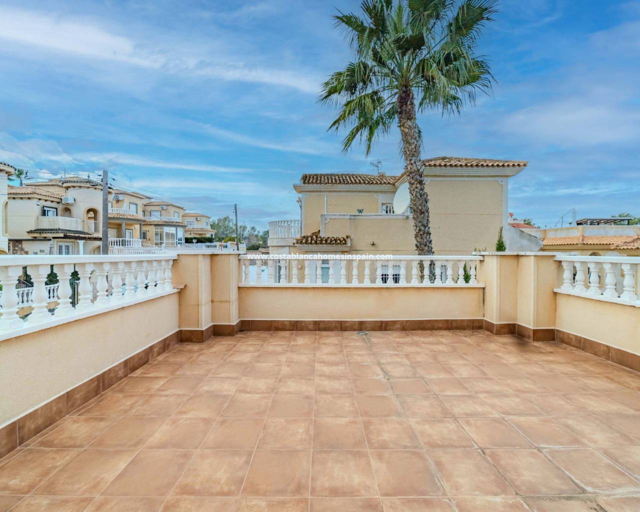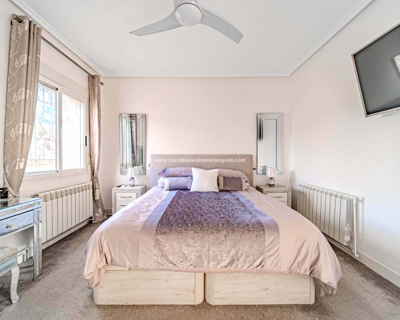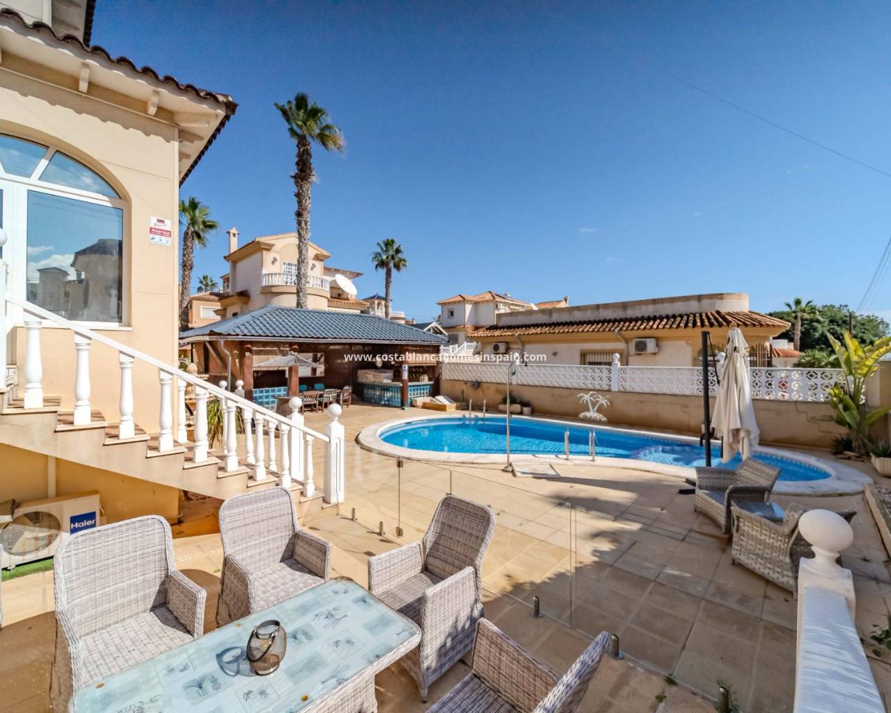 Fantastisk 6 sengs 5,5 bad renovert enebolig i en rolig vei i El Galan og bare 10 minutters gange til mange barer og restauranter. Denne vakre villaen har 3 doble soverom hvorav 2 har eget bad pluss et nydelig renovert familiebad med frittstående badekar og stor dusj. Denne eiendommen har store solrike terrasser utenfor de 2 største soverommene, og tilbyr rikelig med uteplass både ovenpå og i den velstelte hagen. Utstyrt med oljefylt sentralvarme gjennom pluss frodige tepper på trapper og øvre nivå, gir den den koselige følelsen gjennom vintermånedene. Energisparende varme og kalde klimaanlegg i alle rom pluss takvifter. Hele villaen er profesjonelt installert med reflekterende vindusfarging som lar deg sette pris på den nydelige bassengutsikten fra den forhøyede spisestuen uten å slippe solen inn, det hjelper også med å holde huset kjølig om sommeren og varmt om vinteren. Den store stuen i åpen planløsning er smakfullt innredet og leder til et nylig utstyrt kjøkken med øy. I underetasjen er det et dobbelt soverom med eget bad og et ytterligere soverom med wc som for tiden brukes som hjemmekontor. Fra kjøkkenet er det franske dører som fører til den store spisestuen og trappetrinn til bassenget og hagen hvor du finner et nydelig trygt område for små barn. Det underholdende området er skyggelagt med en egen bar og grill. Herfra får du tilgang til det 102 kvadratmeter store underbygningen med ytterligere 3 soverom, hvorav det ene brukes som treningsstudio og 2 bad. Salongen har blitt omgjort til dobbel som en smart skjermkino og har et separat kjøkkenområde. Herfra er det tilgang til den vakre bakhagen som er lite vedlikeholdt. På forsiden av villaen er det doble porter som fører til en stor garasje og parkeringsplass for 2 biler. Dette kjærlig omsorgte hjemmet må ses for å sette pris på størrelsen og skjønnheten.
