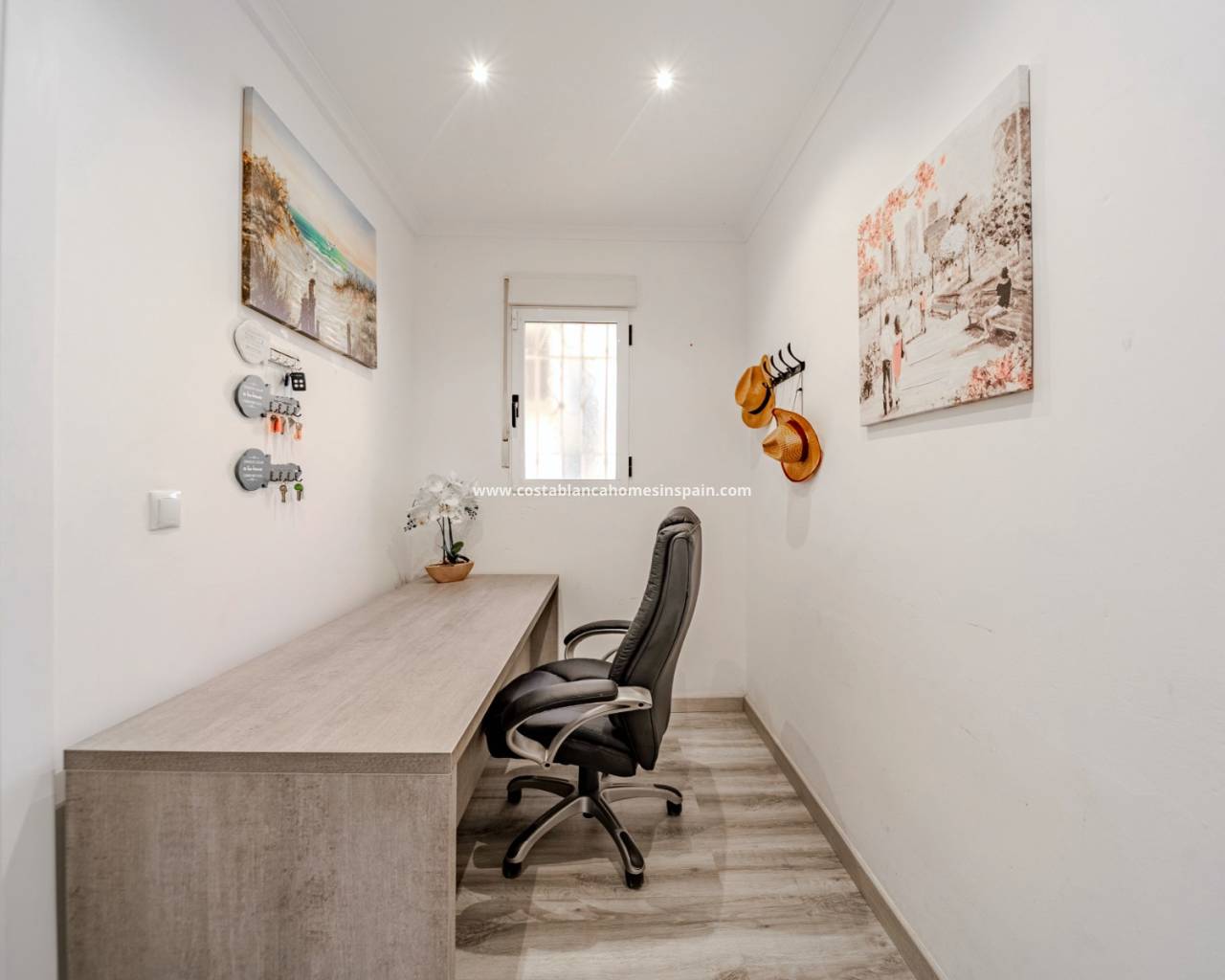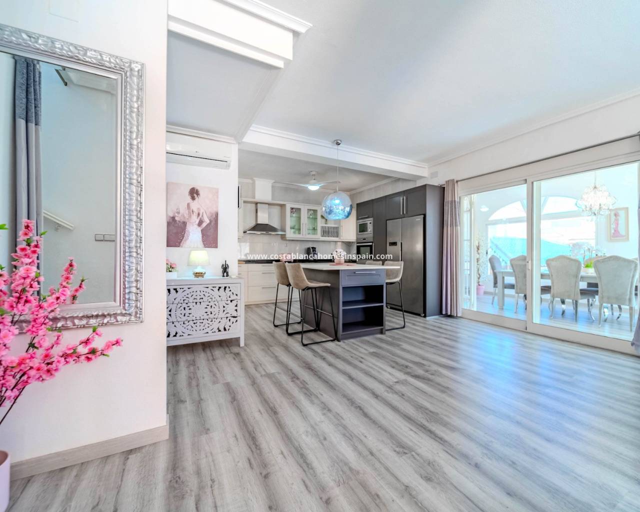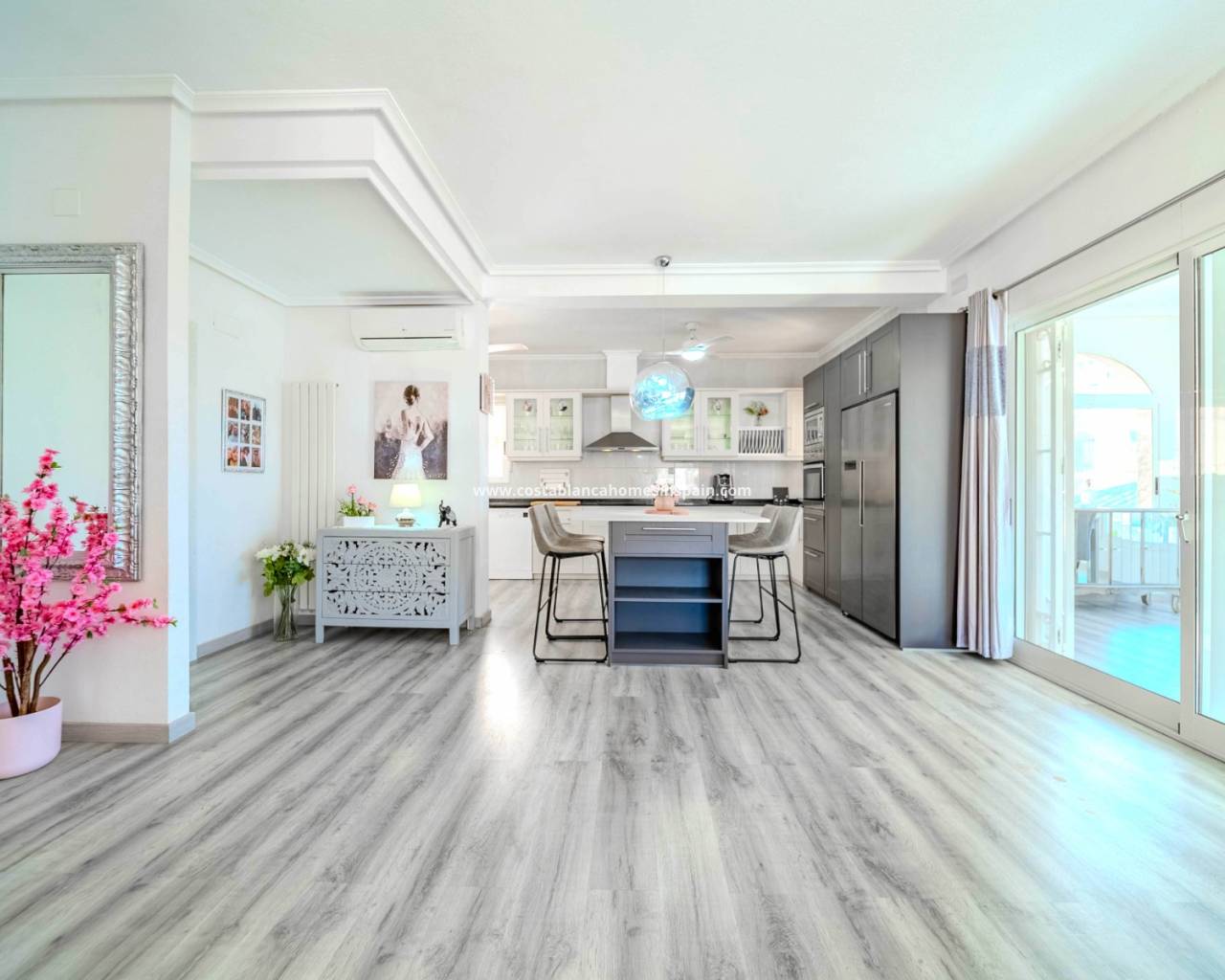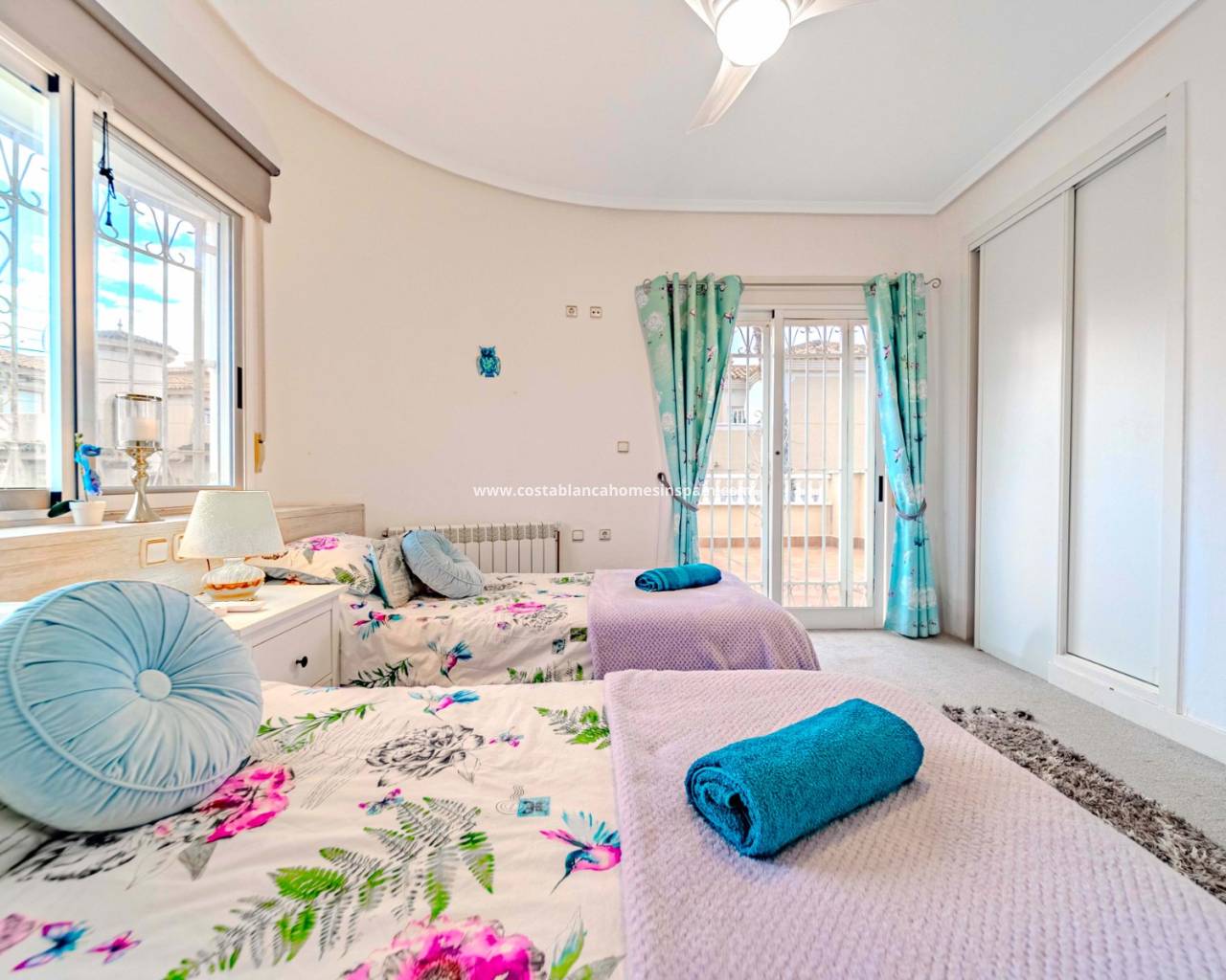 Fantastisk 6 sengs 5,5 bad renovert enebolig i en rolig vei i El Galan og bare 10 minutters gange til mange barer og restauranter. Denne vakre villaen har 3 doble soverom hvorav 2 har eget bad pluss et nydelig renovert familiebad med frittstående badekar og stor dusj. Denne eiendommen har store solrike terrasser utenfor de 2 største soverommene, og tilbyr rikelig med uteplass både ovenpå og i den velstelte hagen. Utstyrt med oljefylt sentralvarme gjennom pluss frodige tepper på trapper og øvre nivå, gir den den koselige følelsen gjennom vintermånedene. Energisparende varme og kalde klimaanlegg i alle rom pluss takvifter. Hele villaen er profesjonelt installert med reflekterende vindusfarging som lar deg sette pris på den nydelige bassengutsikten fra den forhøyede spisestuen uten å slippe solen inn, det hjelper også med å holde huset kjølig om sommeren og varmt om vinteren. Den store stuen i åpen planløsning er smakfullt innredet og leder til et nylig utstyrt kjøkken med øy. I underetasjen er det et dobbelt soverom med eget bad og et ytterligere soverom med wc som for tiden brukes som hjemmekontor. Fra kjøkkenet er det franske dører som fører til den store spisestuen og trappetrinn til bassenget og hagen hvor du finner et nydelig trygt område for små barn. Det underholdende området er skyggelagt med en egen bar og grill. Herfra får du tilgang til det 102 kvadratmeter store underbygningen med ytterligere 3 soverom, hvorav det ene brukes som treningsstudio og 2 bad. Salongen har blitt omgjort til dobbel som en smart skjermkino og har et separat kjøkkenområde. Herfra er det tilgang til den vakre bakhagen som er lite vedlikeholdt. På forsiden av villaen er det doble porter som fører til en stor garasje og parkeringsplass for 2 biler. Dette kjærlig omsorgte hjemmet må ses for å sette pris på størrelsen og skjønnheten.