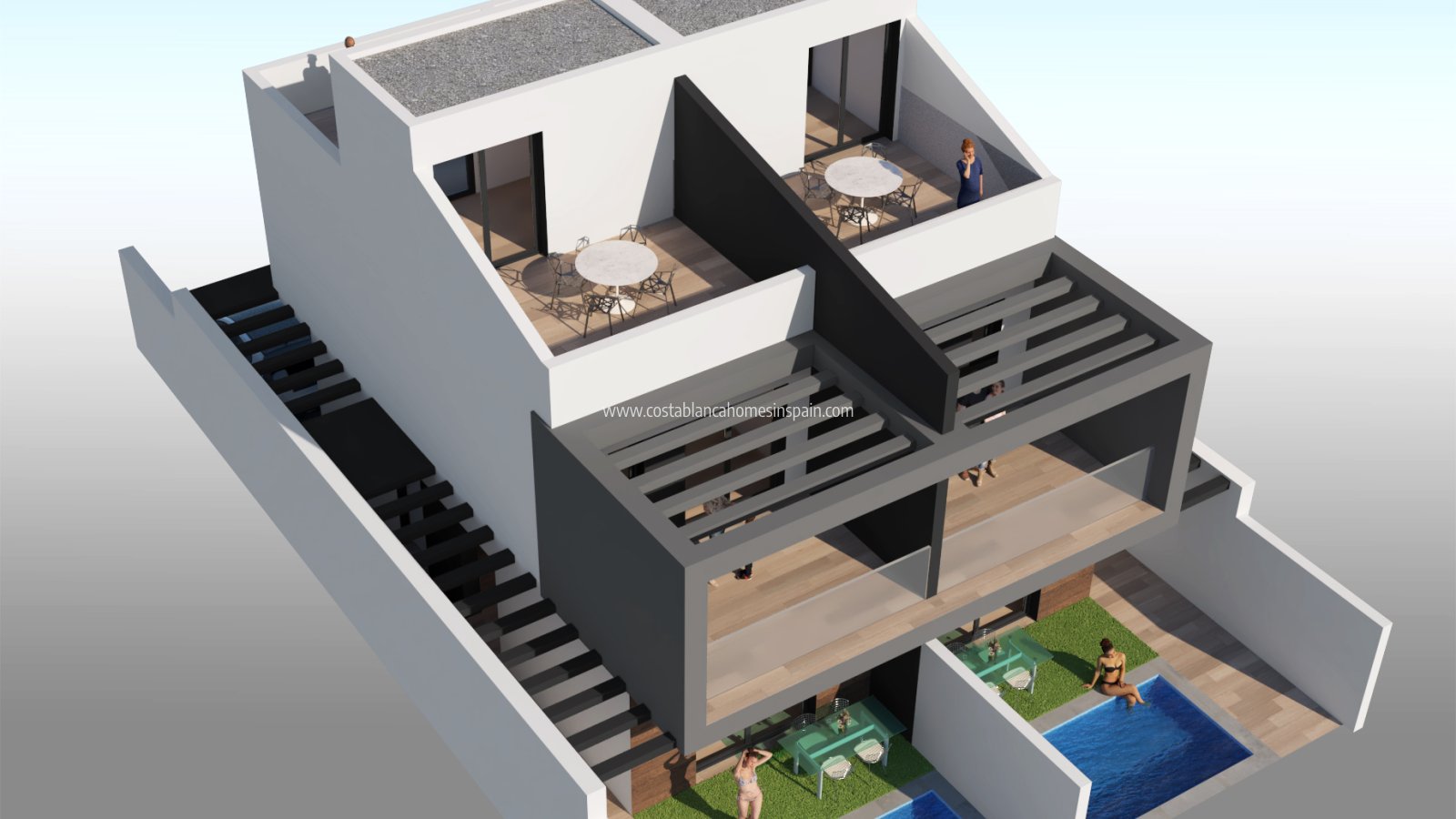 Utendørsområdene til disse rekkehusene i San Javier er designet for å maksimere nytelsen av middelhavsklimaet. Hver eiendom har en privat hage, perfekt for å skape en personlig oase av ro. I tillegg har de en terrasse og et solarium, som tilbyr flere utendørsområder hvor man kan slappe av eller nyte sosiale sammenkomster. Inkluderingen av en pergola tilfører et snev av eleganse og funksjonalitet, og gir skygge og stil. For å fullføre opplevelsen har hvert hus et privat basseng, ideelt for å kjøle seg ned på varme sommerdager.