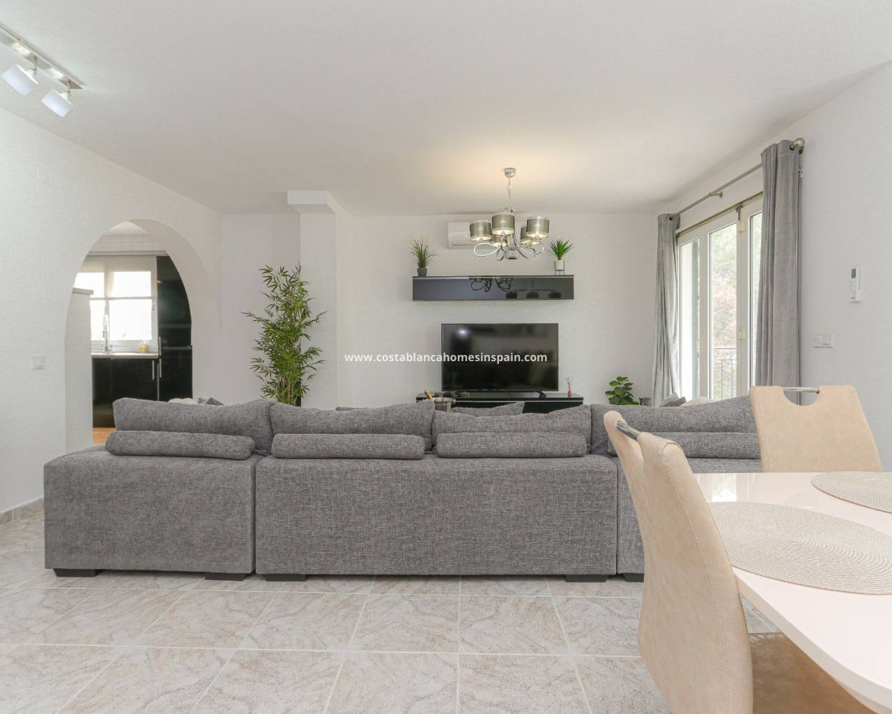 Fra denne etasjen fører en trapp opp til den lyse, romslige, fullt møblerte stuen som gir plass til spisebord med 6 stoler, BBQ-terrasse, det store kjøkkenet og et separat toalett.