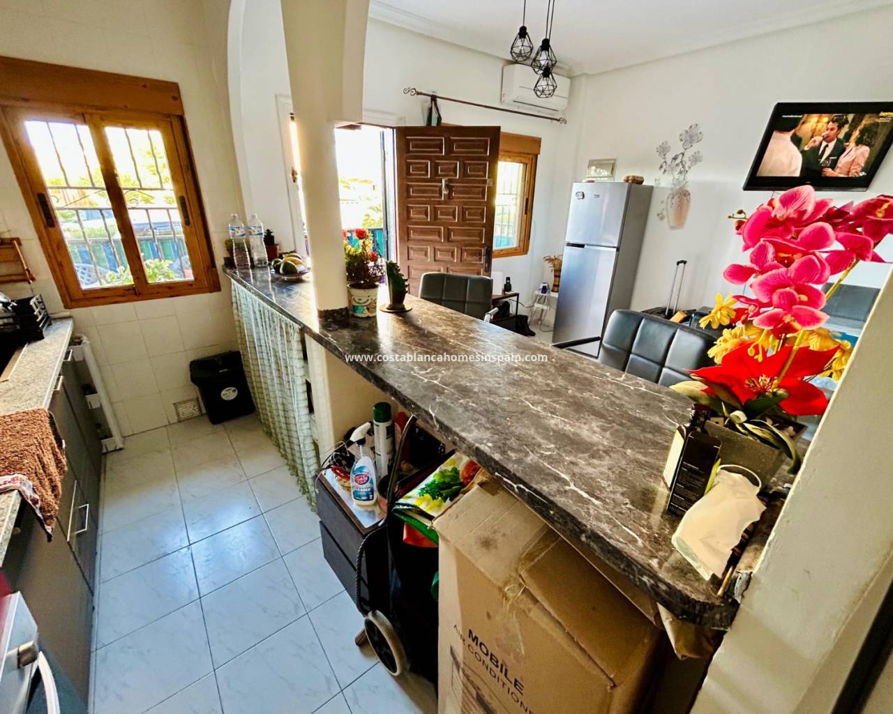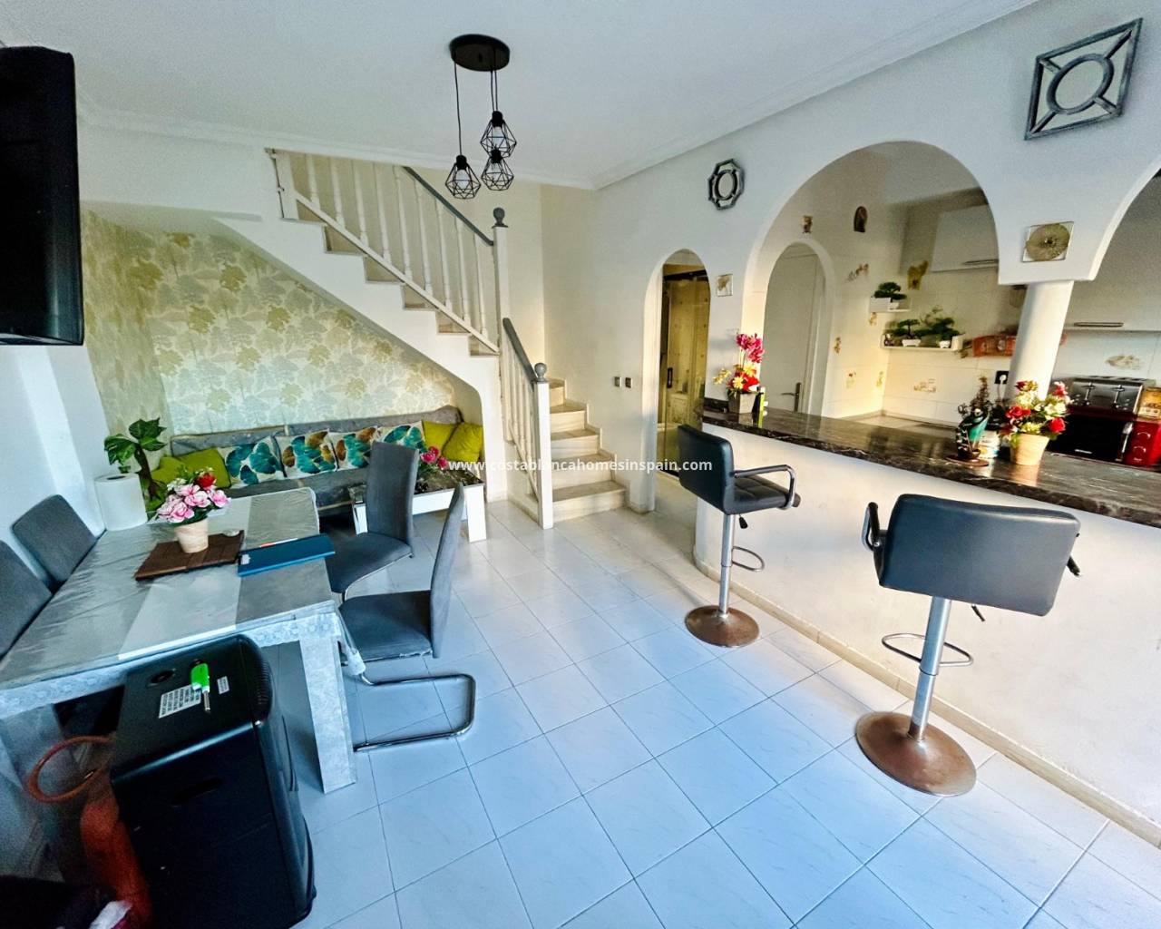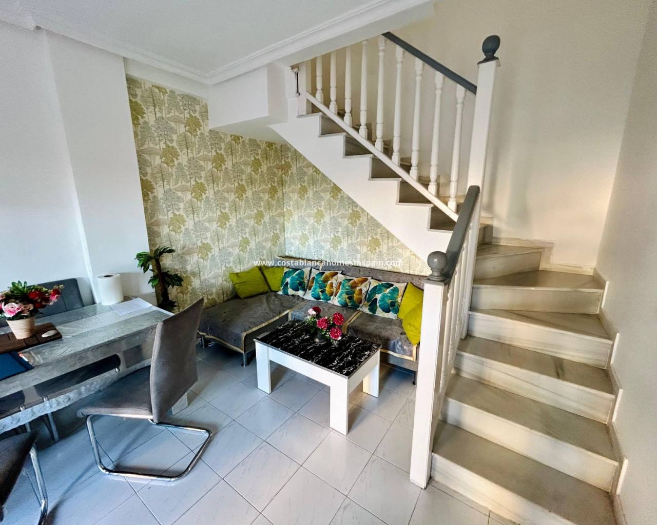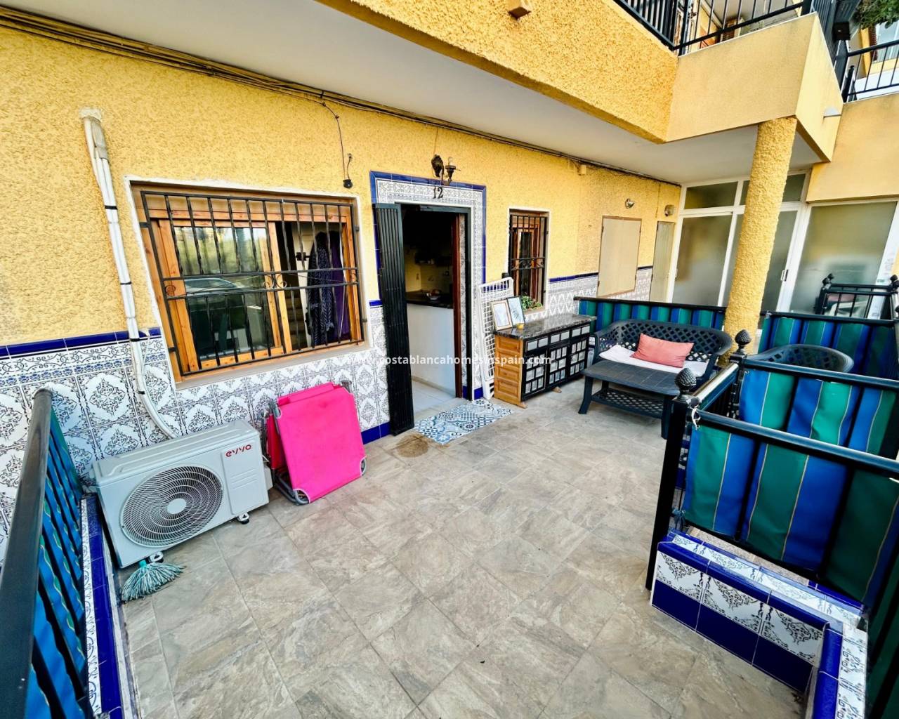 REFERENCE: 023 Property information The house is located on the ground floor where you are first met by a cozy terrace to the north with good space for e. g. outdoor furniture.Once inside, you are greeted by an open plan between a living room with space for a dining table and a fully equipped kitchen with plenty of storage. On this floor there is also access to a storage room where a washing machine and water heater have been placed. There is also a full bathroom with shower.One floor up we encounter two spacious bedrooms, one of which boasts a built-in wardrobe and a complete bathroom with bathtub.From both bedrooms you have access to a cozy balcony with a view of the street.Belonging to the residential area, there is a pleasant and appreciated communal pool area. VIDEO