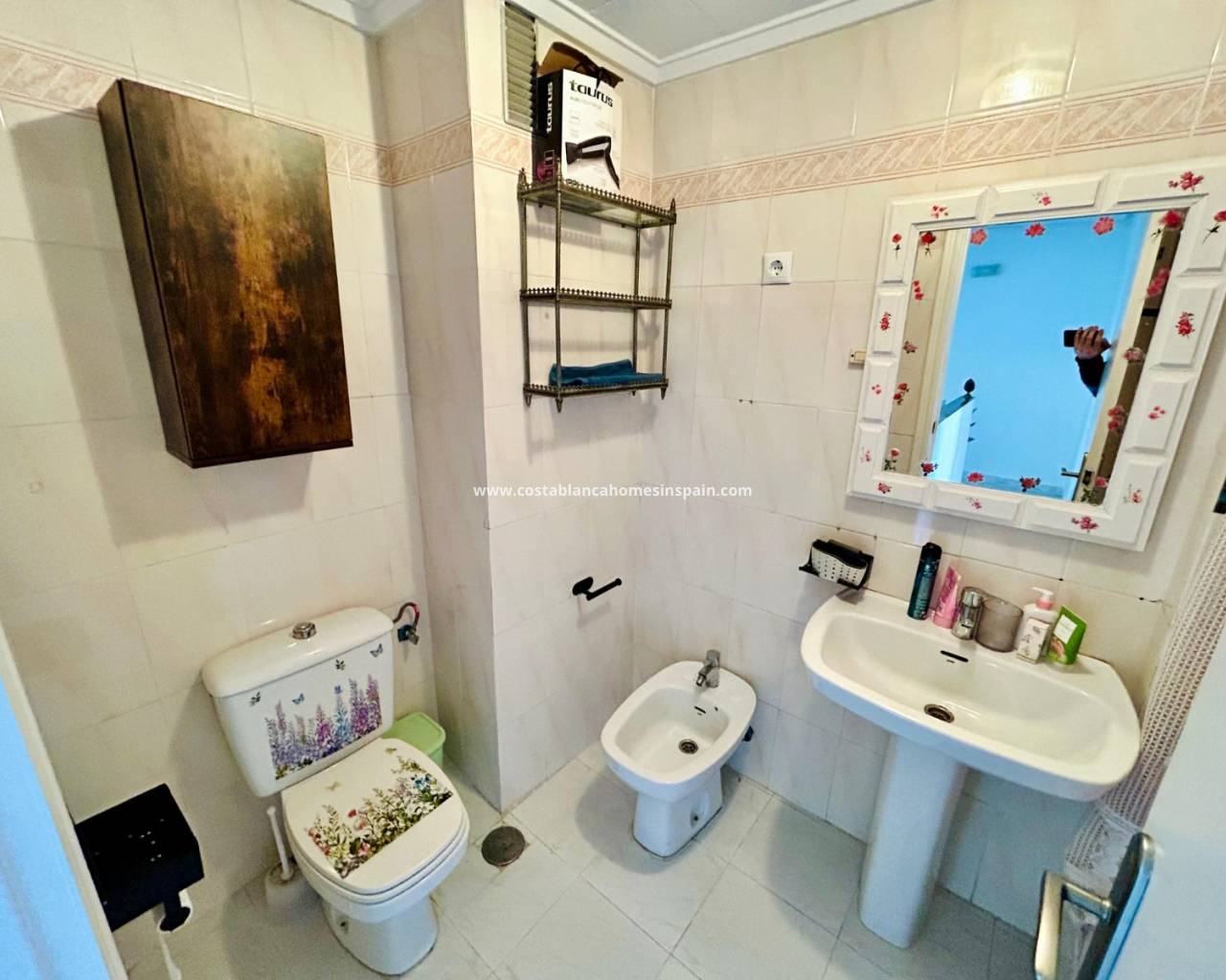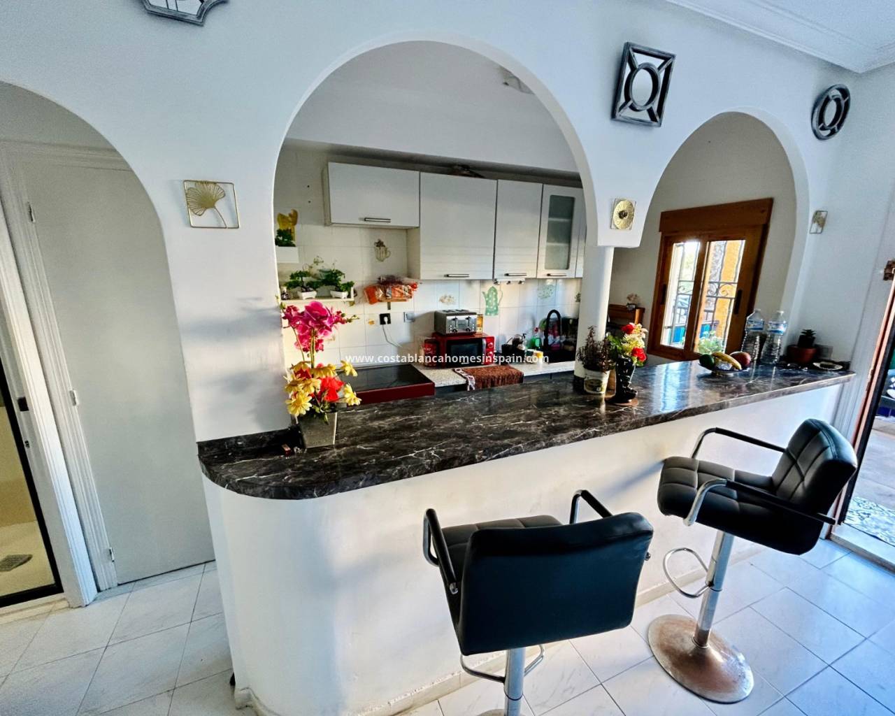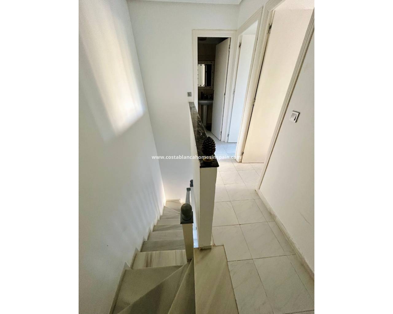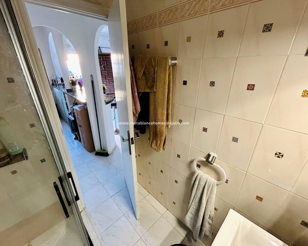 REFERENCE: 023 Property information The house is located on the ground floor where you are first met by a cozy terrace to the north with good space for e. g. outdoor furniture.Once inside, you are greeted by an open plan between a living room with space for a dining table and a fully equipped kitchen with plenty of storage. On this floor there is also access to a storage room where a washing machine and water heater have been placed. There is also a full bathroom with shower.One floor up we encounter two spacious bedrooms, one of which boasts a built-in wardrobe and a complete bathroom with bathtub.From both bedrooms you have access to a cozy balcony with a view of the street.Belonging to the residential area, there is a pleasant and appreciated communal pool area. VIDEO