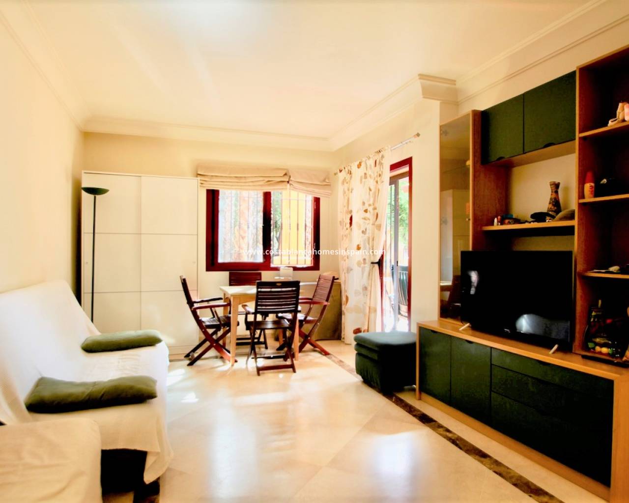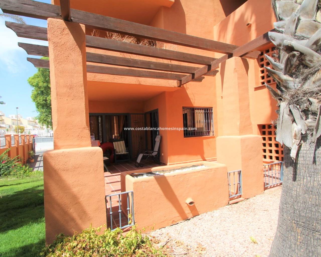 Spacious ground floor corner apartment next to Villamartin Golf South-east facing large terrace overlooking the luxury community gardensFully gated residential area with a tropical design community swimming pool areaOpen plan kitchen towards the dining and living area1 double bedroom with doors onto the private terraceOne complete bathroomA garage space with storageThe apartment is kept in superb condition has marble floors, high-quality double-glazed windows and doors and ducted ACThe apartment comes equipped with top quality white goods and furnishedLocated 1km to Villamartin Plaza and Golf, 5km to La Zenia Beach and three more 18-hole golf courses. CEE: pending Yearly tax bill: 300 € Community fees: 1.344 € Price: 244.000 €