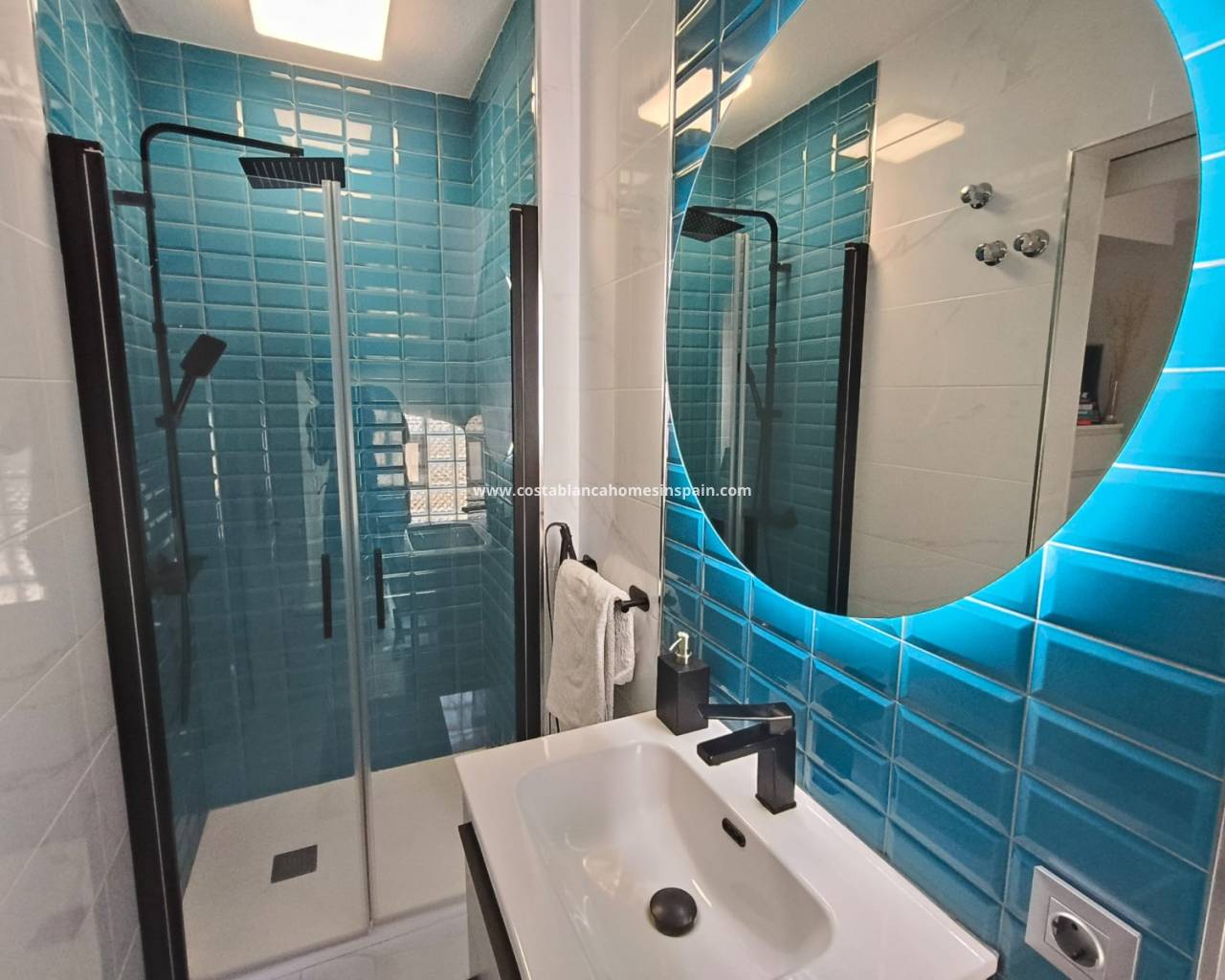The property is distributed over 2 floors with the ground floor comprising of a large L-shaped garden with gated driveway, storage room, enclosed porch area, living-dining room with fireplace, newly fully fitted kitchen, and one double bedroom with fitted wardrobes and modern shower room. On the first floor, you will find the master bedroom with a private balcony, a further double bedroom, and a fully reformed, stunning family bathroom. All the bedrooms have air conditioning and ceiling fans. From the second double bedroom, you can access the balcony and a further storage area. This property has central heating throughout and a fantastic sun drenched private solarium, with sea views.