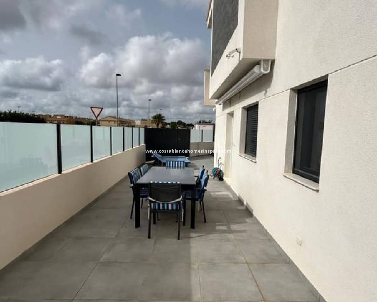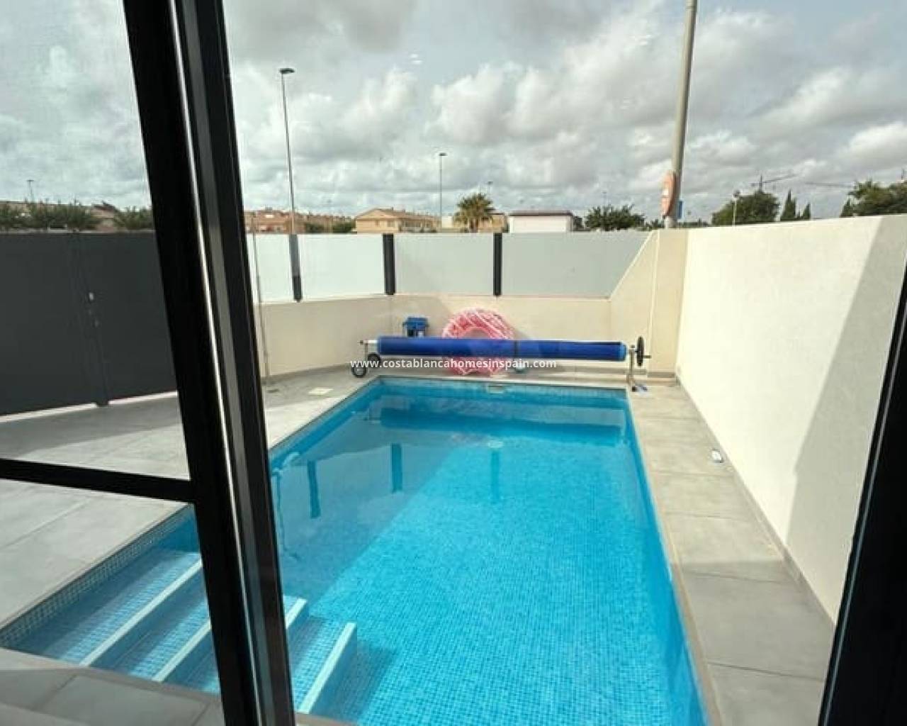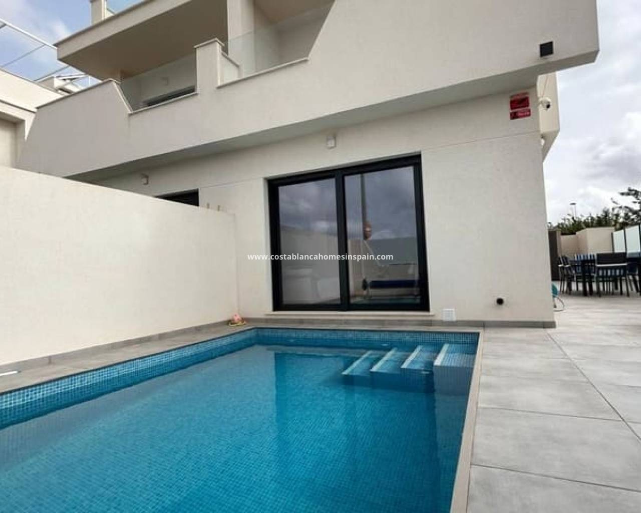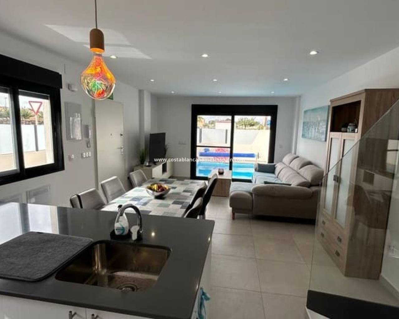 3 bedroom, 2 bathroom semi-detached south/east facing villa with private pool and private solarium in Santiago de la Ribera. Large plot with gated driveway leading to a large front terrace. The large swimming pool is to the front of the property and there is plenty of space for dining, sunbathing. The house has a large living room with views to the pool and a modern open plan fully fitted kitchen. Beyond the kitchen is a double bedroom with fitted wardrobes and a door leading to the side terrace. There is also a modern shower room on the ground floor. On the first floor are two double bedrooms with fitted wardrobes. The bedroom to the front of the house has access to a terrace. Also on this first floor is a modern shower room. There are stairs from the first floor leading you to your own private roof solarium with outdoor kitchen area. Another amazing outdoor living space. This house is only two years old and will be sold fully furnished. It's within walking distance to the beach and a short drive to the Dos Mares shopping mall and Pinatar retail park. Murcia airport is about a 30 min drive and Alicante is about a 1 hour drive. There is also some bars, cafes near to the property too. Santiago de la Ribera is a beautiful city on the banks of the Mar Menor. It is the coastal area of the city of San Javier and started as a simple fishing village. It has now become a popular holiday destination, attracting not only Spaniards but also tourists from all over Europe. Santiago has a modern feel, although it still retains its 'fishing village' atmosphere. It has a very beautiful promenade with majestic palm trees and 2 kilometers of beautiful sandy beaches. From here you can take a boat trip across the calm waters of the Mar Menor, to the La Manga Strip on the other side. The main shopping area is really in the town of San Javier, but there are some shops in the narrow streets to browse, try it on a Wednesday morning when there is a large street market.