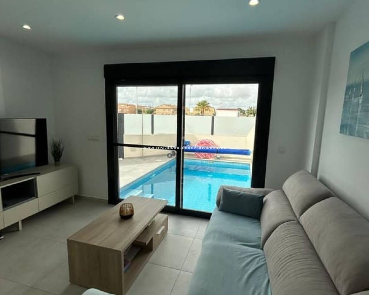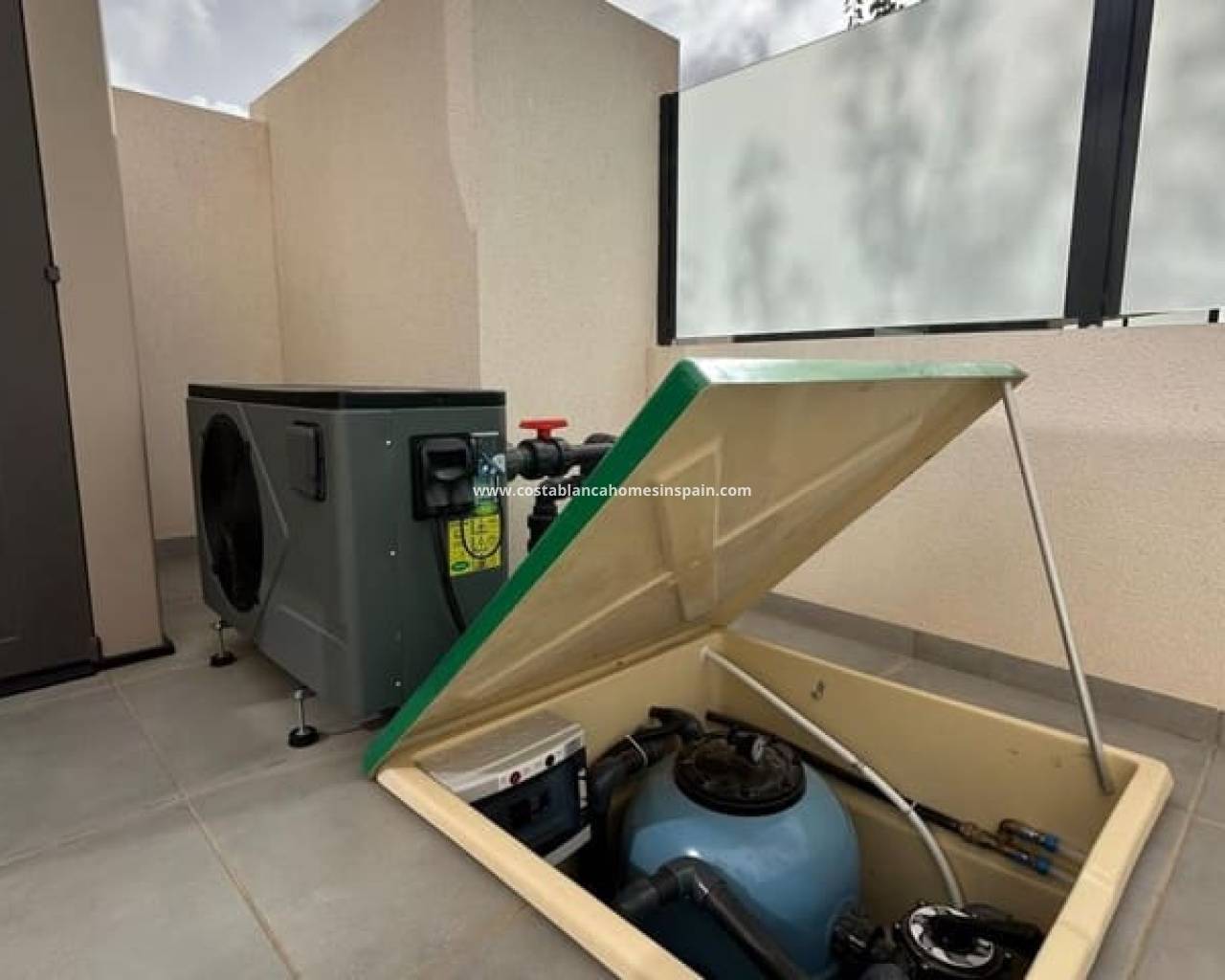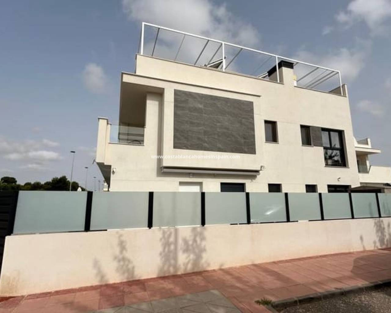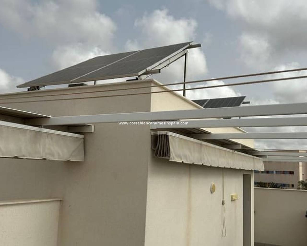 3 bedroom, 2 bathroom semi-detached south/east facing villa with private pool and private solarium in Santiago de la Ribera. Large plot with gated driveway leading to a large front terrace. The large swimming pool is to the front of the property and there is plenty of space for dining, sunbathing. The house has a large living room with views to the pool and a modern open plan fully fitted kitchen. Beyond the kitchen is a double bedroom with fitted wardrobes and a door leading to the side terrace. There is also a modern shower room on the ground floor. On the first floor are two double bedrooms with fitted wardrobes. The bedroom to the front of the house has access to a terrace. Also on this first floor is a modern shower room. There are stairs from the first floor leading you to your own private roof solarium with outdoor kitchen area. Another amazing outdoor living space. This house is only two years old and will be sold fully furnished. It's within walking distance to the beach and a short drive to the Dos Mares shopping mall and Pinatar retail park. Murcia airport is about a 30 min drive and Alicante is about a 1 hour drive. There is also some bars, cafes near to the property too. Santiago de la Ribera is a beautiful city on the banks of the Mar Menor. It is the coastal area of the city of San Javier and started as a simple fishing village. It has now become a popular holiday destination, attracting not only Spaniards but also tourists from all over Europe. Santiago has a modern feel, although it still retains its 'fishing village' atmosphere. It has a very beautiful promenade with majestic palm trees and 2 kilometers of beautiful sandy beaches. From here you can take a boat trip across the calm waters of the Mar Menor, to the La Manga Strip on the other side. The main shopping area is really in the town of San Javier, but there are some shops in the narrow streets to browse, try it on a Wednesday morning when there is a large street market.