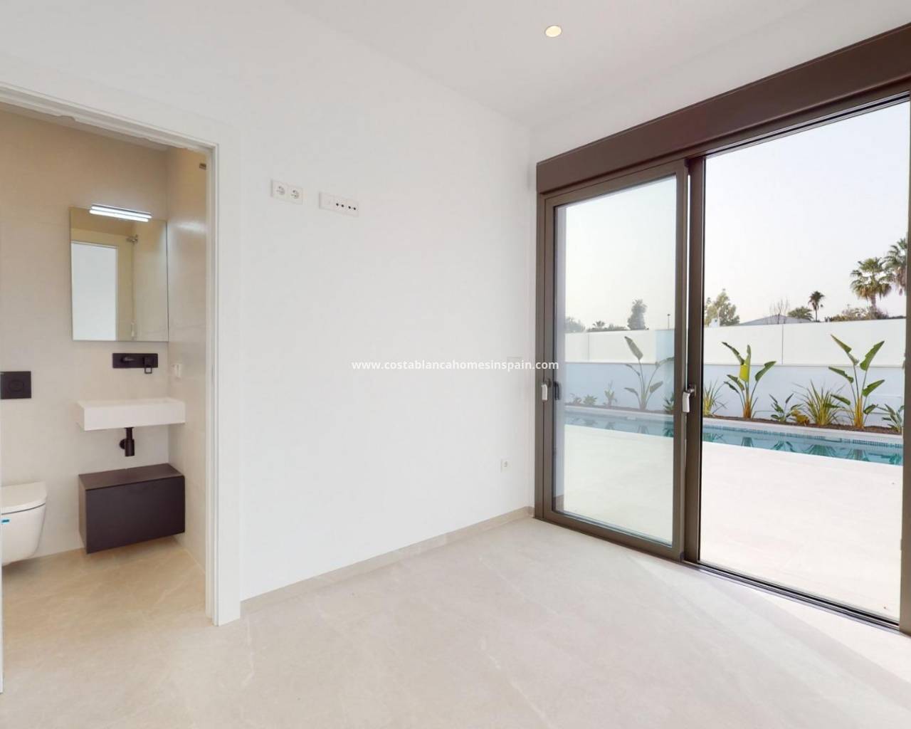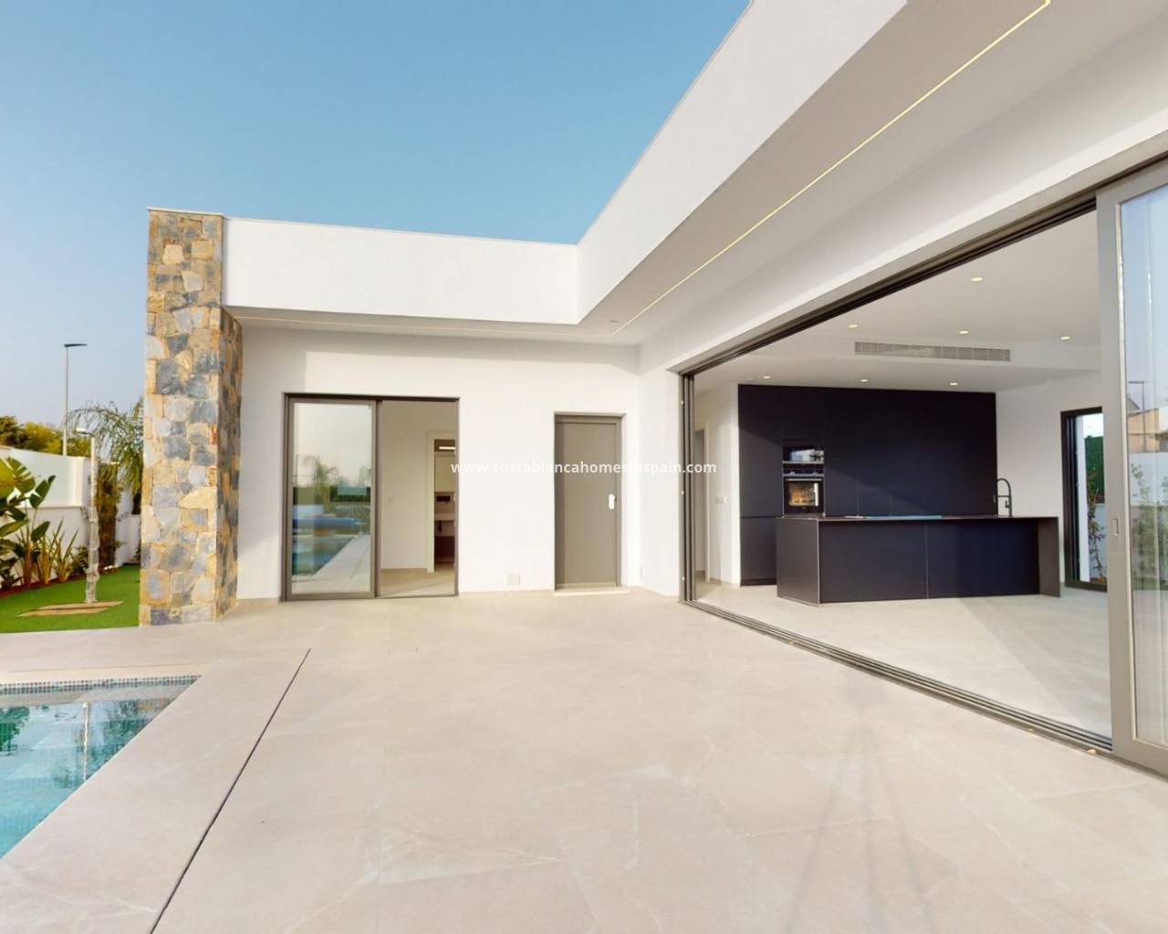 NEW BUILD VILLAS IN LOS ALCAZARES New Build residential of villas and townhouses in Serena Golf, Los Alcazares. Modern villas has 3 bedrooms, 3 bathrooms, open plan kitchen with living area, terrace, solarium, private garden with the pool and parking space. Fully fitted kitchen in white gloss or wood colour. Technological technological quartz. Stainless steel sink. Induction hob with integrated extractor fan, oven, microwave, washing machine, integrated refrigerator, integrated dishwasher. Air conditioning: Complete installation with FUJITSU ducts. Swimming pool: Dimensions according to the property, with steps, blue ceramic tiles and white LED lighting. Pre-installation for heat pump. La Serena Golf is located in the municipality of Los Alcázares, occupying an area of 60 hectares on the edge of the Mar Menor, a perfect natural environment to enjoy the best climate in Europe. Los Alcázares located in the Region of Murcia near the beaches of Mar Menor, where you can practice various water sports, surrounded by several golf courses. Here you can practice various water sports, surrounded by several golf courses and the city of Cartagena less than 15 minutes by car and 22 km from Murcia airport, therefore having a wide cultural, gastronomic and sports offer within reach.