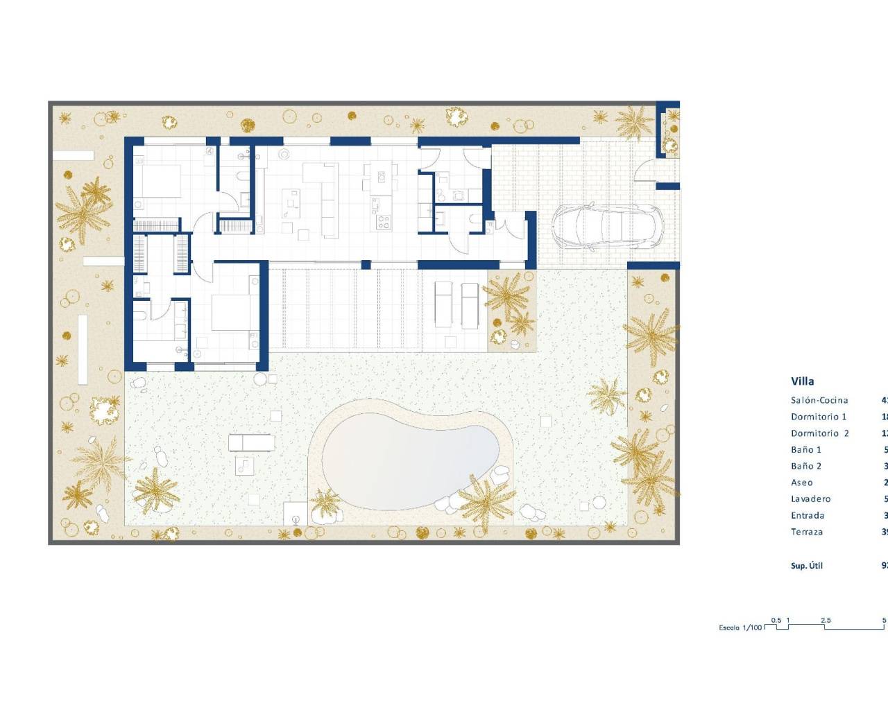 NEW BUILD VILLAS IN ALTAONA GOLF RESORT, MURCIA New Build residential of beautiful villas in Altaona Golf resort, Murcia. New Build villas with open plan kitchen, 2 bedrooms, 2 bathrooms, guest toilet, terrace, private garden with pool and parking space.. Features: • The properties have Energy Certificate Rating A. • Ducted air conditioning installation with heat pump. Throughout the house except for bathrooms. • Electric underfloor heating in the living room and bathrooms with individual thermostat per zone. • Air renewal system in the kitchen, bathrooms, laundry room, and guest toilet. • Kitchen Includes extractor hood and electric induction hob with 3 cooking points. • Includes LED lighting in the living room, hallway, and exterior. The rest of the rooms are prepared for the future owner to install their lighting. • USB sockets in all bedrooms. • Electronic intercom for access from the exterior to the interior path. Doorbell at the property entrance. • Home automation system with two smart switches. • Private landscaped garden with drip irrigation system and the pool. • Exterior fencing of the urbanisation. • Vehicle access gates to the urbanisation: Metal sliding gate with remote opening system Residential located in Altaona Golf just 15 minutes by car from the centre of Murcia capital and 20 minutes from the beaches you can enjoy the tranquillity and security offered by the Golf Course that has 18 holes and the comfort to live close to all services. Murcias airport Corvera only 15 minutes drive away.
