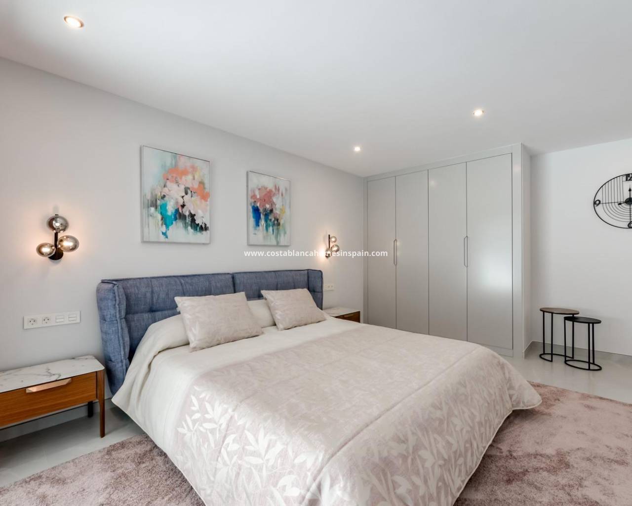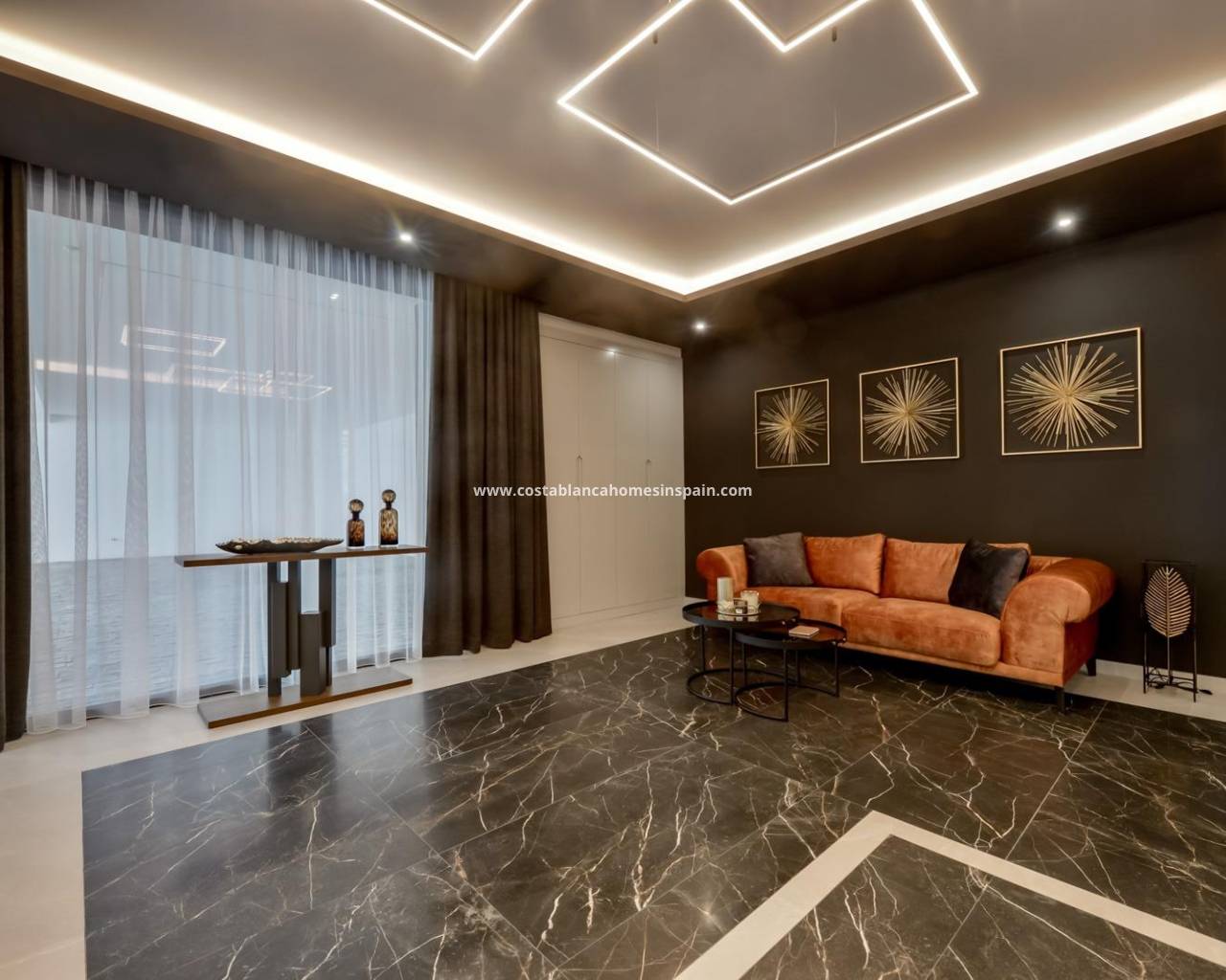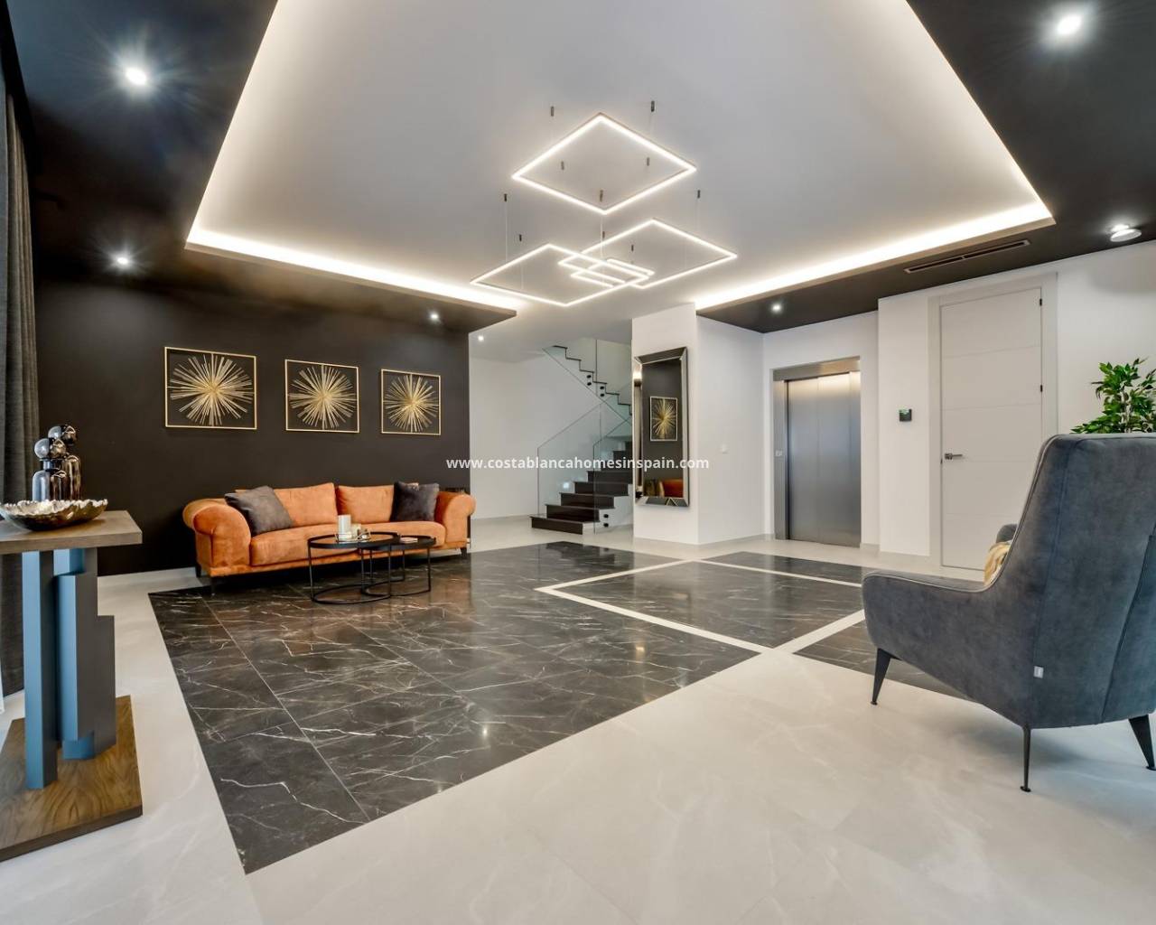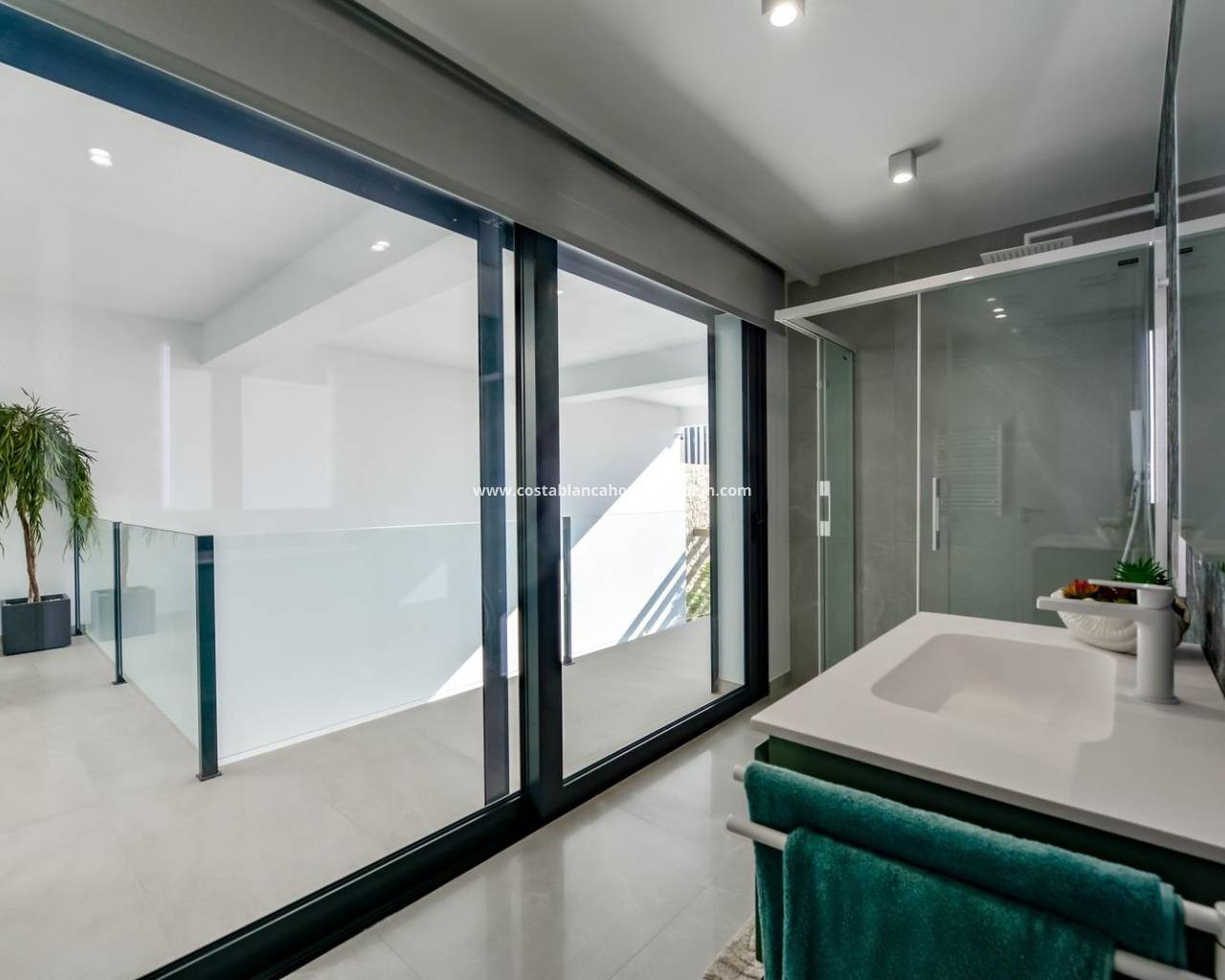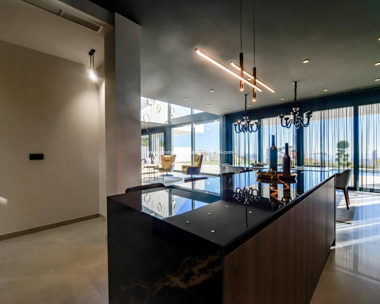 NEW BUILD LUXURY VILLA IN FINESTRAT WITH THE SEA VIEWS New Build Luxury villa with the sea views in Sierra Cortina, Finestrat. Arriving at the Urbanisation there is a natural stone wall with a height of 7 metres and the automatic access gates to the villa arriving at the covered garage at street level with double height, natural light and garden with palm trees of different heights of 180 m2, a glazed room of 78 m2 with lift, interior staircase, cloakroom and enough space to put armchairs, convert this space into an office or simply a waiting room for visitors. The next floor of 190 m2 of enclosed space is located below the plot level but 3 metres above the street level and therefore with natural light. It can be accessed by lift or staircase inside the villa, or by the staircase outside the garage, in the latter case you can only access the exterior corridors, the installations room or the main door of this floor, thus making the maintenance of the house without the need to enter inside the house. Inside this floor we will find 4 spacious bedrooms, living room with English patio of 17 m2 with the stairs to the plot, laundry, 2 bathrooms, exterior corridors of 40 m2 and installations room. When we go up to the main floor by 3 access ways we see a living room of 130 m2 with double light, open kitchen, guest toilet, panoramic sea views, and swimming pool of 54 m2 of laminate, a beautiful garden and 2 large covered terraces. To the bedrooms floor we access by lift or interior staircase where we will see a Master Bedroom of more than 50 m2 with en-suite bathroom, dressing room and terrace, two bedrooms of about 20 m2 each one, a bathroom and the terrace for these bedrooms. Villa is equipped with Led exterior and interior, underfloor heating, domotics, high Gamma crystals, centralized air conditioning, automatic blinds, high ceilings and much more: Living room- 95 m2 Bedrooms- 8 (main 52 m2 and secondary 20 m2) Bathrooms- 5 Plot- 890 м2 Built- 998 м2 Swimming pool- 12 X 5 Four Floors Garden (20 m2) - fully finished with automatic irrigation system Lift (Otis) inside the house Underfloor heating Domotics (control of air conditioning, underfloor heating, interior and exterior lighting, blinds) Electric blinds Exterior and interior lights brand name Siemens High ceilings up to 3,20 m high Impressive sea view One floor for guests Aerothermal heating Fully fitted kitchen with island Fitted wardrobes Porcelain tiled floor Wall with natural stone hand carved Garage for 4 vehicles with automatic doors 160 m2 + entrance hall 78 m2 Open parking 37 Villa located in the Sierra Cortina resort complex, next to two golf courses, theme parks, a large shopping centre and a few minutes from the beaches of Benidorm. Finestrat located in the Marina Baixa region of the Costa Blanca, close to neighbouring Benidorm and about 40 kilometres from the city of Alicante and the international airport. The village is situated on the mountainside of Puig Campana and offers beautiful views of the mountains, the coast and the Mediterranean Sea.