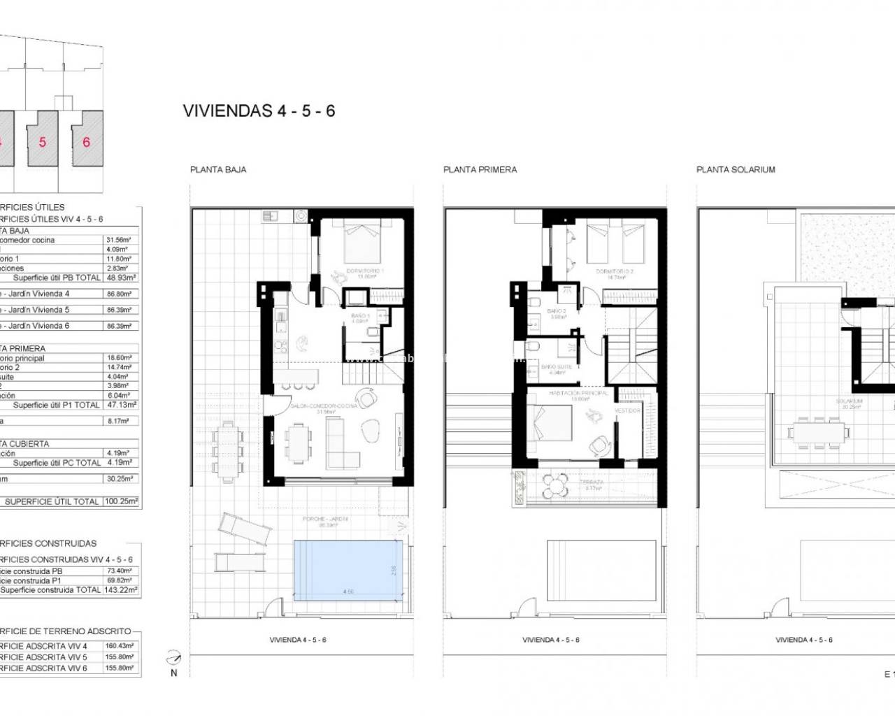 NEW BUILD VILLAS IN SAN PEDRO DEL PINATAR New Built modern villas located near the centre of San Pedro del Pinatar. Villas build over 2 floors, has 3 bedrooms, 3 bathrooms, open plan kitchen with the lounge area, fitted wardrobes, private garden with the pool and off road parking space, private solarium. From the living room you have direct access to the terrace and the pool. Villas comes with pre-installed ducted A/C, LED lighting package, motorized blinds, appliance package, intercom, aerothermic hot water system and private pool. Nearby you will find supermarkets, restaurants, shops and pharmacies. Within a short drive you can reach several golf courses or the shopping centre Dos Mares. The beautiful beach of Lo Pagan is a few minutes away. San Pedro del Pinatar's privileged location on the Mar Menor and Mediterranean coastline it attracts those with an interest in sailing and water sports, providing marina mooring and sailing clubs, while the beaches and natural mud baths attract those seeking safe sun, sea and sand. San Pedro del Pinatar has an established community and offers an excellent range of activities, including covered swimming pool and sports facilities, as well as a year round programme of social activities by the pleasant winter weather. The benefits of the mud baths, typical of the region, or the calm waters of the Mar Menor, have favoured the growth of Lo Pagán, wich currently has all kind of amenities. In addition, it has an excellent location, just 5 minutes from the Comercial Center Dos Mares