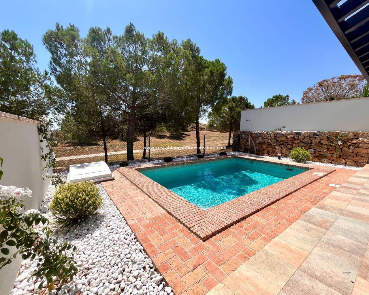 Elegant One-Level Townhouses with Private Pool in Peraleja Golf Resort – Costa Cálida Mediterranean-Style Townhouses in a Gated Golf Community Discover 11 exclusive single-storey townhouses located in the prestigious Peraleja Golf Resort, in the Murcia region of southern Spain. These modern Mediterranean homes are set on spacious plots of approximately 260 m², each offering a private pool, landscaped garden, and on-site parking. Designed with sloped ceilings and natural materials like wood and stone, these houses blend seamlessly with the surrounding landscape while offering stylish, timeless interiors. Comfortable Living with Premium Finishes Each house features: 2 bedrooms and 2 bathrooms Open-plan kitchen fully furnished with appliances Bright living-dining area with a cozy wood-burning fireplace Centralized air conditioning and gas radiator heating Reinforced front door and motorized vehicle access gate Private pool (3.5x5.5 m) with outdoor shower Exterior water and lighting points Fully landscaped garden ready to enjoy These properties have been carefully designed by a renowned architect, combining elegant lines with natural textures, creating a unique and harmonious environment within a secure gated community. Life in Peraleja Golf Resort – Nature and Security The houses are located within the Peraleja Golf Resort, which features a 24-hour security gate, piano bar, and clubhouse with a gourmet restaurant. The resort is surrounded by protected natural areas where walking, jogging, and cycling circuits are being developed for residents. The 18-hole golf course, originally designed by the legendary Severiano Ballesteros, is currently under renovation and scheduled to reopen by the end of 2025. Select homes and the social club enjoy distant sea views. Convenient Location Near Beaches and Cities This peaceful resort offers excellent access to key locations: Sucina and Avileses towns – 3-5 km Mar Menor beaches – 20 km (20 min by car) Murcia city – 25 km (20 min by car) Murcia Airport (RMU) – 25 km (15 min by car) Alicante Airport (ALC) – 80 km (45 min by car) La Zenia Boulevard Shopping Center – 35 km Enjoy the Charm of Costa Cálida Located near the traditional Spanish town of Sucina, residents can enjoy local shops, restaurants, and authentic charm, while still being close to the coast and vibrant city life. This area has become increasingly popular with international buyers for its quality of life, good infrastructure, wonderful weather year round and access to nature spots and the sea. Contact us today to secure your dream villa at Peraleja Golf and start enjoying life on the Costa Cálida!