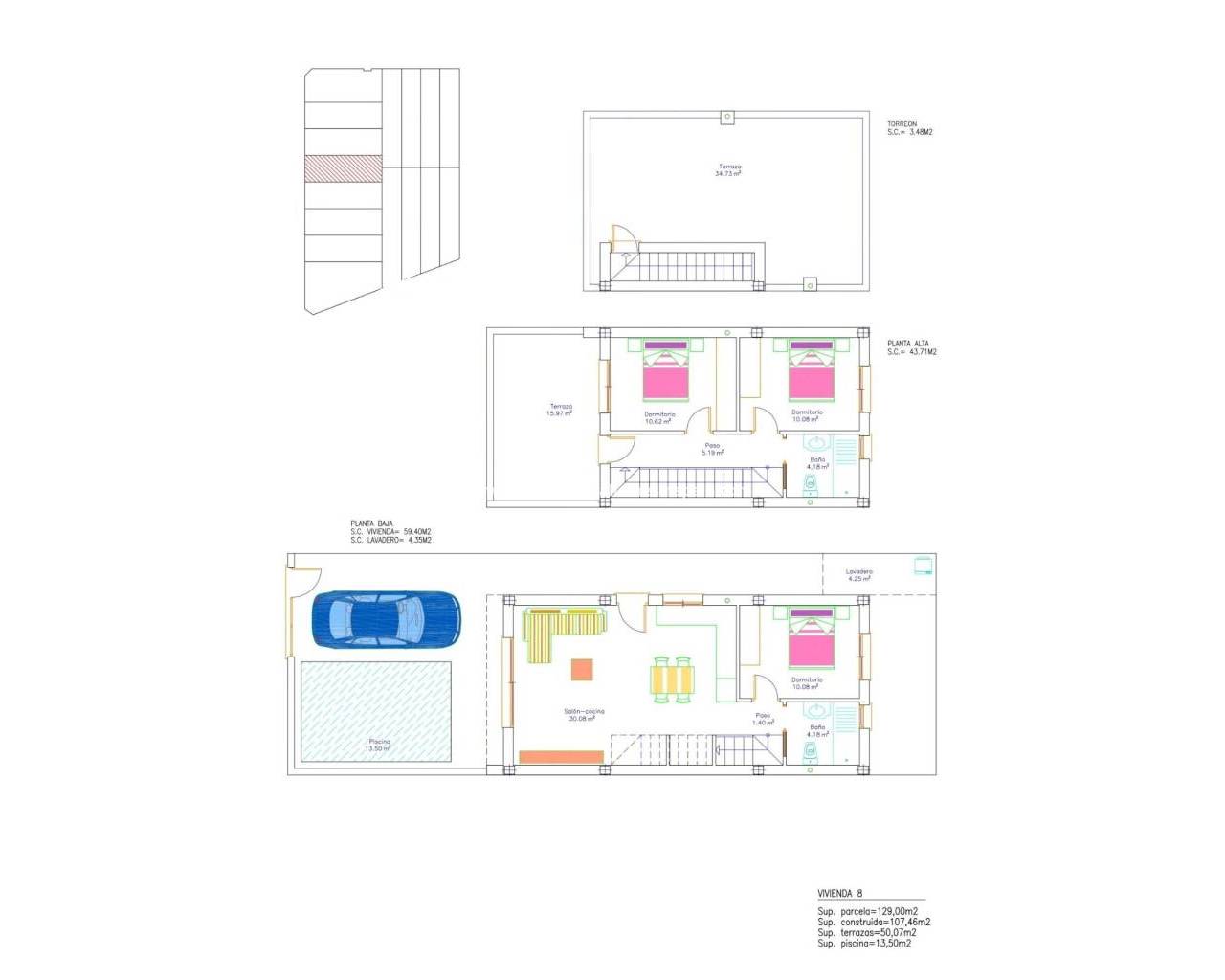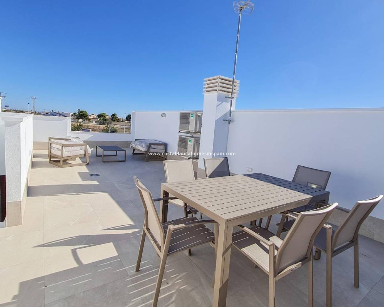 NEW BUILD VILLAS IN SAN PEDRO DEL PINATAR New development of villas and townhouses in San Pedro del Pinatar, Murcia. Luxury residential complex made up of 16 townhouses and detached villas, all with private swimming pool, terrace, solarium and parking space within the plot. Each property has 3 bedrooms and 2 complete bathrooms, as well as a dressing room in the master bedroom. The properties have been designed with a contemporary style and an open concept, consisting of a fully fitted kitchen and a living-dining room. The development is located in San Pedro del Pinatar, Murcia, surrounded by all amenities, sports facilities, close to several golf courses and 5 minutes from the Mediterranean Sea and the beaches of the Mar Menor. The property will meet the highest standards and will be equipped with: Private swimming pool with LED lighting and outdoor shower. Fully fitted and equipped kitchen with oven and microwave in column, built-in dishwasher and fridge freezer, ceramic hob and extractor hood. LED lighting: inside the property (dining room, kitchen, corridors and bathrooms), as well as in outdoor areas. Motorised blinds in living room and master bedroom. Dressing room in master bedroom, with shelves, drawer unit, pull-out bars and mirror. Wardrobes lined with drawers. Complete bathrooms with washbasin unit, wall-hung toilet with built-in cistern, mirror, rain-effect shower and screens. Pre-installation of underfloor heating in bathrooms. Pre-installation of air conditioning ducts. Pre-installation of solar panels. Solarium. Parking inside the plot. San Pedro del Pinatar's privileged location on the Mar Menor and the Mediterranean coast attracts those with an interest in sailing and water sports, providing moorings at the marina and sailing clubs, while the beaches and natural mud baths attract those seeking sun, sea and sand for safety. The benefits of the mud baths, typical of the region, or the calm waters of the Mar Menor, have favoured the growth of Lo Pagán-San Pedro del Pinatar, which now has all kinds of amenities. It also has an excellent location, just 5 minutes from the Dos Mares Shopping Centre. Murcia/Corvera airport is 30 minutes away and Alicante airport is an hour's drive away.