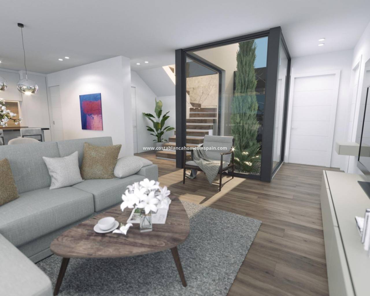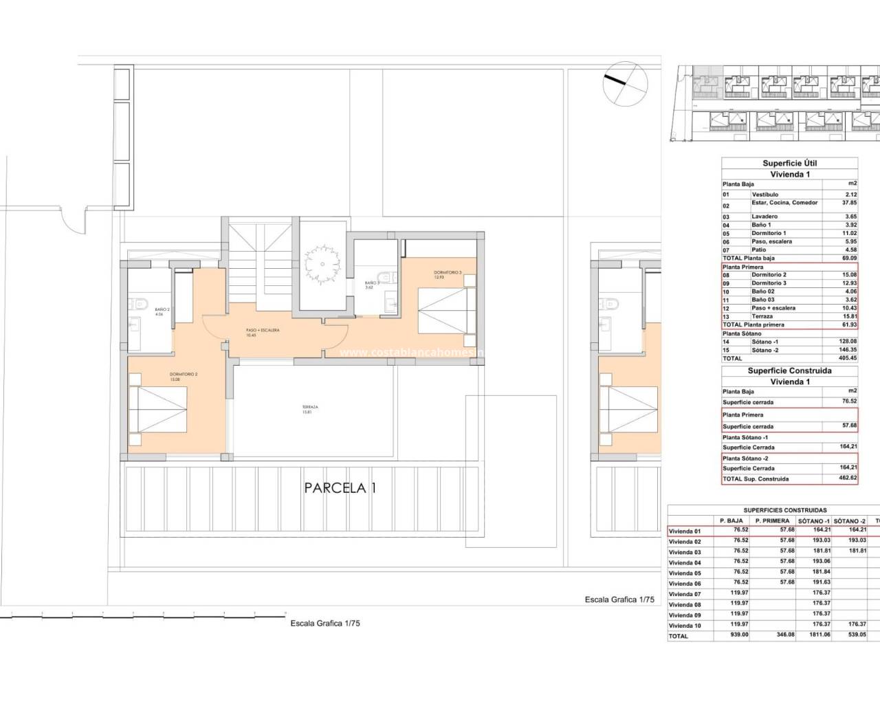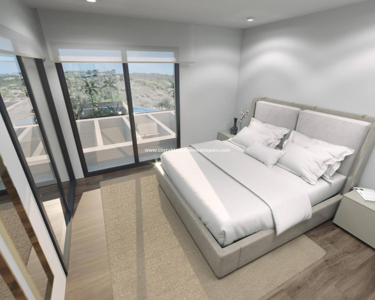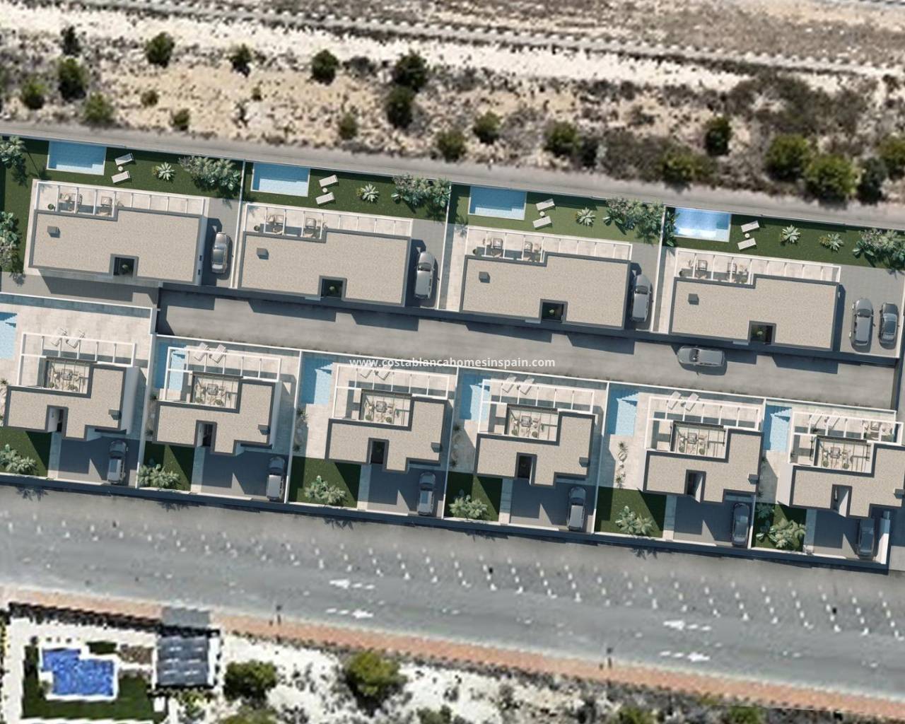 NEW BUILD VILLAS IN FINESTRAT New Build project of 10 modern design villas, in a natural setting with views of the sea and the mountains, near the Puig Campana golf course, and a short distance from the towns of Finestrat and Benidorm. The project will be divided into two construction phases, which in turn include two types of homes, with 1 or 2 floors, 3 double bedrooms, 2 or 3 complete bathrooms, living-dining room with integrated kitchen, laundry room, large terrace and garden, private pool, outdoor parking, 1 or 2 multipurpose basements and in some models closed underground garage. An options for a solarium at an extra cost. Villas built with the best qualities and latest advances in construction, among others: - Glass railings that do not break the continuity of the views. - First quality porcelain stoneware flooring. - Armoured entrance door. - Aluminium exterior carpentry with thermal bridge break and double insulating glass with low emissivity with air chamber and safety in areas at risk of breakage. - Smooth interior carpentry, made of white lacquered wood with stainless steel handles and fittings. - Fully equipped sliding wardrobes and dressing rooms. - Production of domestic hot water through a heat pump system with a 100L accumulator tank, with the support of solar panels on the roof. - High-grade electrical installation 9.2kw. - Installation of air conditioning through ducts with machines included. - Minimalist design kitchens, fully equipped with island, furniture and appliances included. - Private pool with lighting and beach area with pavement or artificial grass. - Fully customisable multipurpose basement, depending on the model with a garage area for a vehicle and pre-installation for an electric vehicle. Villas is located in a privileged environment on the Costa Blanca, in an elevated area at the foot of the mountains, surrounded by nature and other similar urbanisations, with excellent views of the sea and its surroundings. Very well connected by road with the nearby town of Finestrat, 10 minutes by car from shopping censers, the A7 motorway, the beaches and the nearby towns of Benidorm and Villajoyosa, and 30 minutes from the city of Alicante and its international airport.