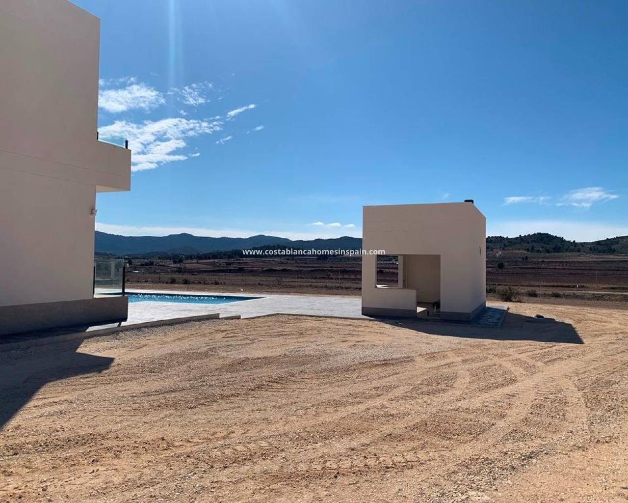 NEW BUILD VILLAS IN PINOSO You can choose Villas with traditional Spanish touches or super modern finishing, bright and clean. Different legal building plots available (rustic with minimum 10.000 m2), some walking distance to town, some totally private and our most popular ones are within 5-10 mins drive to a town. We have a plot for every taste, all with amazing views and all have mains water + electric included in the price and high speed internet available. From the biggest and best builder in the area and use top quality materials for a perfect finish. All houses include 2m stamped concrete terrace around the pool (colour and pattern to choose), 1m around the house, gated entrance, 3.000 m2 fencing, pre-installed ducted aircon, standard kitchen, security door, german tilt and turn windows (or sliding if prefered), built-in fireplace and chimney, pre-installation for tv and internet, gravel driveway plus a few meters around the house, septic tank. Bathrooms include a shower column, shower tray or bath, sink units (various colours to choose from) with sinks, taps and mirrors, plus a big selection of wall tiles. Wide selection of ceramic floor tiles, different colours, wood effect, etc. Kitchens include cabinets with standard doors and handles, as per plans provided, stainless steel sink and tap, pre-installation for oven, dishwasher, extractor. Various granite worktops to choose from included in the budget, other stone worktops available as extras. White goods not included. Marble staircase (cream, white, or grey) and railings included, plus railings for the front porch. Big fixed glass window on the staircase for extra light. Choice of tiles and steps design for swimming pool. Choice of the granite for the houses' exterior steps and window sils. You can customise the house to suit, most internal changes are free of charge, the houses can be extended and we can even build your own design. Upgrade to bigger pool, single or double garage, guest house, etc. at an extra cost. The beautiful and thriving town of Pinoso is approximately 45 minutes inland from Alicante and the white beaches of Costa Blanca and close to the Murcia, Alicante border It has a population of just under 8,000. Pinoso, also known as El Pinos is named after the pine trees that cover the areas mountain ranges. Pinoso provides a Spanish rural lifestyle, no traffic lights, hardly any traffic, practically the only jams are caused by the tractors taking the grapes to the Bodega. The fields are planted with vines, almonds and olives. In February the fields are filled with pink almond blossom. Pinoso has many bars, restaurants and shops, a new 24 hour medical centre, dentists, two primary schools and 1 secondary school, a theatre. There's an excellent Sports Centre with outdoor swimming pools, tennis courts, football pitches and gymnasium, library and many other facilities including a beautiful picnic area among the pines, complete with barbecues, seating areas and running water.