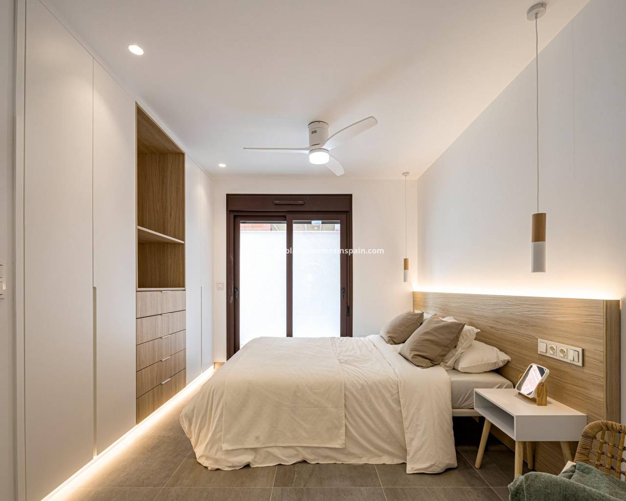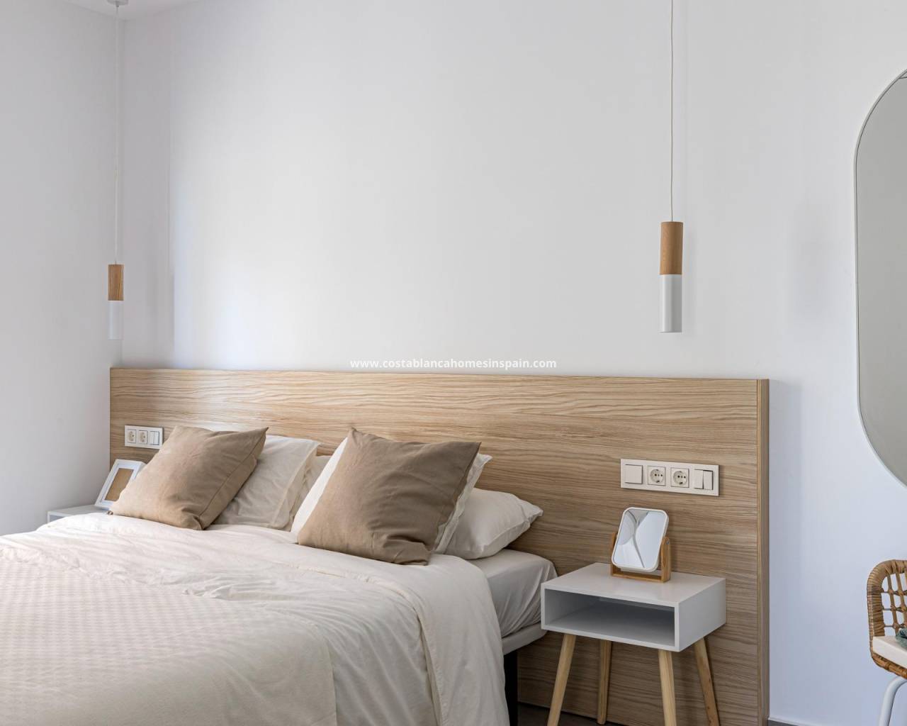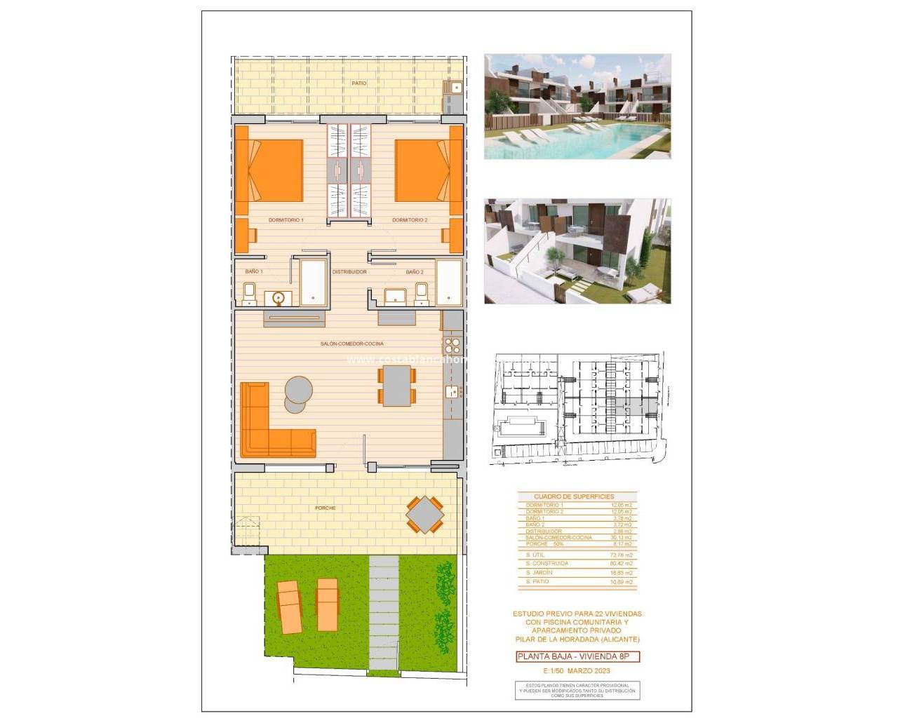 NEW BUILD RESIDENTIAL OF BUNGALOW APARTMENTS IN PILAR DE LA HORADADA New Build an exclusive residential complex made up of 22 top quality bungalow apartments with PORCELANOSA finishes in Pilar de la Horadada. Modern bungalows of 2 bedrooms, 2 bathrooms, open plan kitchen with living room, fitted wardrobes. The ground floor homes have a large garden finished in artificial grass and on the top floor you will enjoy the sun all year round on the terrace and solarium, as well as the communal area with swimming pool and a convenient parking space. Pilar de la Horadada is a typical Spanish village in the most southern part of the Costa Blanca. The large main street has supermarkets, lots of shops, restaurants and bars and some lovely squares. The beautiful beaches of Torre de la Horadada and Mil Palmeras with fine sand promenade is just 5 minutes away. The airports of Corvera (Murcia) and Alicante are respectively 40 and 55 minutes away.