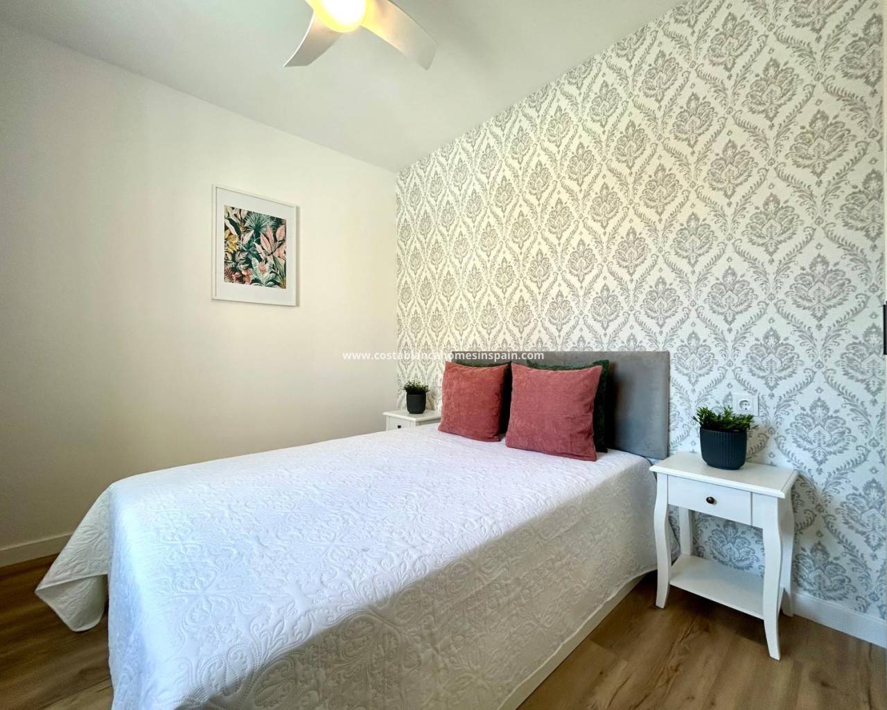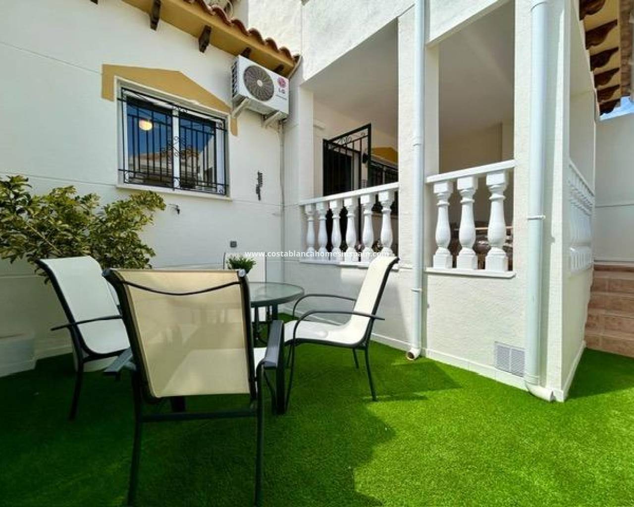 Completely renovated townhouse located in the quiet community of Los Naranjos, in Los Altos. The home has been completely renovated and is in impeccable condition, ready to move into. With a constructed area of 83 m2, it consists of three bedrooms and two full bathrooms, a living-dining room, a separate kitchen, and a covered front porch. The kitchen is equipped with all modern appliances, along with a laundry area. The home is spread over two floors and has a functional and modern design. Access to the home is via a private garden. Upstairs are two large double bedrooms, both with wardrobes, and a second full bathroom with a bathtub. The master bedroom faces south, providing natural light throughout the day. Air conditioning is installed in every room. It is being sold fully furnished, with quality furniture and everything necessary to move into (except personal belongings and decorative items). The residential complex offers a beautiful communal pool, and the home is located on a very quiet street with easy parking and a pleasant setting. The Consum supermarket and several restaurants are just 400 meters away, and the Punta Marina shopping center is a 15-minute walk away. Punta Prima Beach is 2 km away.
