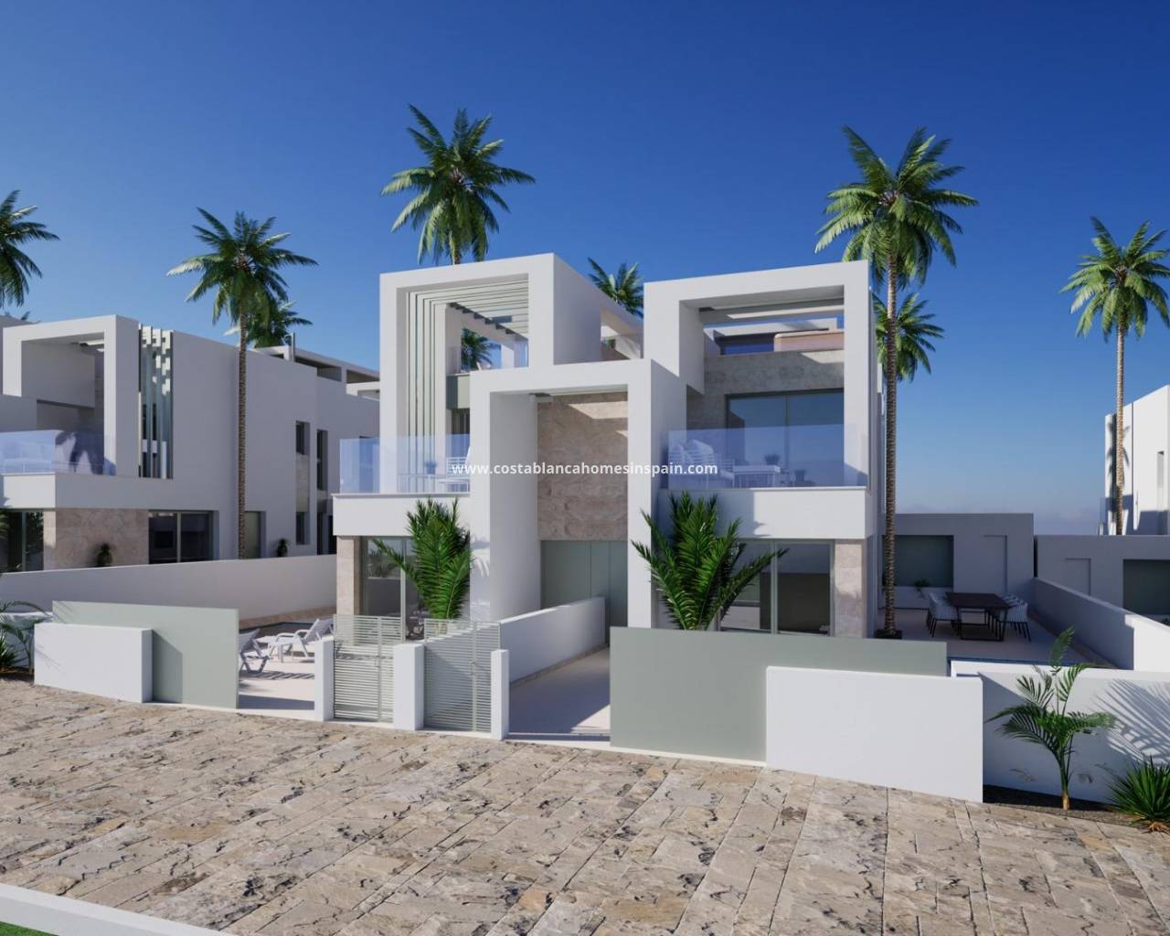 NEW BUILD VILLAS IN ROJALES New Project of modern quads and villas with private pools in Rojales. Modern properties has 3 bedrooms, 2 bathrooms, guest toilet, open plan kitchen with the lounge area, fitted wardrobes, solarium, private garden with the pool and off road parking space. Spaces designed to provide privacy and comfort, with large gardens that allow you to enjoy the outdoors in total tranquillity. Contemporary design with spacious bedrooms and bathrooms equipped with high quality finishes. Garden area ideal for family and friends gatherings with private swimming pool to enjoy the sunny days and outdoor toilet for added convenience when entertaining guests Large solarium and terrace: Spacious and well connected spaces to enjoy the Mediterranean climate and panoramic views. High standards in finishes and detailing: Top quality materials and a design with attention to detail, offering an elegant and welcoming atmosphere. Exclusivity and comfort in the Heart of the Mediterranean located in Rojales, Alicante, is a dream destination for those seeking quality of life, tranquillity and access to first class services. This exclusive residential area offers a perfect combination of modernity and nature, making it an ideal place to live. Strategically located in a well-established and high demand area, this location provides access to a complete urban infrastructure while retaining a natural and tranquil environment. Rojales located 15 minutes drive to some of the most beautiful beaches of Guardamar del Segura and Torrevieja. The proximity to these beaches offers a series of benefits and virtues that make living here a unique experience. In addition to daily enjoyment, living close to these beaches offers opportunities for an active and healthy lifestyle. Water sports such as surfing, paddle surfing and scuba diving are readily available, as are walks along the shore or hiking trails through the nearby dunes and natural parks. Main Airports: - Alicante-Elche Airport (ALC): About 38 km away, it can be reached in approximately 35 minutes by car. Murcia-Corvera Airport (RMU): Located about 65 km away, it can be reached in about 50 minutes by car. Road Network: - AP-7 motorway and the national road N-332 allow quick and convenient access to the main cities and tourist destinations in the region. Public Transport: - The area has regular bus services connecting Ciudad Quesada with nearby towns and main points of interest.