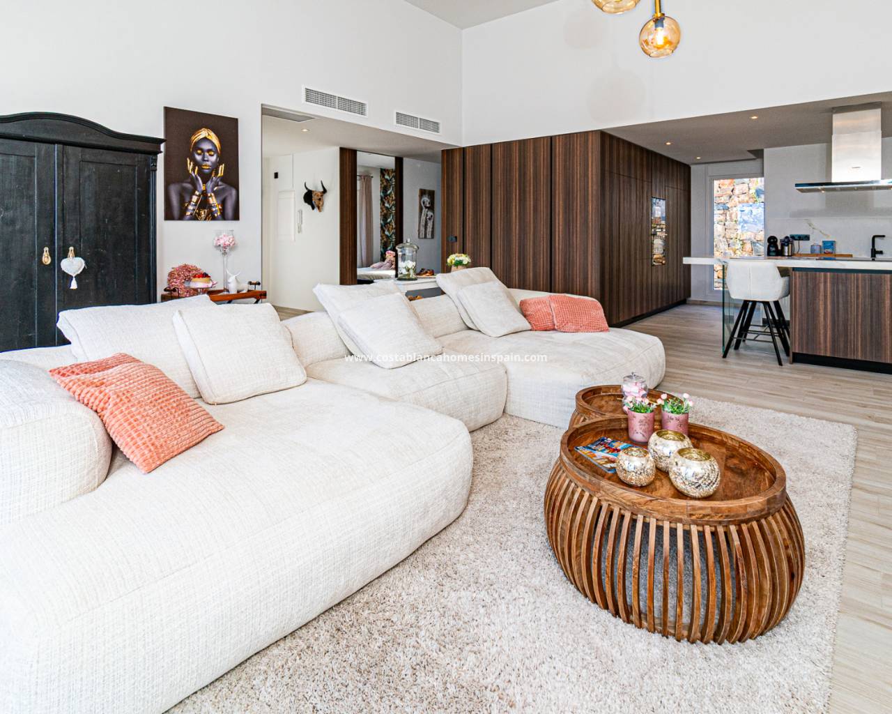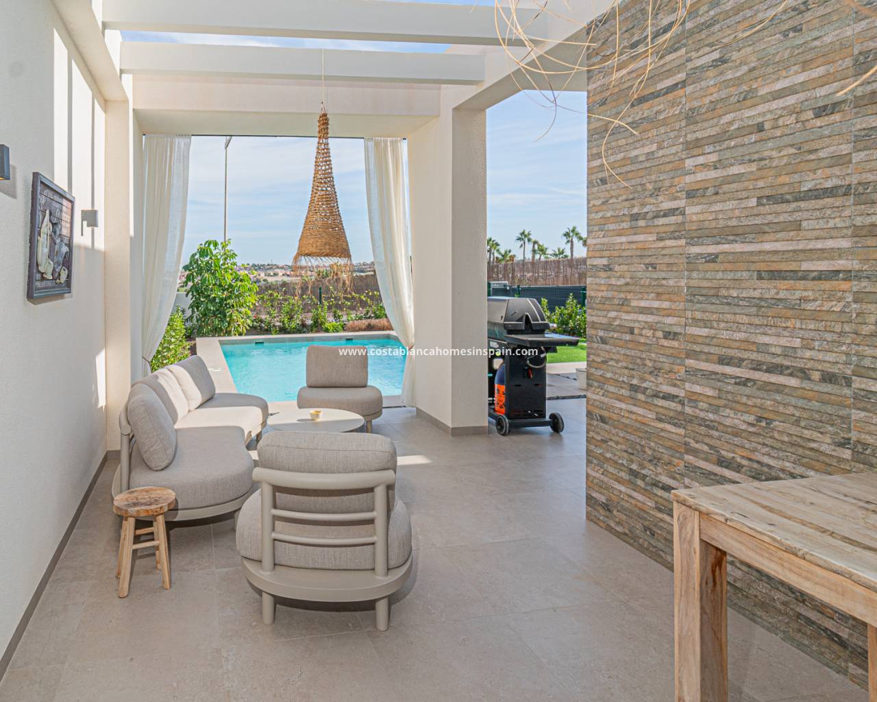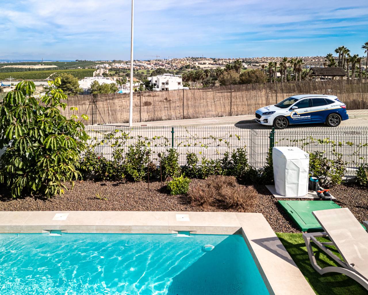 We are pleased to present this stunning luxury villa with panoramic views due to it´s elevated position at the 5 star La Finca Golf course. This impressive modern home is a perfect example of a resale of a new build without the wait and packed with luxury extras. The home offers a vast living/dining space, typically not seen in such homes, and offers the perfect area for leisure and entertainment, there is still ample space for a formal dining area or you can sit at the large island leading to the high end kitchen, which features floor to ceiling integrated cabinetry, ample work top space and top of the range white goods, plus leading out to a utility area and to the side patio terrace. The home offers 3 bedrooms, the master suite comprises a spacious double bedroom with patio doors to the garden and sun terrace, large walk in dressing room, with ample storage and floor to ceiling mirror, plus luxury shower room with his and hers sinks. The further 2 guest bedrooms both feature integrated wardrobes with ample storage space and share a further modern shower room. The whole home inside presents like a show room and has been made unique by the owners eye for detail and shows clearly their passion for interior design. Each piece and all decor has been lovingly chosen to integrate sympathetically with the wood and stone design, yet brings a touch of class to each room. The villa is set on a low maintenance plot of over 400m2 with sun terrace to the front offering some shade from the Spanish sun and is the perfect space for al fresco dining, likewise a sunny corner along with an summer kitchen/bar area offers the ideal spot for entertaining. The villa of course offers private swimming pool to cool off in the height of summer and the remainder of the plot is low maintenance with high quality tiles, gravel and artificial grass, a easy to access driveway offers secure gated parking, although there is ample quiet street parking outside the villa. Boasting stunning unobstructed mountain and country side views due to it´s elevated position this home offers everything a discerning buyer could wish for. This stunning villa will be sold part furnished although inventory can be discussed dependent on offers and is sold with many extras including integrated white goods, air conditioning, remote controlled blinds and gates, plus much more. Located a mere 200m to the La Finca Golf hotel Spa and club house , ideal for golf lovers for those extended holidays or ideal for permanent living as under 3km to both the traditional village of Algorfa which offers Spanish charm,local restaurants, bars, local shops and the traditional village square and the commercial area at La Finca also noted for some quality restaurants, cocktail bars and much more. Around 17km to the beaches of Guardmar del Segura , La Mata and Torrevieja, meaning you are never far from the coast. This home must be seen to be appreciated and is even more stunning in real life. Contact us today for your viewing