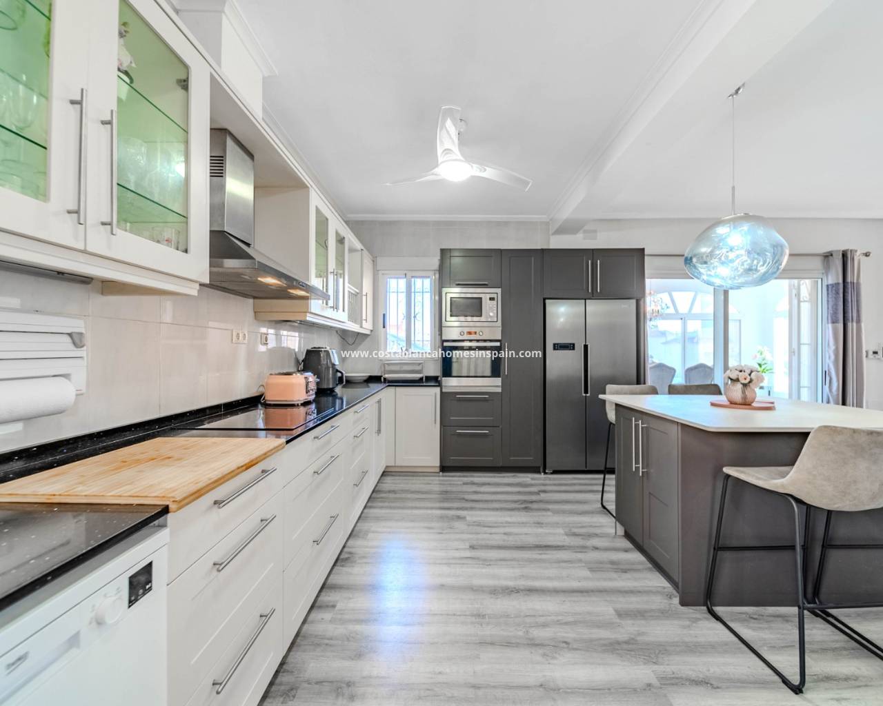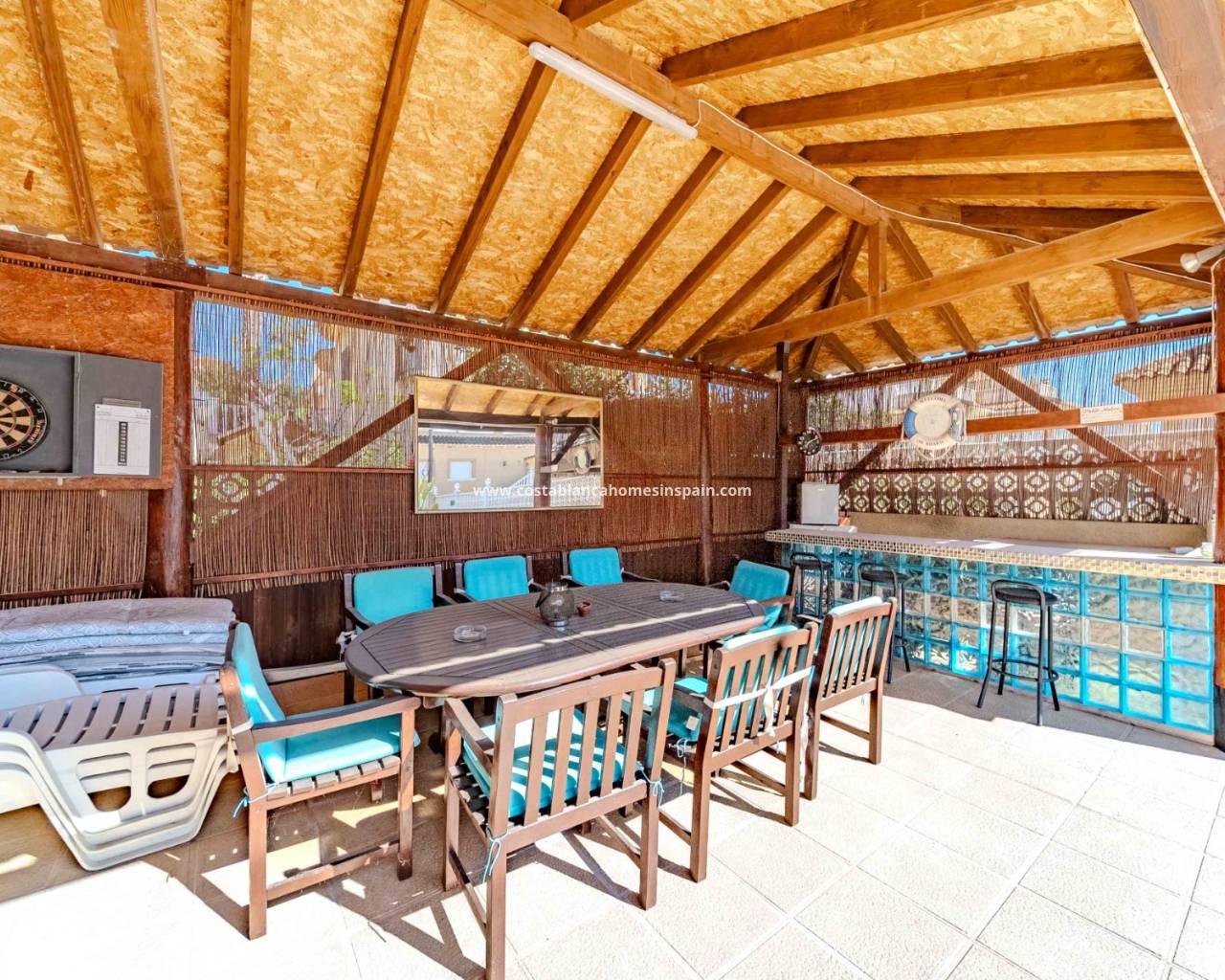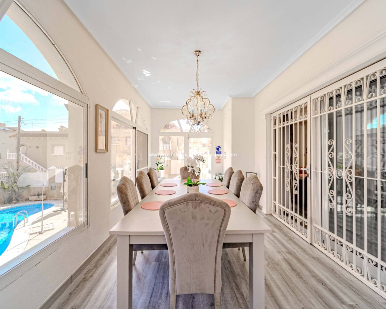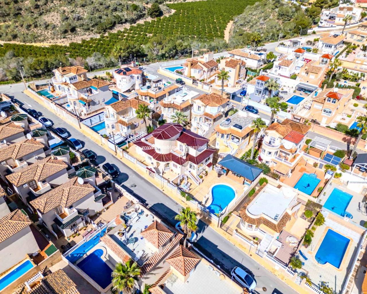 Stunning 6 bed 5.5 bath renovated detached villa in a quiet road of El Galan and just 10 minutes walk to numerous bars and restaurants. This beautiful villa has 3 double bedrooms 2 of which are en-suite plus a gorgeous renovated family bathroom with free standing tub and large power shower. Having large sunny terraces off the 2 main bedrooms, this property offers plenty of outside space both upstairs and in the well maintained garden. Fitted with oil filled central heating throughout plus lush carpeting on the stairs and upper level it provides that cosy feeling throughout the winter months. Energy saving hot and cold air conditioning units in every room plus ceiling fans. The whole villa has been professionally installed with reflective window tinting which allows you to appreciate the lovely pool views from the elevated dining room without letting the sun in, it also helps keep the house cool in the summer and warm in the winter. The large open plan living area has been tastefully decorated leading through to a newly fitted kitchen with island. Downstairs there is another double bedroom with en-suite and a further bedroom with wc currently used as a home office. From the kitchen there are french doors leading to the huge dining room and steps leading to the pool and garden area where you will find a lovely safe area for young children. The entertaining area is shaded with a separate bar and BBQ. From here you gain access to the 102 square metre underbuild with an additional 3 bedrooms, one of which is being used as a gym and 2 bathrooms. The lounge has been transformed to double as a smart screen cinema and has a separate kitchen area. From here there is access to the pretty back garden which is low maintenance. To the front of the villa there are double gates leading to a large garage and parking space for 2 cars. This lovingly cared for home has to be viewed to appreciate it's size and beauty.