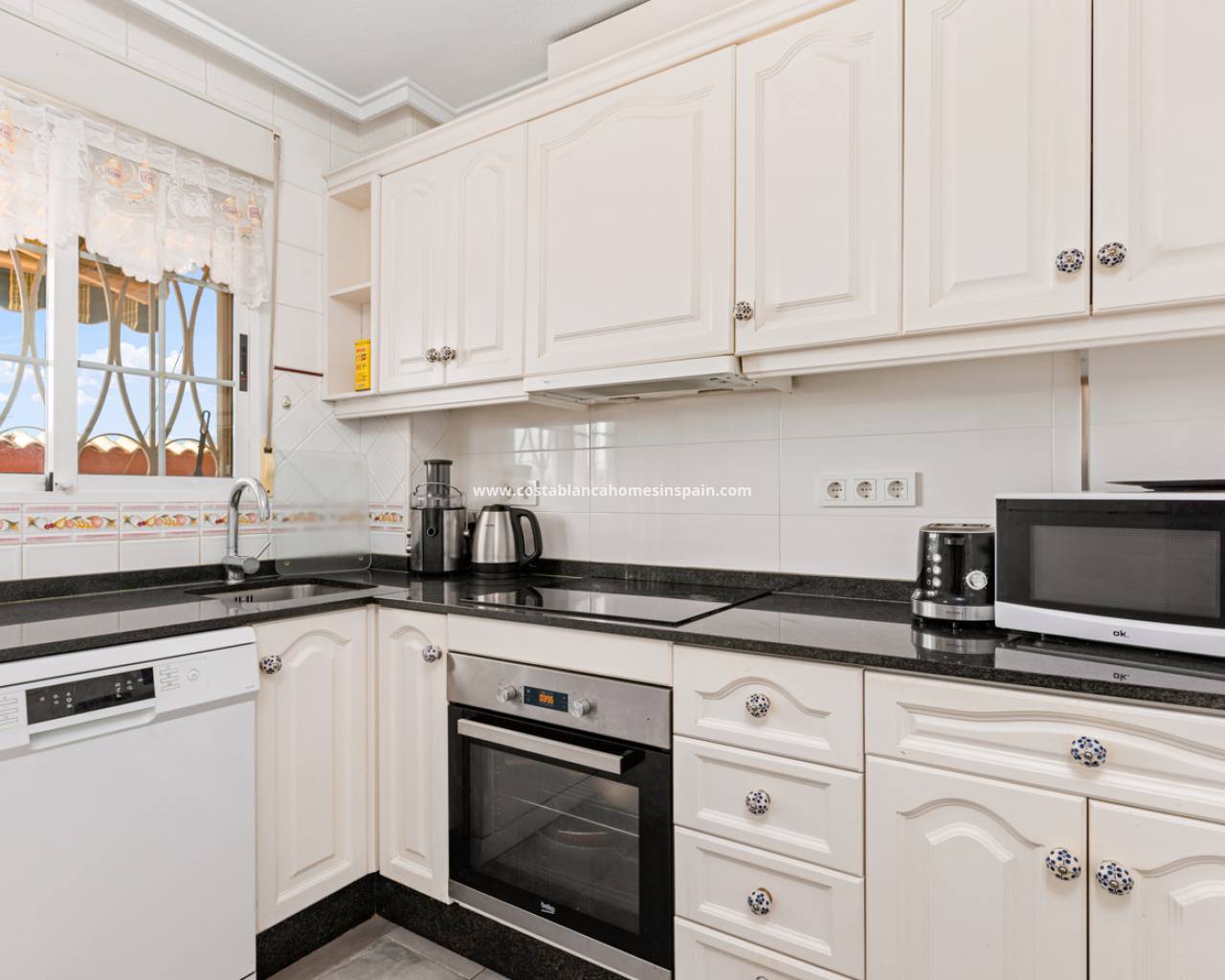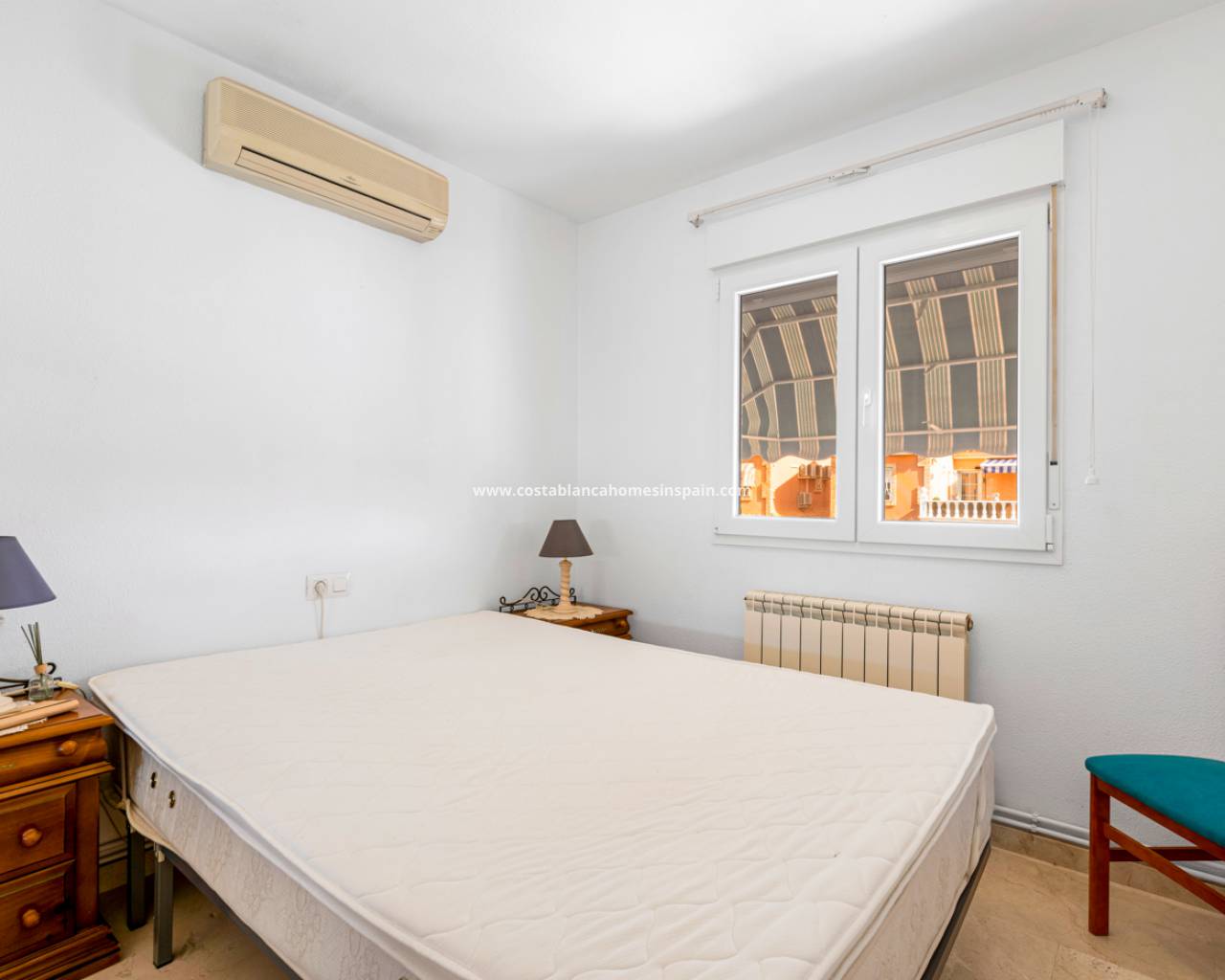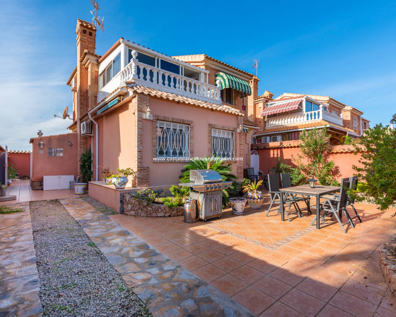 Playa Flamenca, Residencial Numancia, independent villa A house on two floors of 93 m2, the house has 3 bedrooms (one on the ground floor) and 2 bathrooms, independent kitchen with closed gallery, living room with fireplace, 2 terraces, driveway and a 20 m2 solarium. the house is sold fully furnished and equipped with air conditioning, a storage room, and a barbecue, the urbanization has a communal pool.
