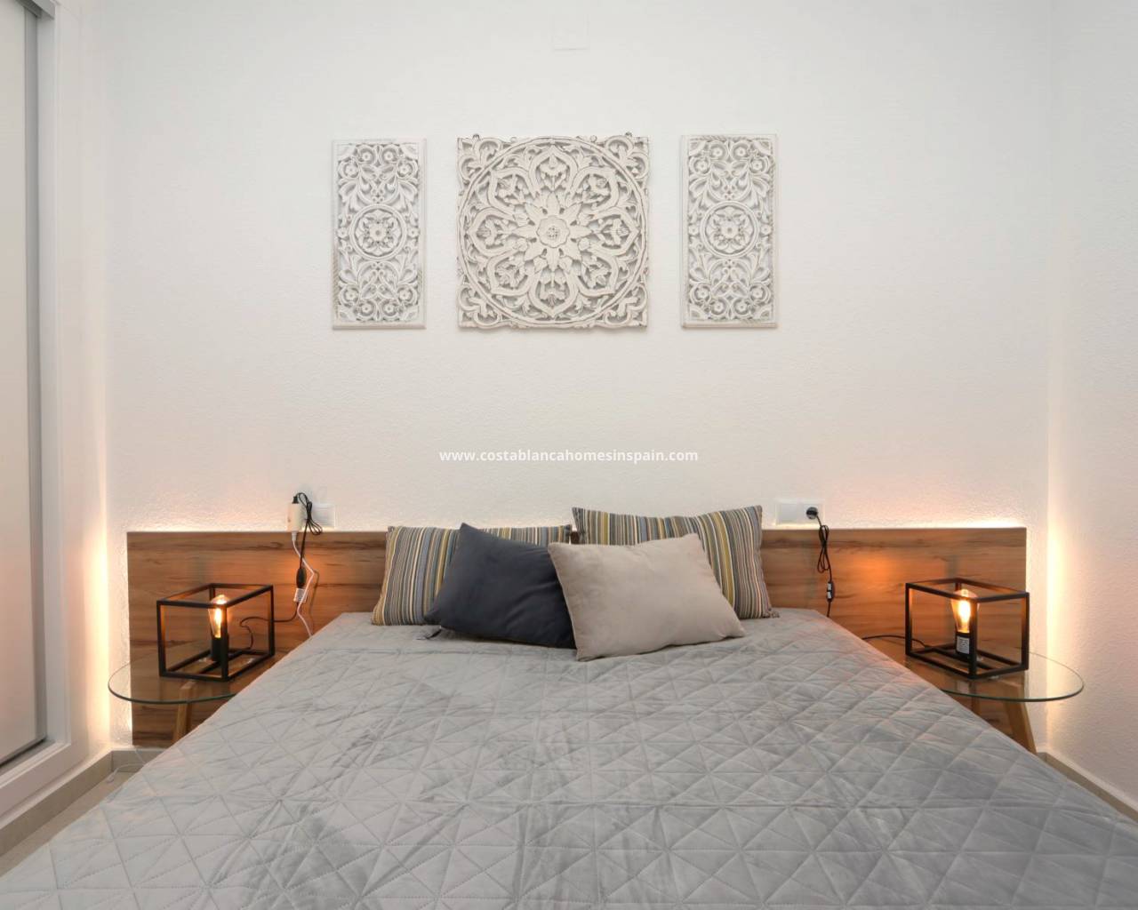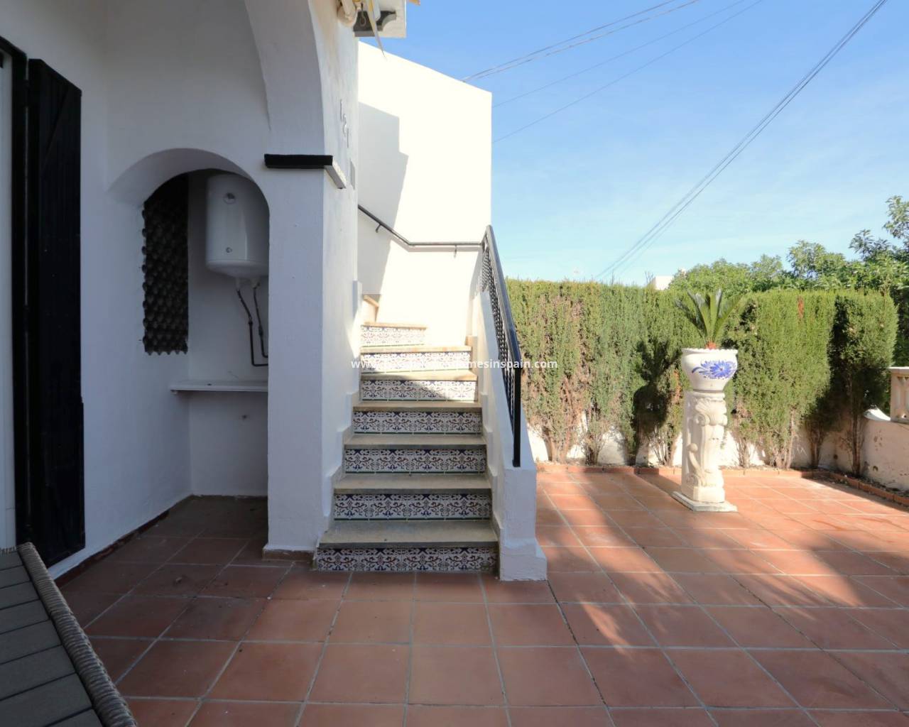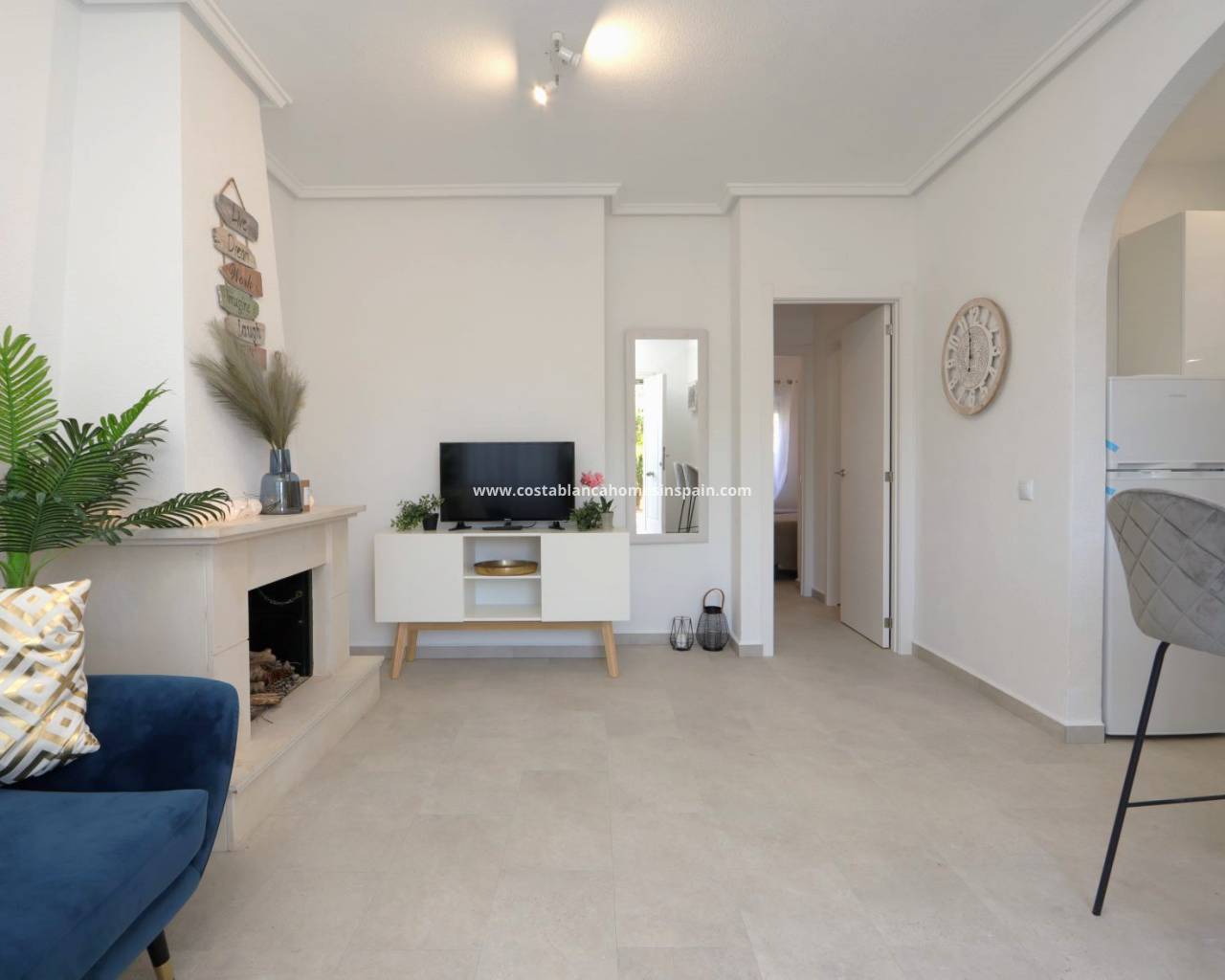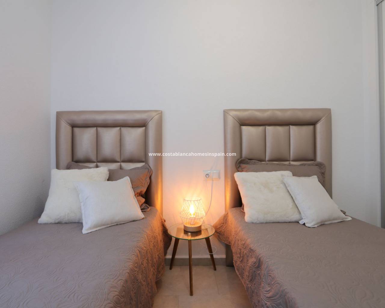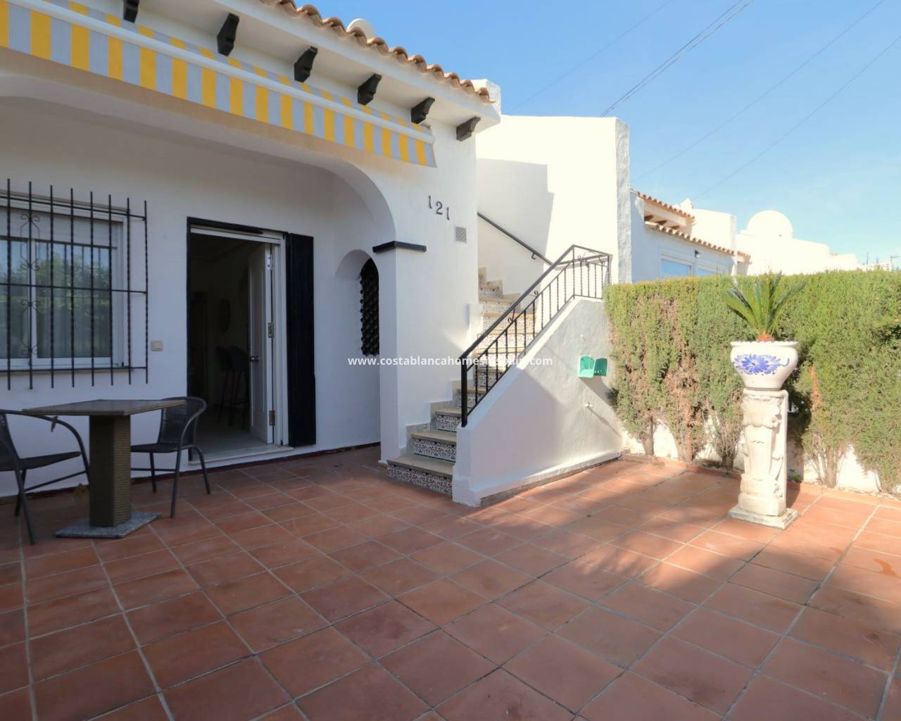 Terraced bungalow with front and back garden, private solarium just walking distance to La Fuente Center and Mercadona Supermarket. Entering the private garden in the front we have the access to the property. Light and airy living room and fully equipped new kitchen with floor and wall units, white goods are all new. The property has a new floor, a brand new kitchen, bathroom, windows, and wardrobes. There is a storage from the kitchen that gives place to the washing machine as well. Internal door dividing the living room from the 2 bedrooms and bathroom. The master bedroom has beautiful new furniture as well as the 2nd bedroom and built in wardrobes. The Master bedroom has access to the back terrace. The bathroom has a fresh and new style walk-in shower with a tempered glass shower screen, a new vanity unit with a modern mirror, and a toilet. From the front garden stairs leading up to the solarium.