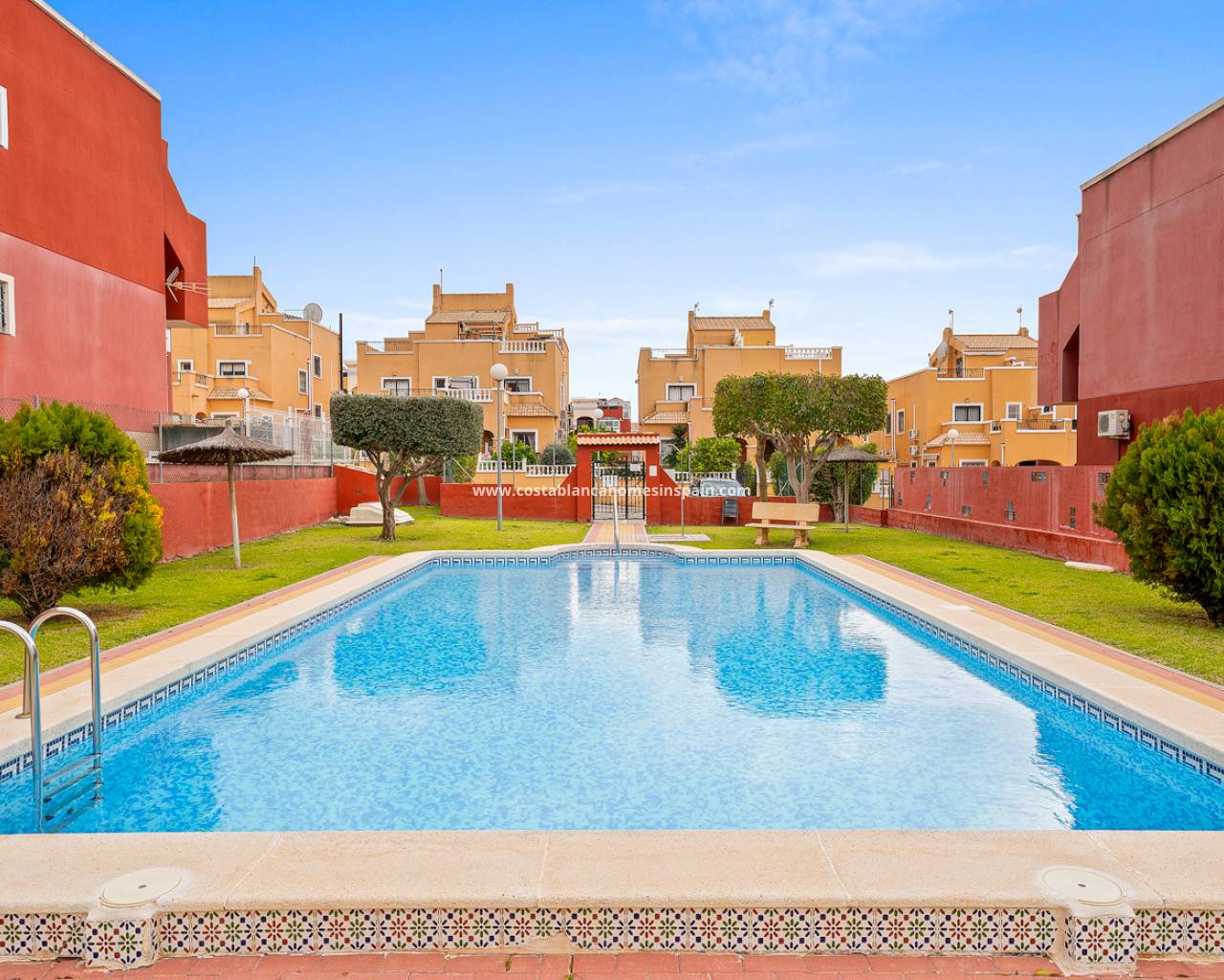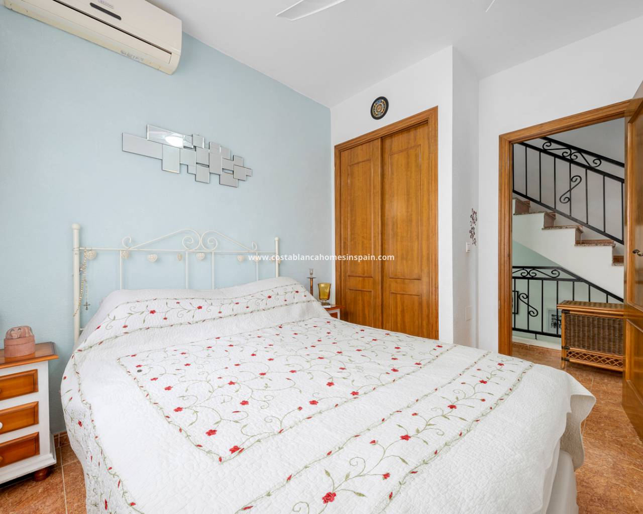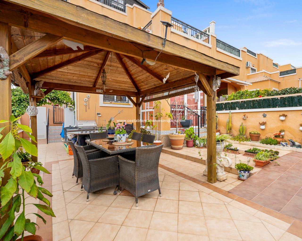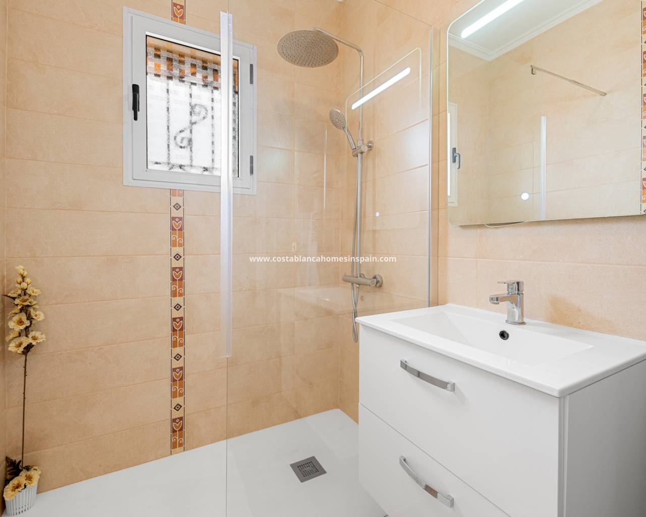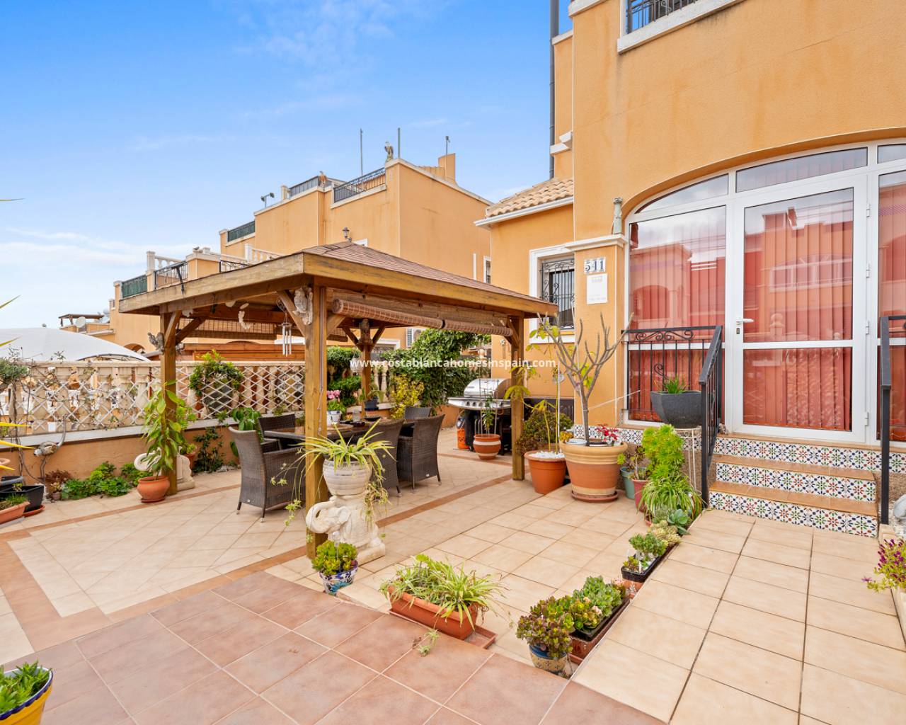 The house has 3 double bedrooms from which one has a large terrace, 2 bathrooms, a large lounge and dining area, a separate kitchen with the entrance to the garden, and a solarium with the sun all day long—this is a fantastic property. Outside you will enjoy a nice communal pool area.