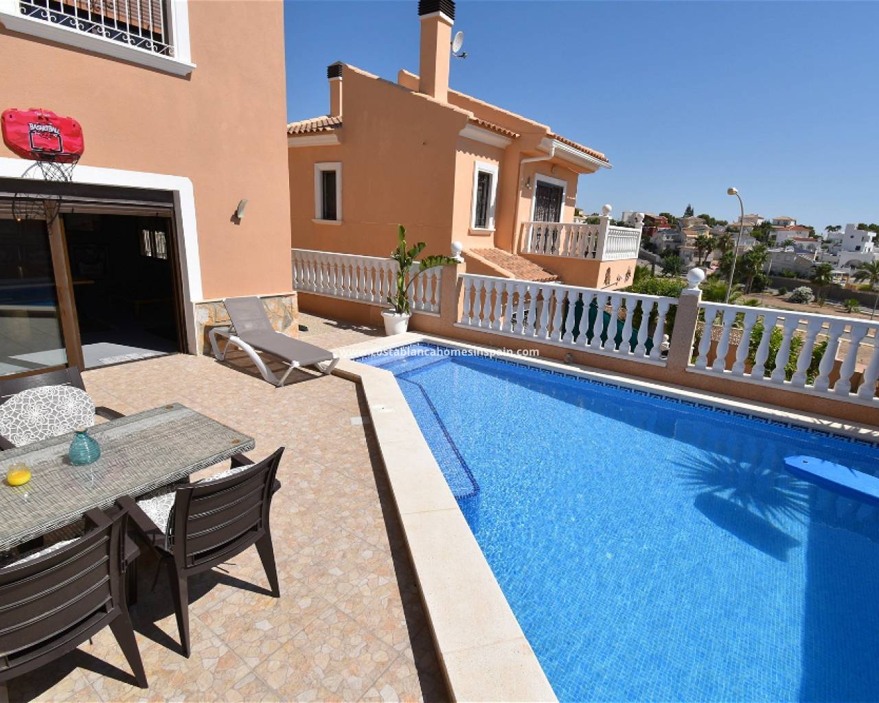 This well-presented 5 bedroom, 3 bathroom detached villa is situated within a residential area of Blue Lagoon, San Miguel de Salinas. The property is within the catchment of a few local and private schools, and within walking distance of a fabulous selection of amenities from restaurants, cafes, and shops. The Villamartin Plaza is located just 2.5km away, and the La Fuente Center which offers a vast variety of restaurants is just 2km away. The property is ideally located within a 10-minute drive to a selection of top golf courses and white sandy beaches.