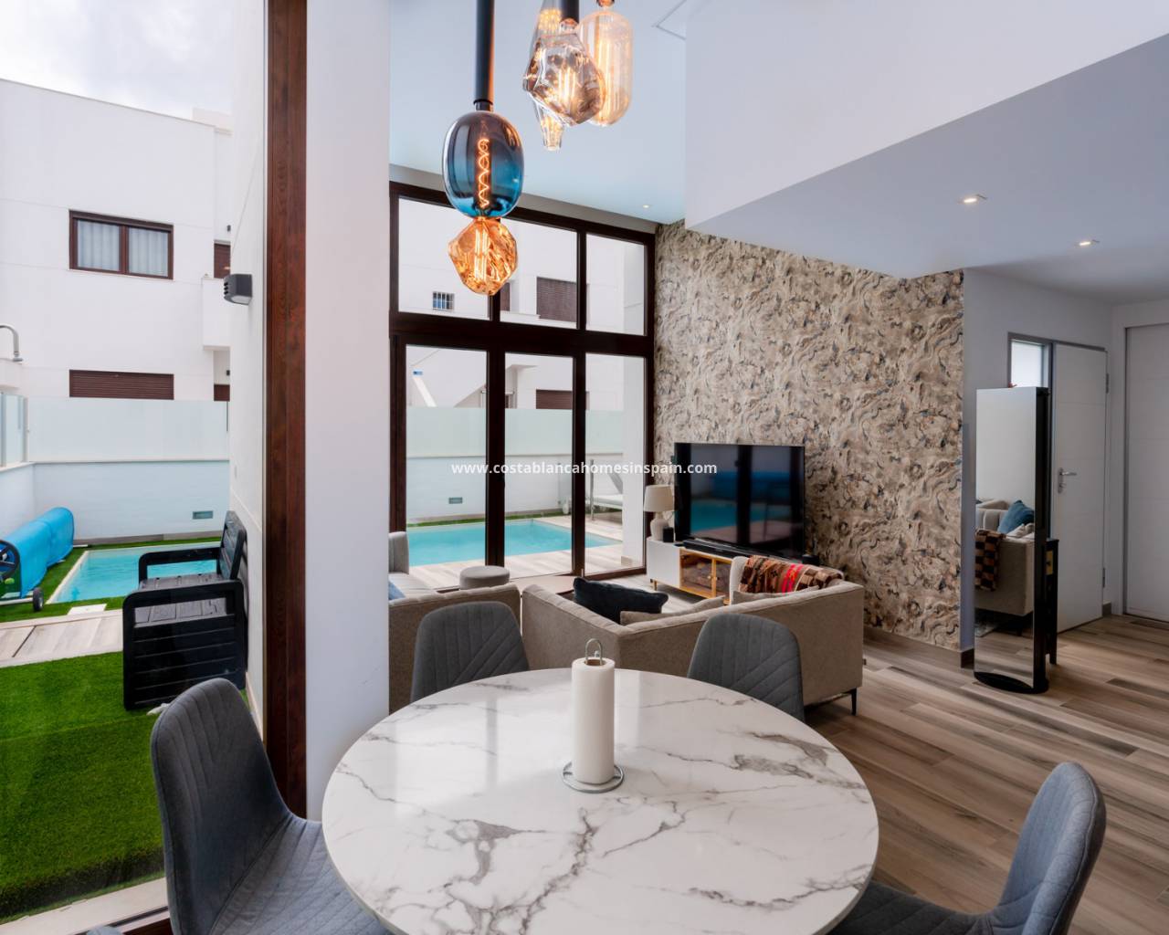 This fantastic villa is the perfect property to live all years round, but also for your long holidays. The propert has views to the Pink Lakes of Torrevieja and to the sea, surrounded by Nature and services. The community has a large community pool, but also the property has a private swimming pool. The lounge is very bright with large windows and pool view, and the kitchen is open to the lounge, modern scandinavian style.On the ground floor you can find a large bedroom and an ensuite bathroom, and another bathroom to give suport for the lounge. There is a direct access to the garage by inside, at the moment is beeing used as a games room and cinema area, but you can use it to park the car. If you go to the first floor you will 2 more large bedrooms and another bathroom. Large terraces and solarium make part also of this property, important when you live in Spain.