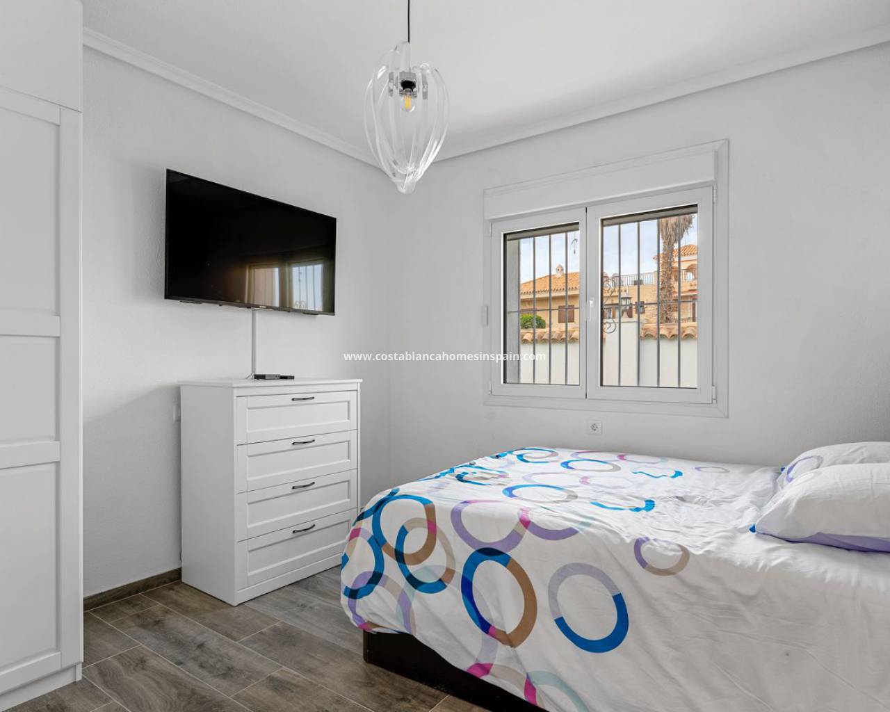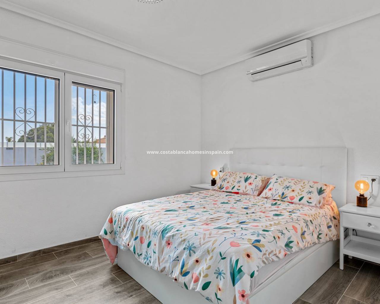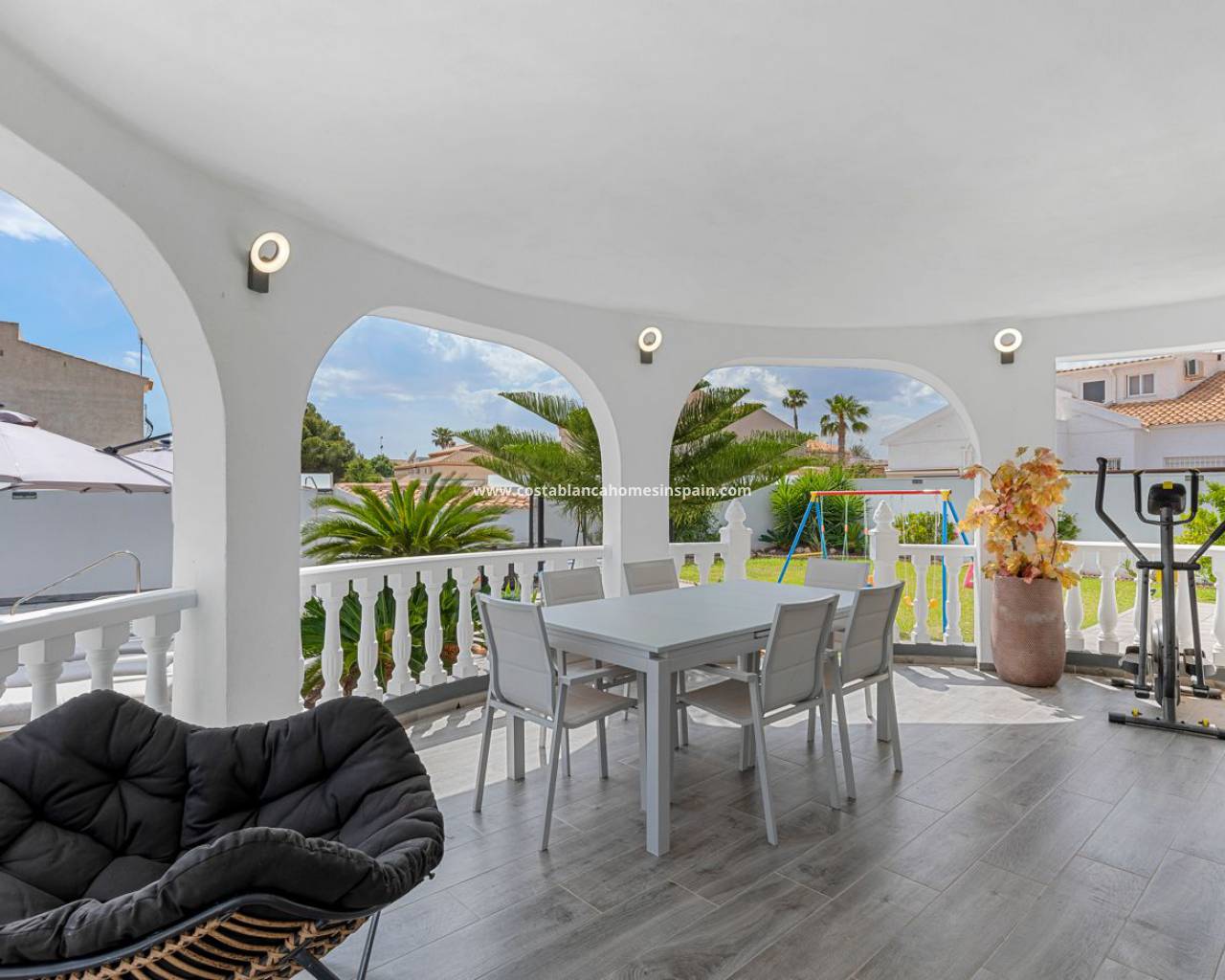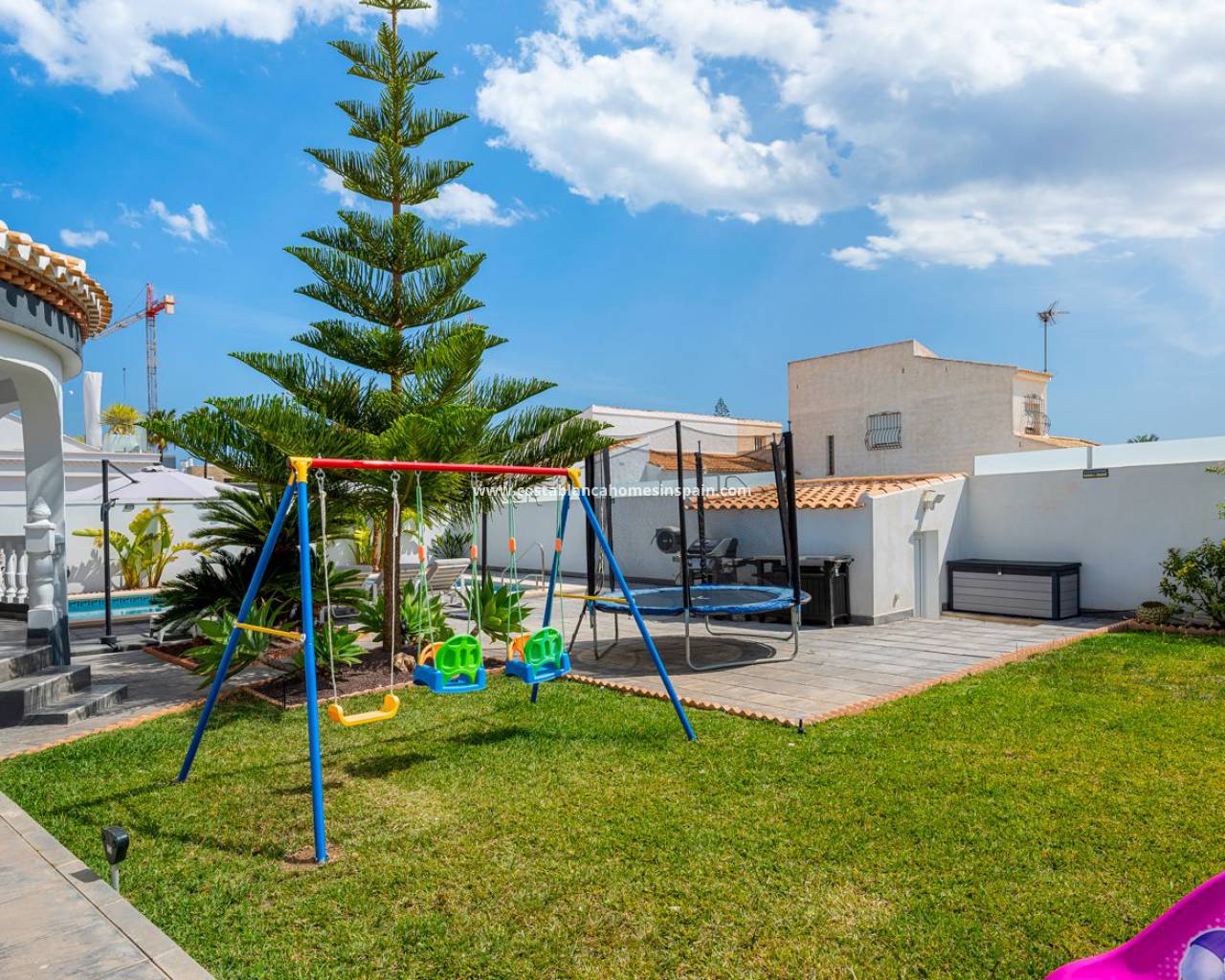 This fantastic property is located in the famous area of Playa Flamenca, just a few minutes walk from the Shopping center Zenia Boulevard and the beach, and Just a short walk to the market street. The property has high private walls with access via the electric gate for your private parking. The sunny large garden has fruit trees and natural grass, palm trees, and Estrilizias, easy to maintain but giving a romantic environment all year round. There is a large private pool (4m x 8m) on the sunny side of the property and a relaxing area with sun beds and chairs. The property's entrance is south, along with its terrace where you can enjoy al fresco evenings and afternoons, and the perfect breakfast place. Passing the front door, you will find yourself in the large lounge with a modern refurbished kitchen fully equipped with high-quality white goods. From the lounge large corridor leads you into the sleeping area, where you have 3 double bedrooms, 1 bathroom, and an ensuite bathroom in the master bedroom at the end. There utility room gives space for the modern boiler and to store every extra you might have for the kitchen and cleaning. The property has underfloor heating everywhere, divided into sections, and air conditioning in every room. The materials used in the building are of very high quality and the house all external walls have been made double thickness for extra insolation. All windows and doors changed for high quality double glased ones with electric blinds. The layout of this property is perfect for a small family to live all year round or for their holidays. The location is perfect, and the orientation invites you to stay in the sun daily.
