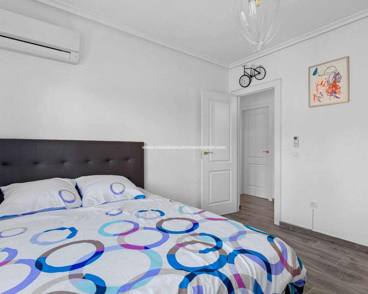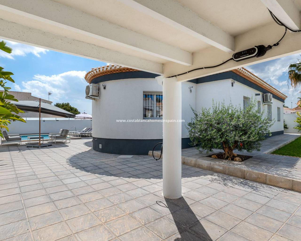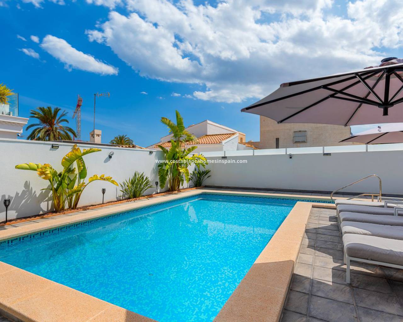 This fantastic property is located in the famous area of Playa Flamenca, just a few minutes walk from the Shopping center Zenia Boulevard and the beach, and Just a short walk to the market street. The property has high private walls with access via the electric gate for your private parking. The sunny large garden has fruit trees and natural grass, palm trees, and Estrilizias, easy to maintain but giving a romantic environment all year round. There is a large private pool (4m x 8m) on the sunny side of the property and a relaxing area with sun beds and chairs. The property's entrance is south, along with its terrace where you can enjoy al fresco evenings and afternoons, and the perfect breakfast place. Passing the front door, you will find yourself in the large lounge with a modern refurbished kitchen fully equipped with high-quality white goods. From the lounge large corridor leads you into the sleeping area, where you have 3 double bedrooms, 1 bathroom, and an ensuite bathroom in the master bedroom at the end. There utility room gives space for the modern boiler and to store every extra you might have for the kitchen and cleaning. The property has underfloor heating everywhere, divided into sections, and air conditioning in every room. The materials used in the building are of very high quality and the house all external walls have been made double thickness for extra insolation. All windows and doors changed for high quality double glased ones with electric blinds. The layout of this property is perfect for a small family to live all year round or for their holidays. The location is perfect, and the orientation invites you to stay in the sun daily.